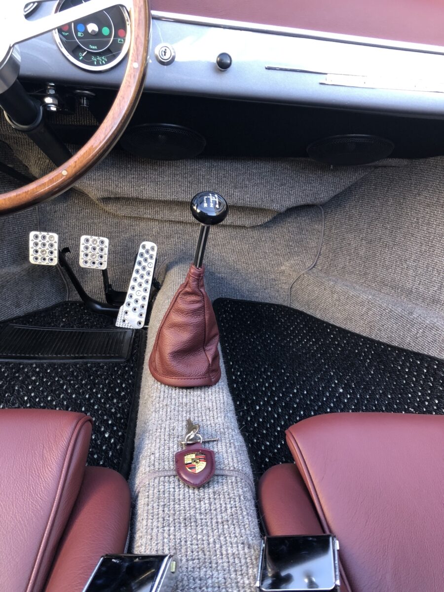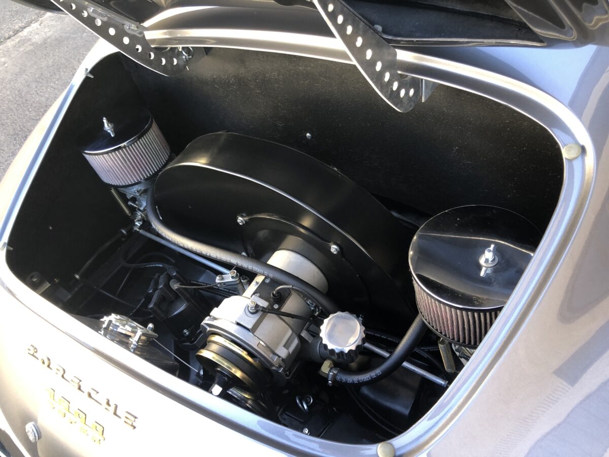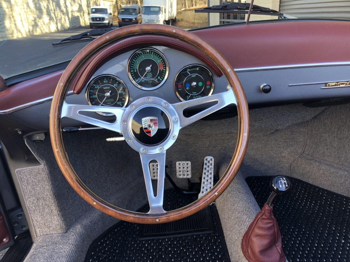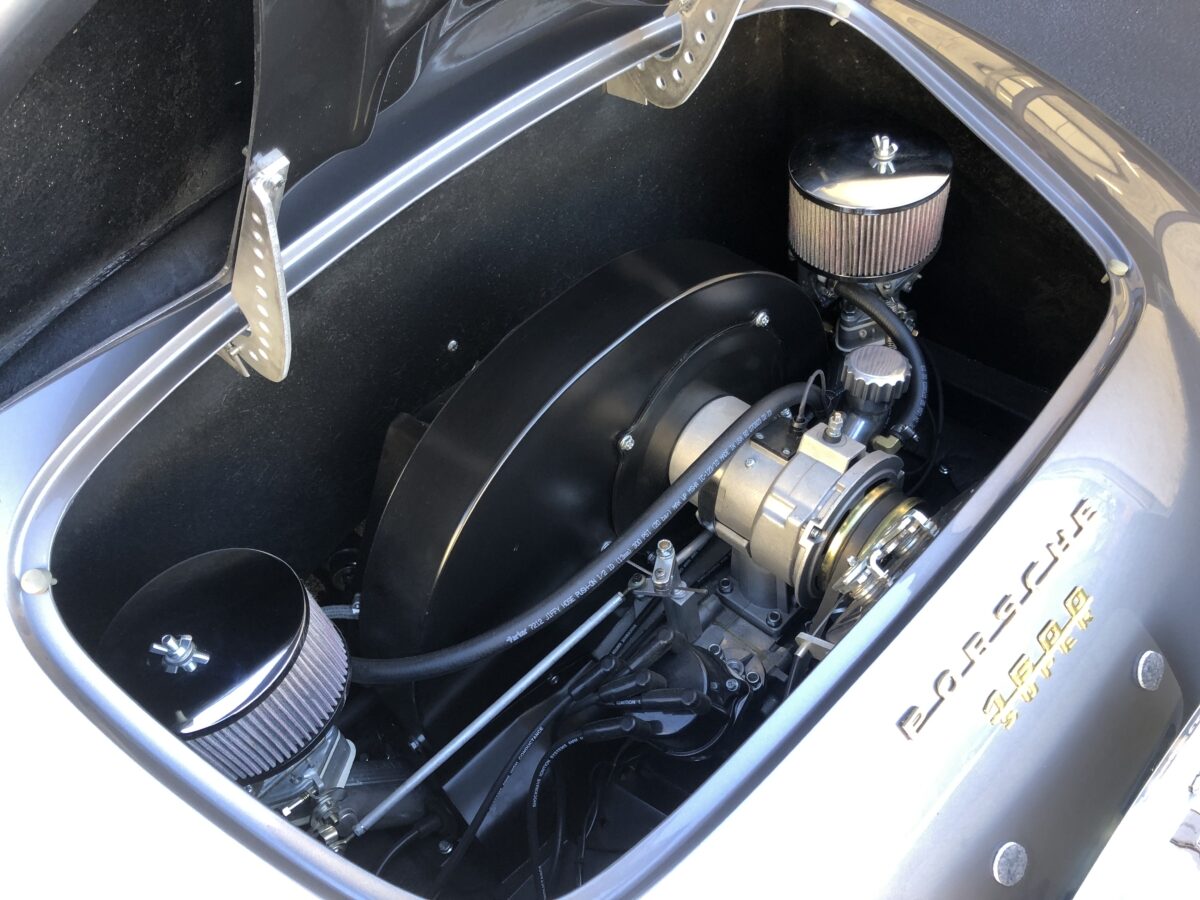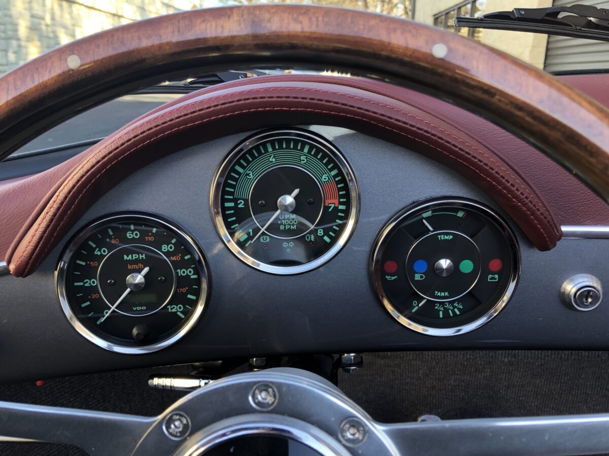 Complementing the gorgeous Seal Gray Metallic exterior is a luscious Medium Red Leather interior with Light Gray German Square Weave carpeting. The colors really accentuate the beauty of this car and looks even better in person than it shows in the pics. The Speedster seats are very comfortable. Door panels have our custom door pockets with document compartment, the polished door pulls. Matching dash pad and passenger side grab handle. Period correct VDO gauges with a GPS Speedometer and digital odometer allow the driver to monitor the speed and performance of this air cooled Speedster. Beautiful Wood Grain steering wheel with a Porsche horn button and vintage style turn signal lever adds to the authenticity. The e-brake was mounted under the dash like the originals. The original owner added a custom, out of sight, bluetooth stereo unit with professionally mounted speakers under the dash that sounds amazing. This 356 is also optioned with heated seats , and a Vintage Speed Shifter for a crisp, short throw pattern for your driving pleasure. Shelf pad behind the front seats. Custom set of Coco mats have been added for that finishing touch. Simply gorgeous interior!!!