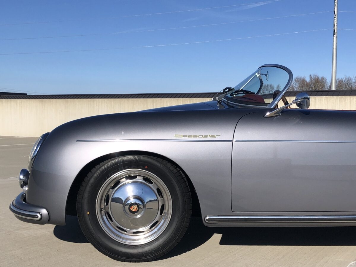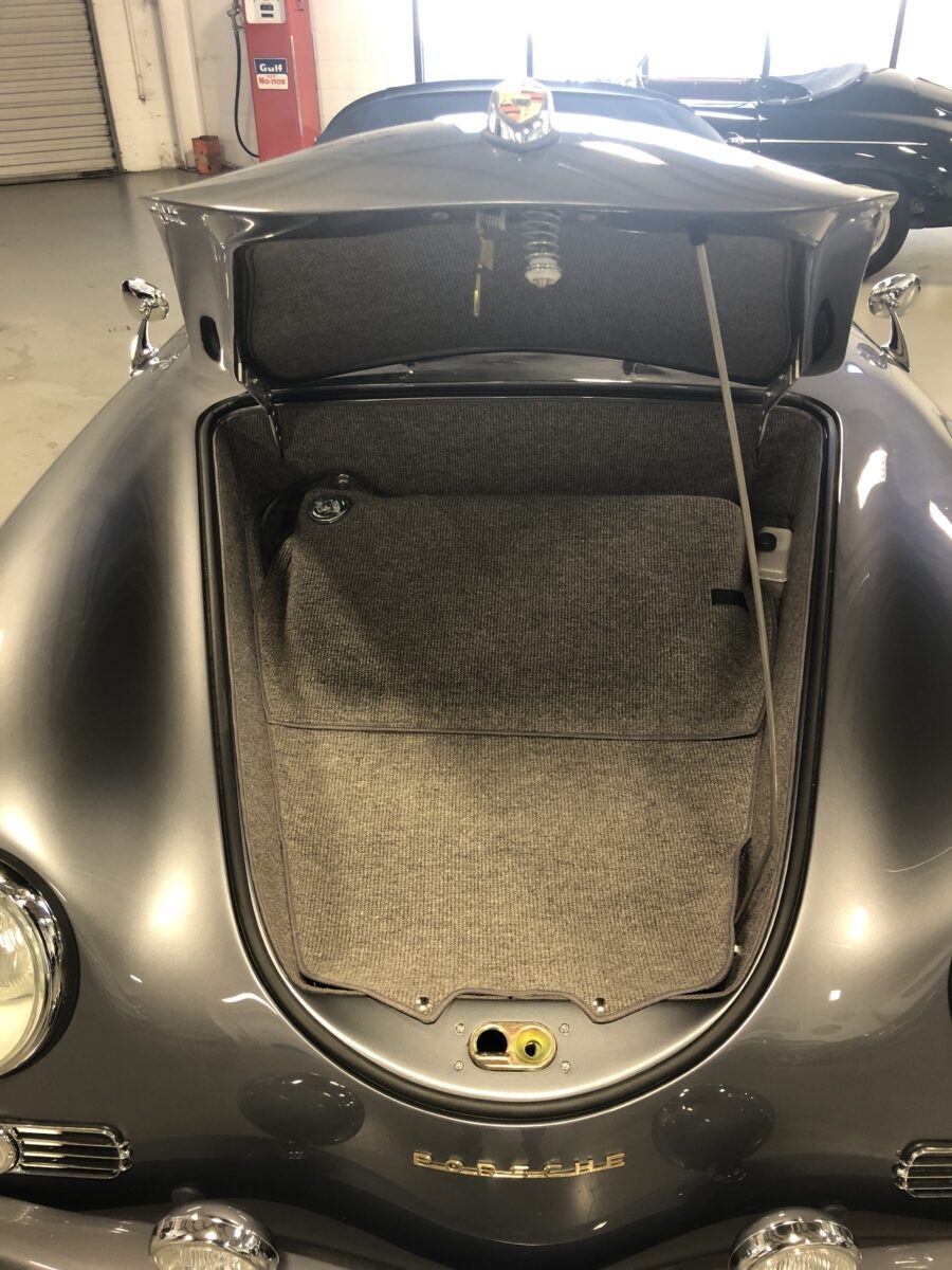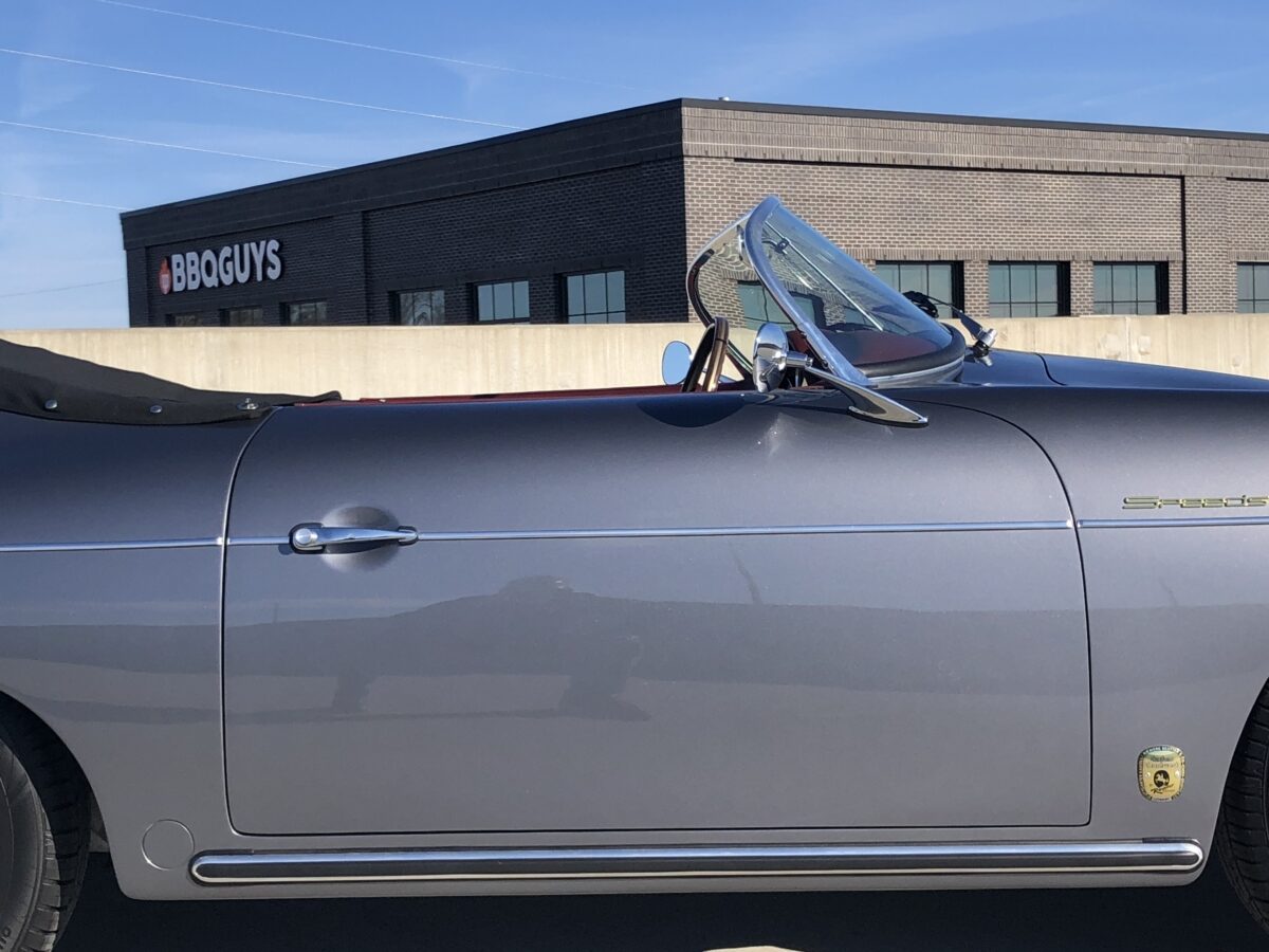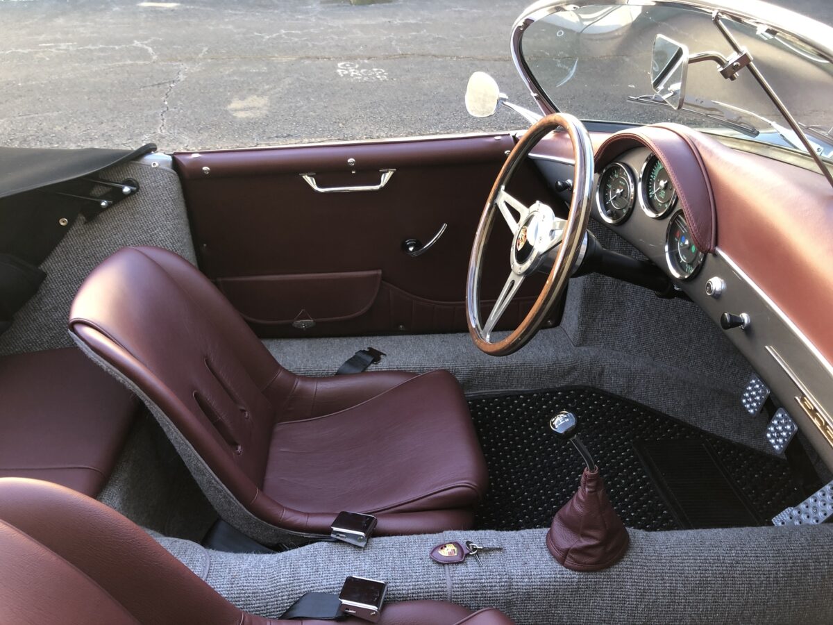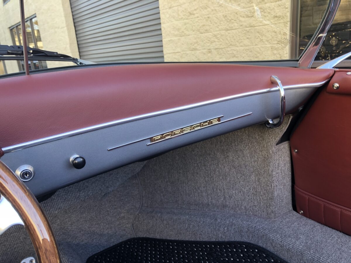 Complementing the gorgeous Seal Gray Metallic exterior is a luscious Medium Red Leather interior with Light Gray German Square Weave carpeting. The colors really accentuate the beauty of this car and looks even better in person than it shows in the pics. The Speedster seats are very comfortable. Door panels have our custom door pockets with document compartment, the polished door pulls. Matching dash pad and passenger side grab handle. Period correct VDO gauges with a GPS Speedometer and digital odometer allow the driver to monitor the speed and performance of this air cooled Speedster. Beautiful Wood Grain steering wheel with a Porsche horn button and vintage style turn signal lever adds to the authenticity. The e-brake was mounted under the dash like the originals. The original owner added a custom, out of sight, bluetooth stereo unit with professionally mounted speakers under the dash that sounds amazing. This 356 is also optioned with heated seats , and a Vintage Speed Shifter for a crisp, short throw pattern for your driving pleasure. Shelf pad behind the front seats. Custom set of Coco mats have been added for that finishing touch. Simply gorgeous interior!!!
