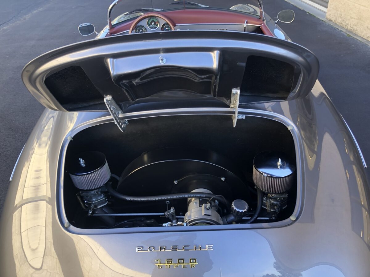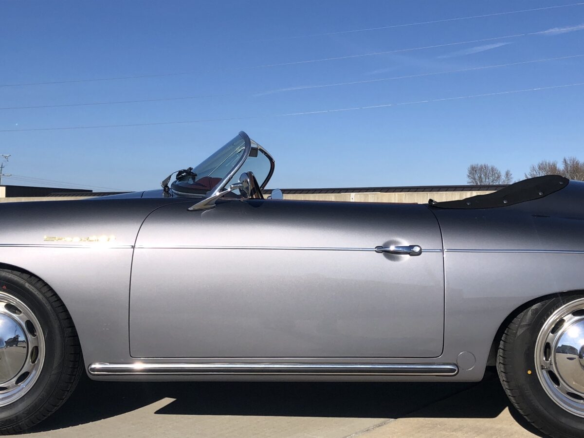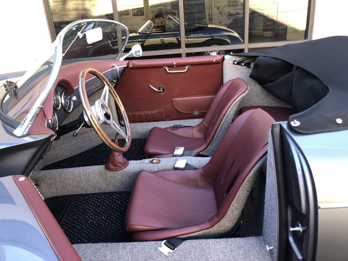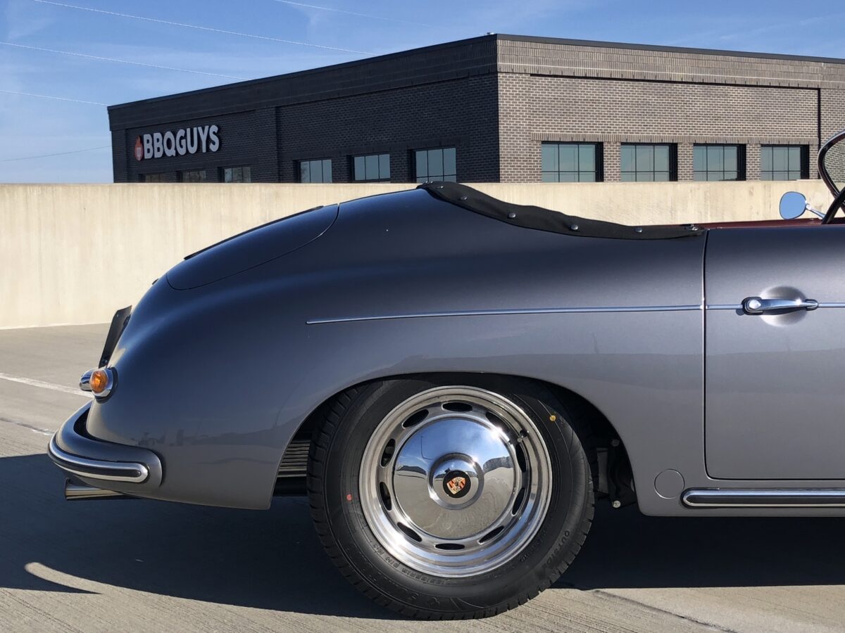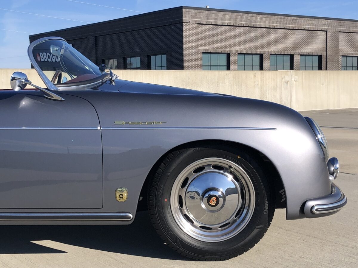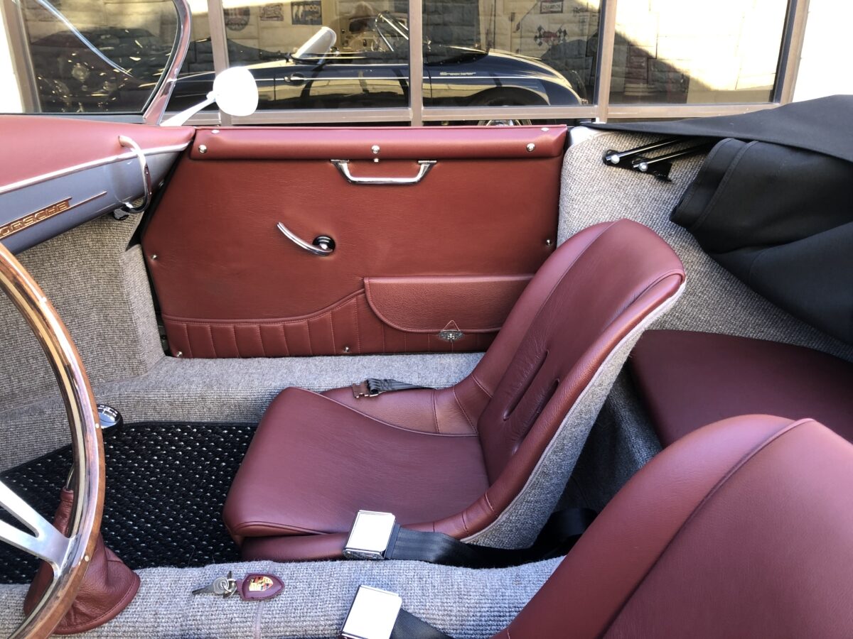 Complementing the gorgeous Seal Gray Metallic exterior is a luscious Medium Red Leather interior with Light Gray German Square Weave carpeting. The colors really accentuate the beauty of this car and looks even better in person than it shows in the pics. The Speedster seats are very comfortable. Door panels have our custom door pockets with document compartment, the polished door pulls. Matching dash pad and passenger side grab handle. Period correct VDO gauges with a GPS Speedometer and digital odometer allow the driver to monitor the speed and performance of this air cooled Speedster. Beautiful Wood Grain steering wheel with a Porsche horn button and vintage style turn signal lever adds to the authenticity. The e-brake was mounted under the dash like the originals. The original owner added a custom, out of sight, bluetooth stereo unit with professionally mounted speakers under the dash that sounds amazing. This 356 is also optioned with heated seats , and a Vintage Speed Shifter for a crisp, short throw pattern for your driving pleasure. Shelf pad behind the front seats. Custom set of Coco mats have been added for that finishing touch. Simply gorgeous interior!!!