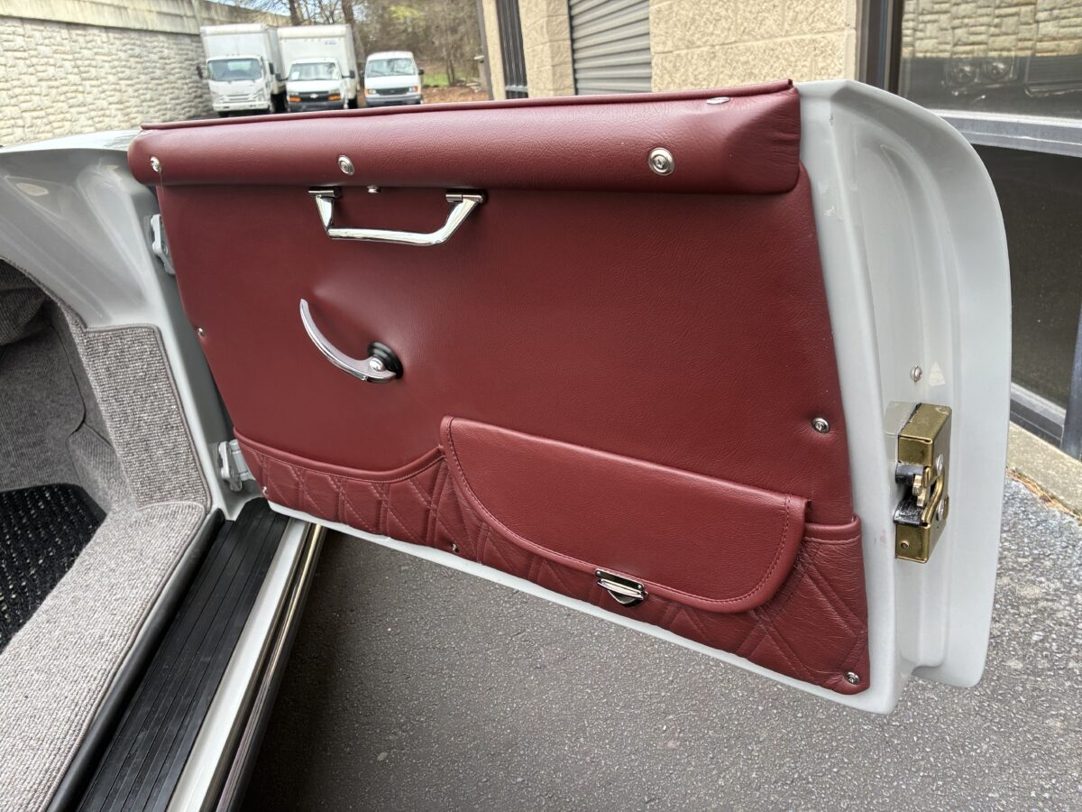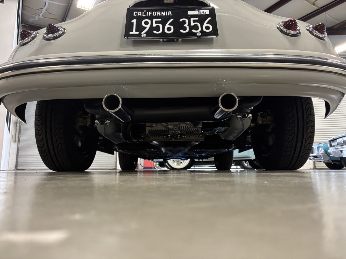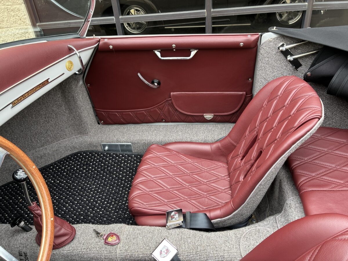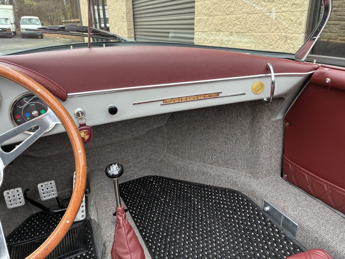 Complementing the awesome chalk gray exterior is an equally stunning Medium Red Leather interior with Double Diamond Stitch on the seats and lower door panels.. The Speedster seats are very comfortable. Door panels are beautifully customized with closing document pockets and polished door pulls. Great German Square weave carpeting adorns throughout and really provides a great contrast to the Medium Red leather. Matching dash pad and passenger side grab handle. Parking brake mounted under the dash much like the originals adding more authenticity to the build. Period correct VDO gauges with a GPS Speedometer and digital odometer allow the driver to monitor the speed and performance of this air cooled Speedster. Beautiful Wood Grain steering wheel with a Porsche horn button and vintage style turn signal lever adds to the authenticity. This 356 is also optioned with the traditional heater boxes as well as defroster. You will notice the knob on the shifter tunnel that opens up the heater boxes and the sling vents that open along the rocker rails. Porsche dash emblem and commemorative badge neatly mounted. Vintage Speed Shifter for a crisp, short throw pattern for your driving pleasure. Shelf pad behind the front seats. Custom set of Coco mats have been added for that finishing touch. Simply gorgeous interior!!!