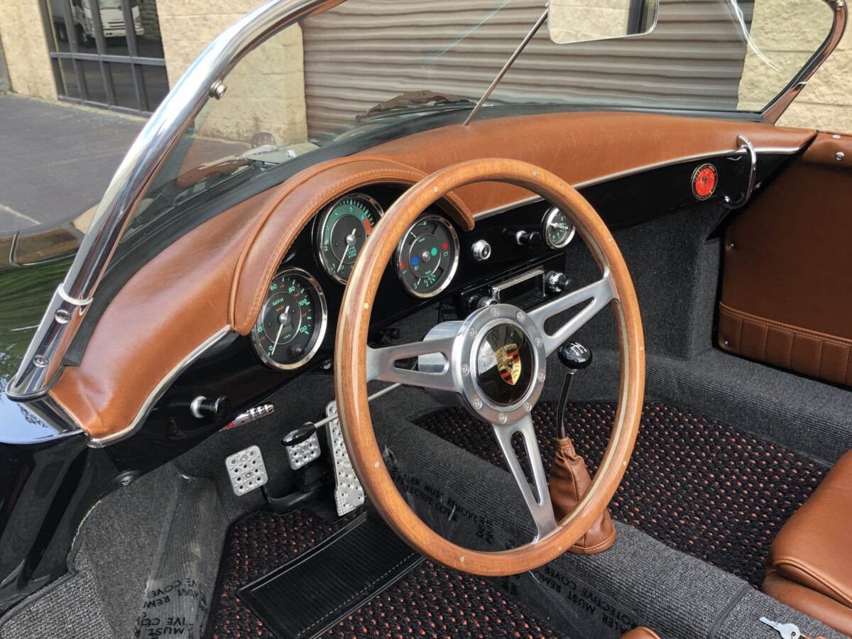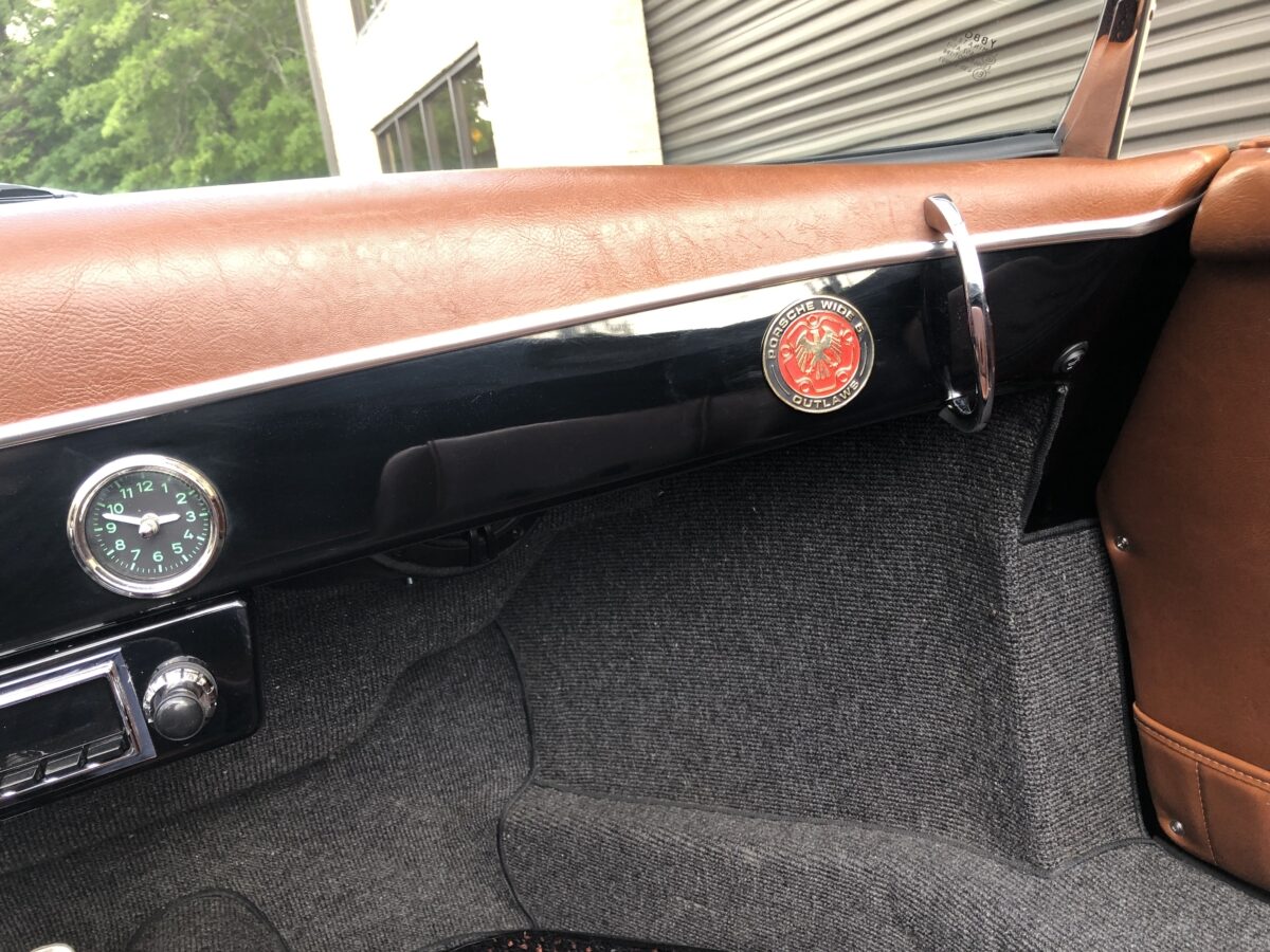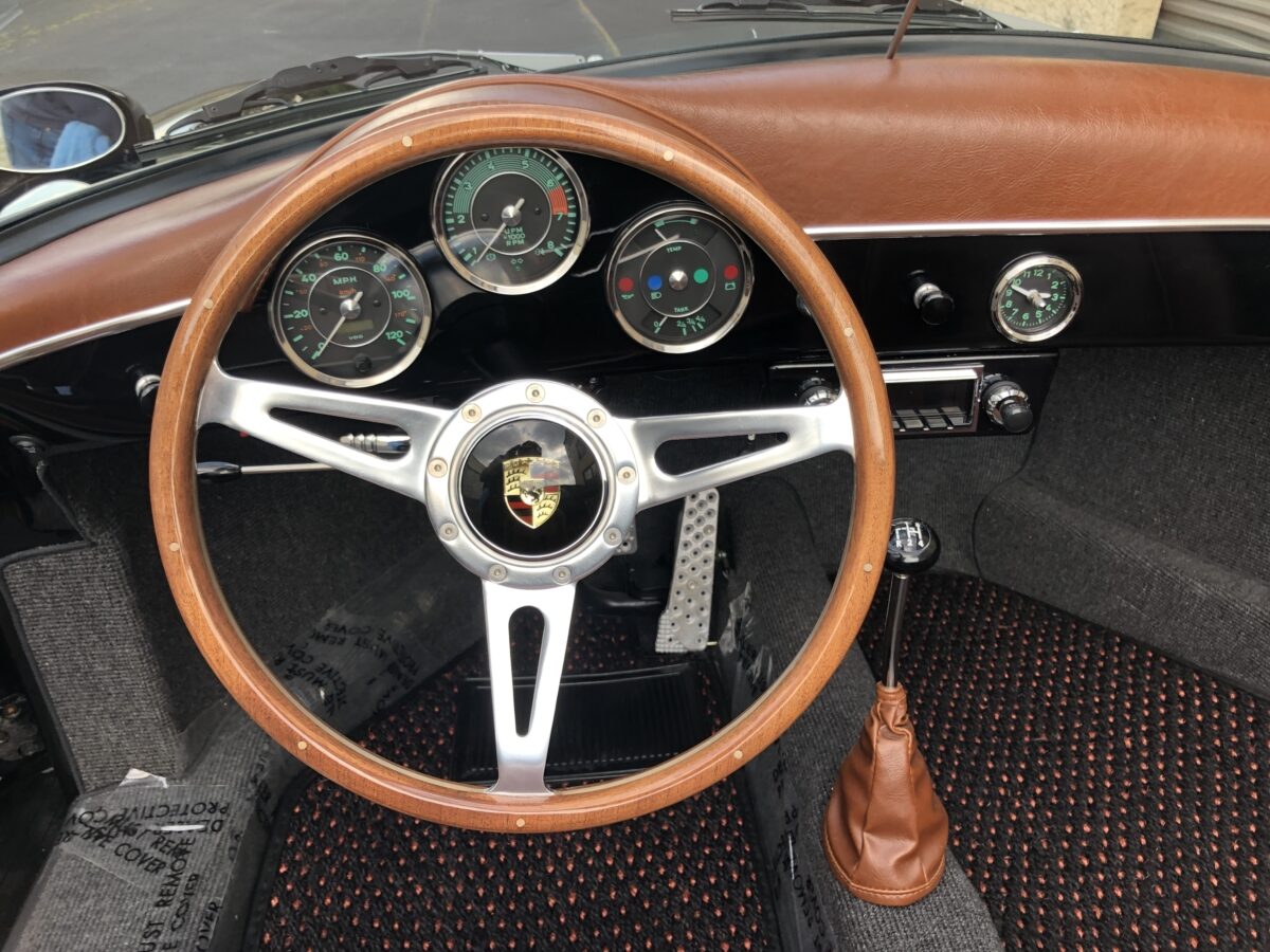 Complementing the gorgeous gloss black exterior is an equally stunning Baseball Glove interior accented with black German Square Weave carpeting. The colors really accentuate the beauty of this car. The Speedster seats are very comfortable. The custom Cloud 9 Style door pockets with locking document pocket. Matching dash pad and passenger side grab handle. Period correct VDO gauges with a GPS Speedometer and digital odometer allow the driver to monitor the speed and performance of this air cooled Speedster. Beautiful Wood Grain steering wheel with a Porsche horn button and vintage style turn signal lever adds to the authenticity. Working dash clock and cool Outlaw Wide 5 Medallion mounted on the dash. The e-brake was mounted under the dash like the originals. Retrosound Bluetooth stereo system looks vintage but allows you to use your phone hands free and play your music off your phone. This 356 is also optioned with heated seats, aluminum race pedals, and a Vintage Speed Shifter for a crisp, short throw pattern for your driving pleasure. Custom set of Coco mats added for that finishing touch. Simply gorgeous interior!!!