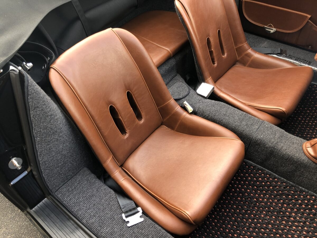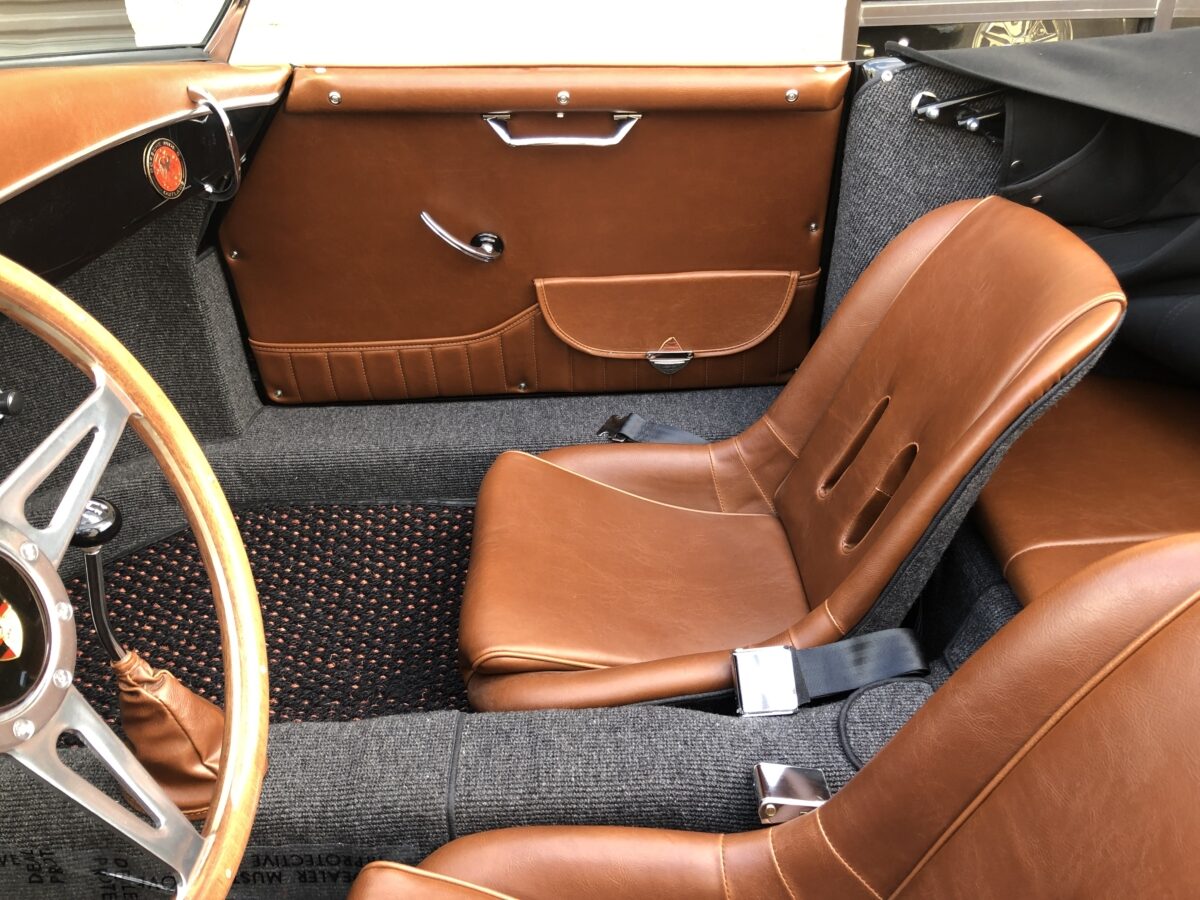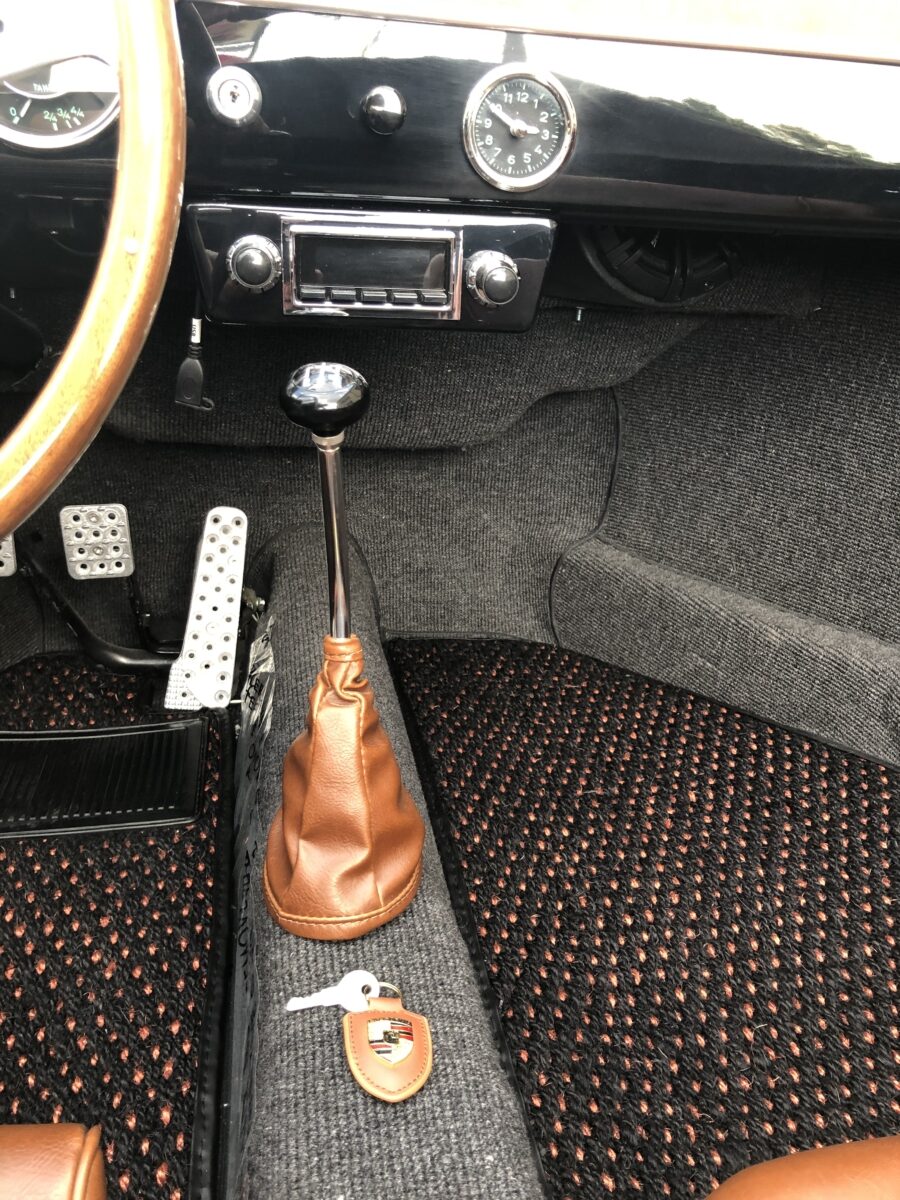 Complementing the gorgeous gloss black exterior is an equally stunning Baseball Glove interior accented with black German Square Weave carpeting. The colors really accentuate the beauty of this car. The Speedster seats are very comfortable. The custom Cloud 9 Style door pockets with locking document pocket. Matching dash pad and passenger side grab handle. Period correct VDO gauges with a GPS Speedometer and digital odometer allow the driver to monitor the speed and performance of this air cooled Speedster. Beautiful Wood Grain steering wheel with a Porsche horn button and vintage style turn signal lever adds to the authenticity. Working dash clock and cool Outlaw Wide 5 Medallion mounted on the dash. The e-brake was mounted under the dash like the originals. Retrosound Bluetooth stereo system looks vintage but allows you to use your phone hands free and play your music off your phone. This 356 is also optioned with heated seats, aluminum race pedals, and a Vintage Speed Shifter for a crisp, short throw pattern for your driving pleasure. Custom set of Coco mats added for that finishing touch. Simply gorgeous interior!!!