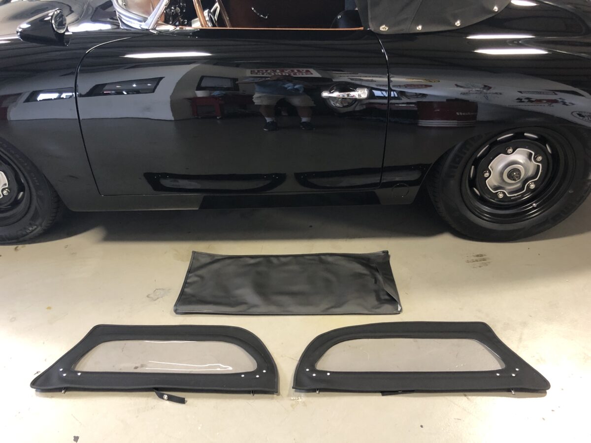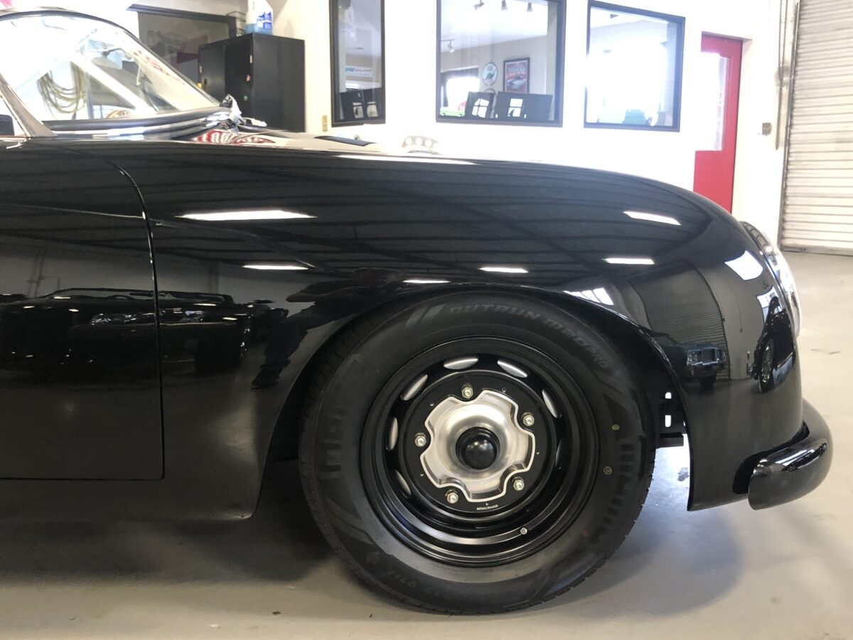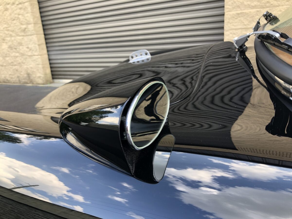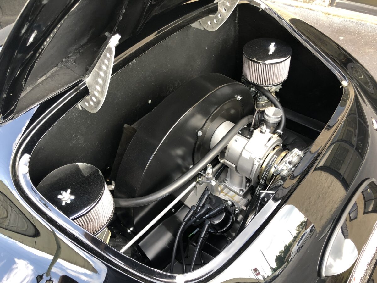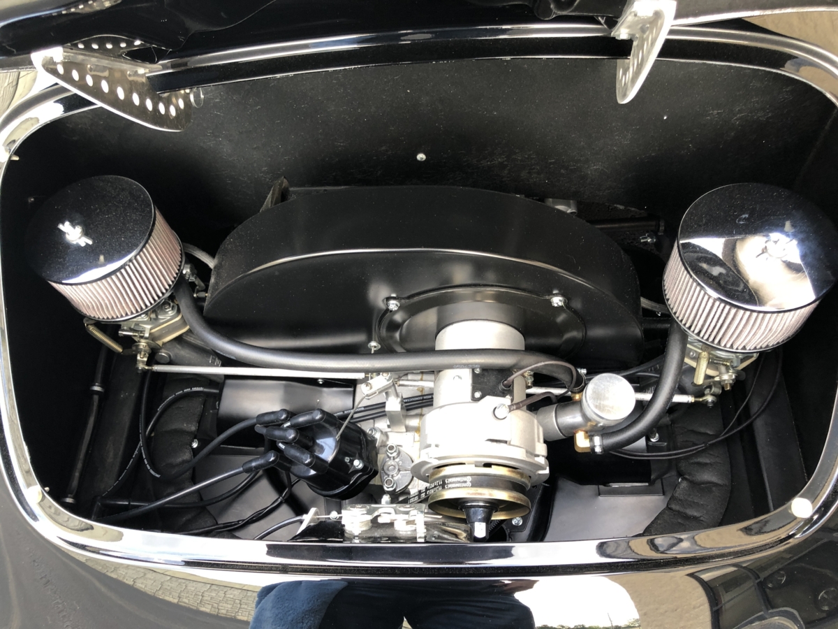 This particular build was done in Gloss Black which was an iconic original 356 color and it is absolutely stunning. The fit and finish most likely exceeds the original. As you will see, this one was built with some very cool features with a bit of an Outlaw styling cue. Body side molding and bumper trim were eliminated for a sleek look. Spyder shine down license plate light, Spyder side view mirror mounted on the fender, Vintage 190 Wheels powder coated in black with drum skins, GT Louvered engine lid, and a Porsche badge on the front trunk With just under 165 miles the paint and body are essentially flawless. I always recommend driving these cars top down but of course it also has a black soft top with window inserts and a black boot cover when the top is down for a clean, sophisticated look. As you will see this Gloss Black beauty has an awesome stance and will attract all the attention you can handle.