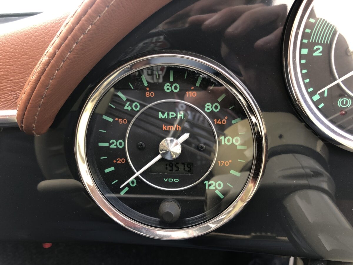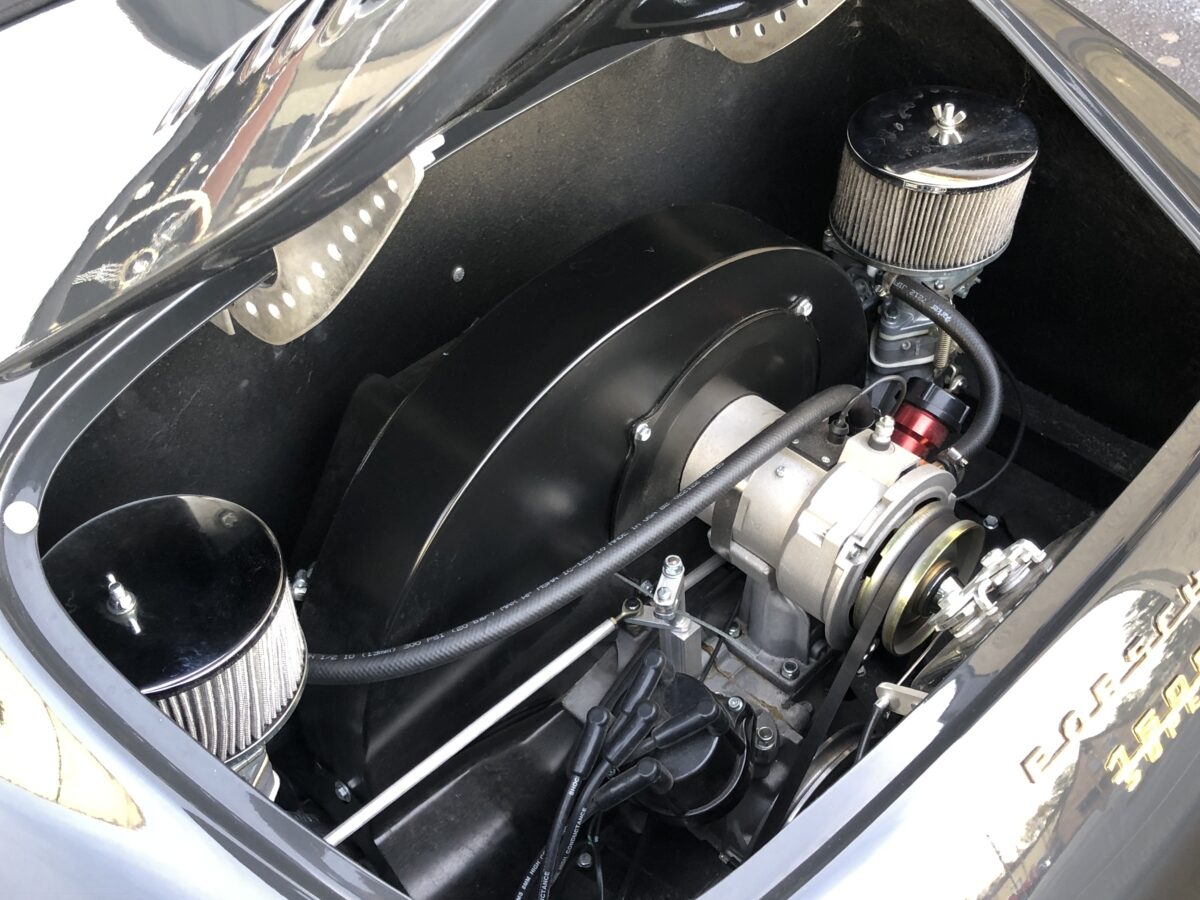 This particular build was done in Slate Gray which was an early 1960’s Porsche 356 color and it is hard to argue how great this car looks. In the shade it almost looks black but as the sun hits it you will see the color lighten up a bit and it is a great shade of gray. It is absolutely stunning and has a bit of a European Flair with the Whitewall tires. The fit and finish most likely exceeds the original. one has the GT louvered engine lid and a nice set of doing lights. It also has the mesh headlight grille guards. This The body is adorned with Porsche badging on the nose, rear and dash. It also runs on the vintage 190 polished aluminum wheels with emblem hub caps that look great. With just under 1960 miles the paint and body are near flawless. The owner paid $3200 to have it professionally ceramic coated and had PPF (paint protection film) applied to the front nose and lower rear quarter panels to avoid those unavoidable rock chips. I always recommend driving these cars top down but of course it also has a brand new black canvas soft top. Window inserts are also provided and a matching boot cover when the top is down for a clean, sophisticated look.