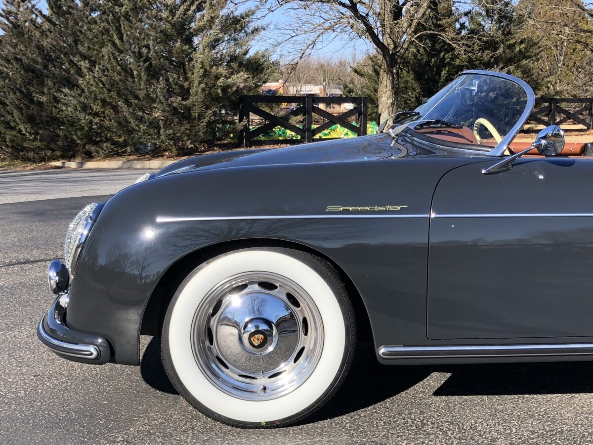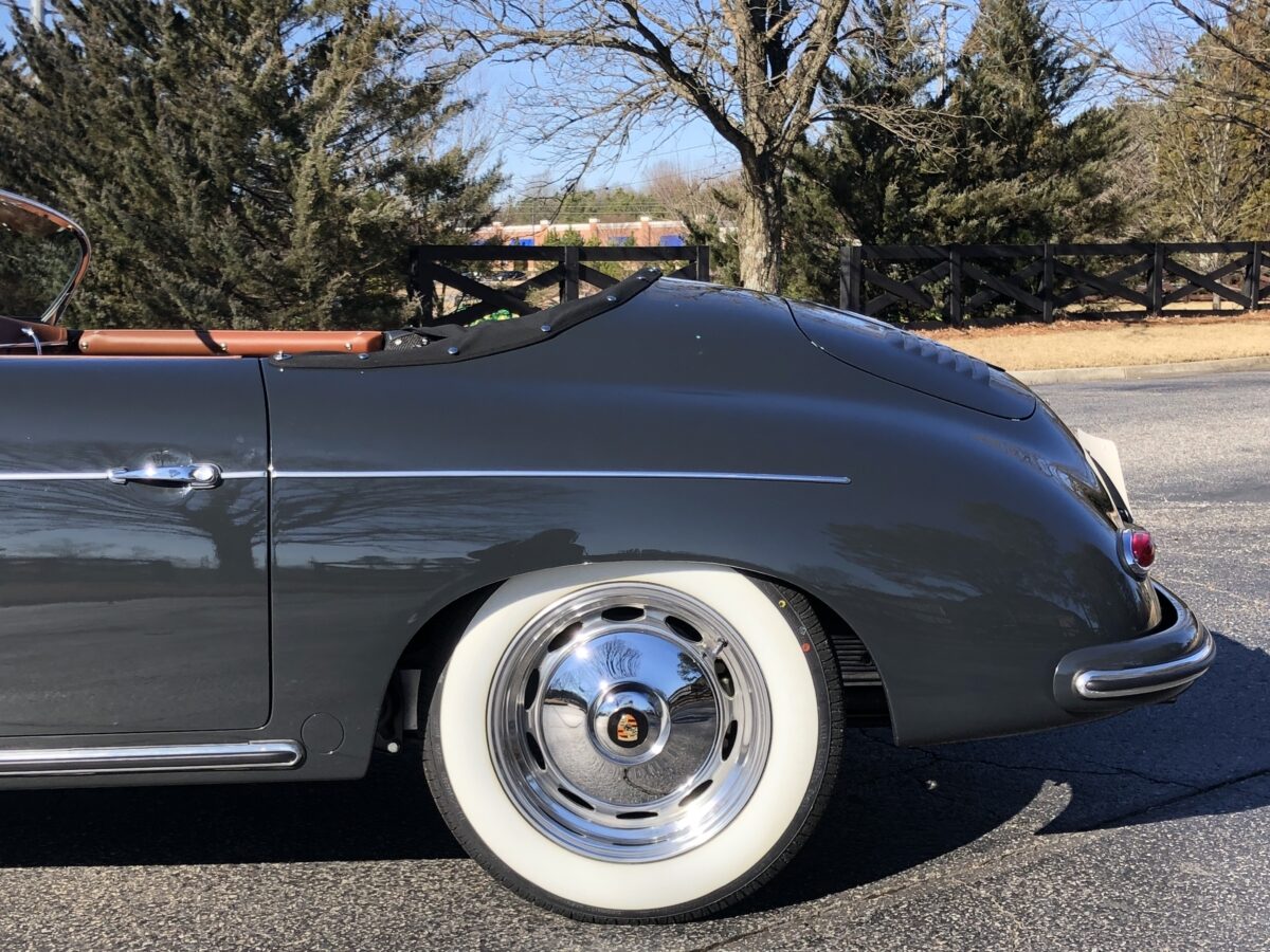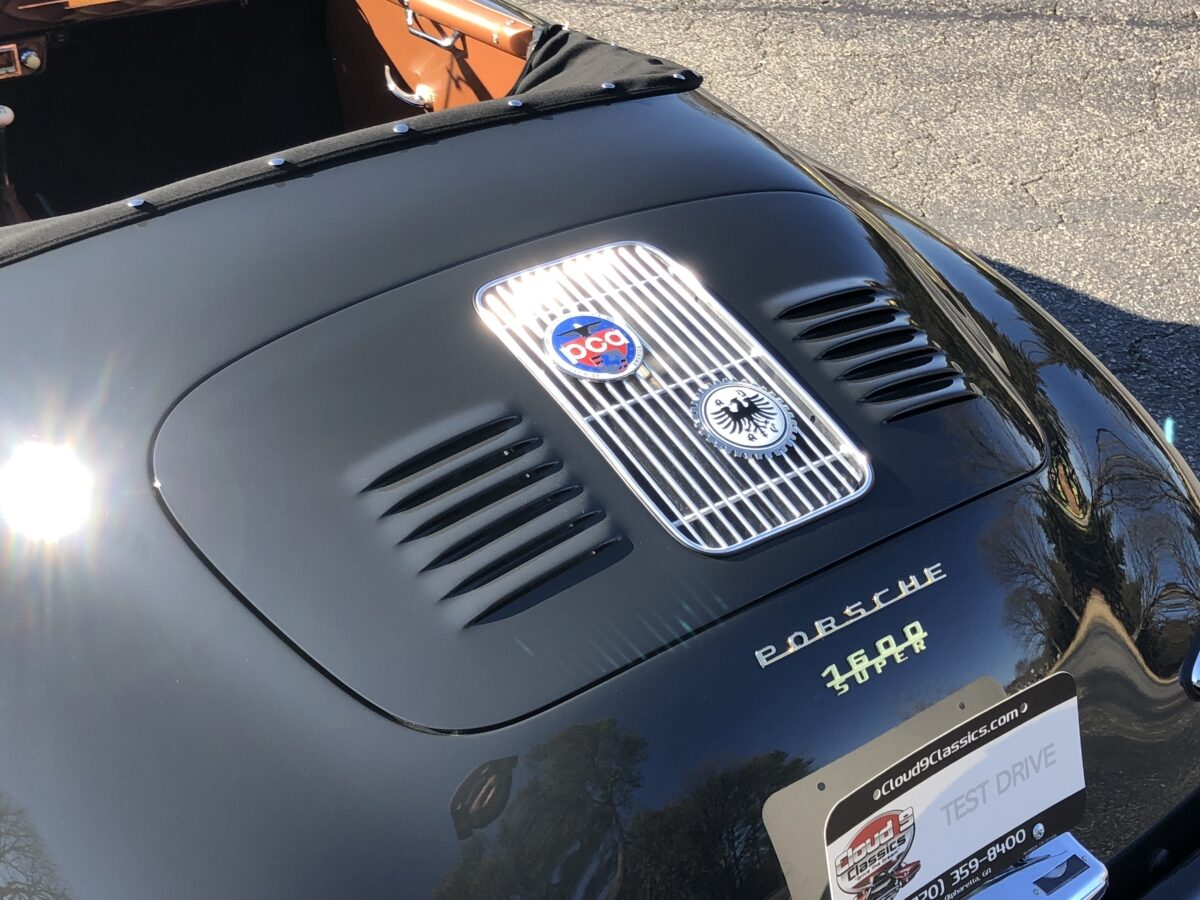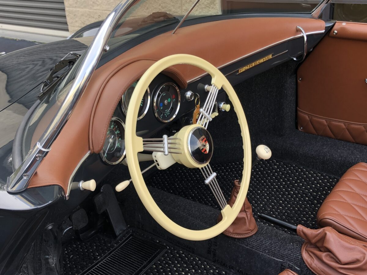 Complementing the classic Slate Gray exterior is an equally stunning Mahogany Diamond Stitched leather interior with Black German Square Weave carpeting. The Speedster seats are very comfortable. Door panels are beautifully customized with closing document pockets and polished door pulls. Matching dash pad and passenger side grab handle. Period correct VDO gauges with a GPS Speedometer and digital odometer allow the driver to monitor the speed and performance of this air cooled Speedster. Beautiful Ivory Banjo steering wheel with a Porsche horn button and vintage style turn signal lever adds to the authenticity. This 356 is also optioned with heated seats Vintage Speed Shifter for a crisp, short throw pattern for your driving pleasure. Retrosound Bluetooth stereo neatly mounted for a vintage look with hands free microphone mounted on the steering column. Shelf pad behind the front seats. Custom set of Coco mats have been added for that finishing touch. Simply gorgeous interior!!!