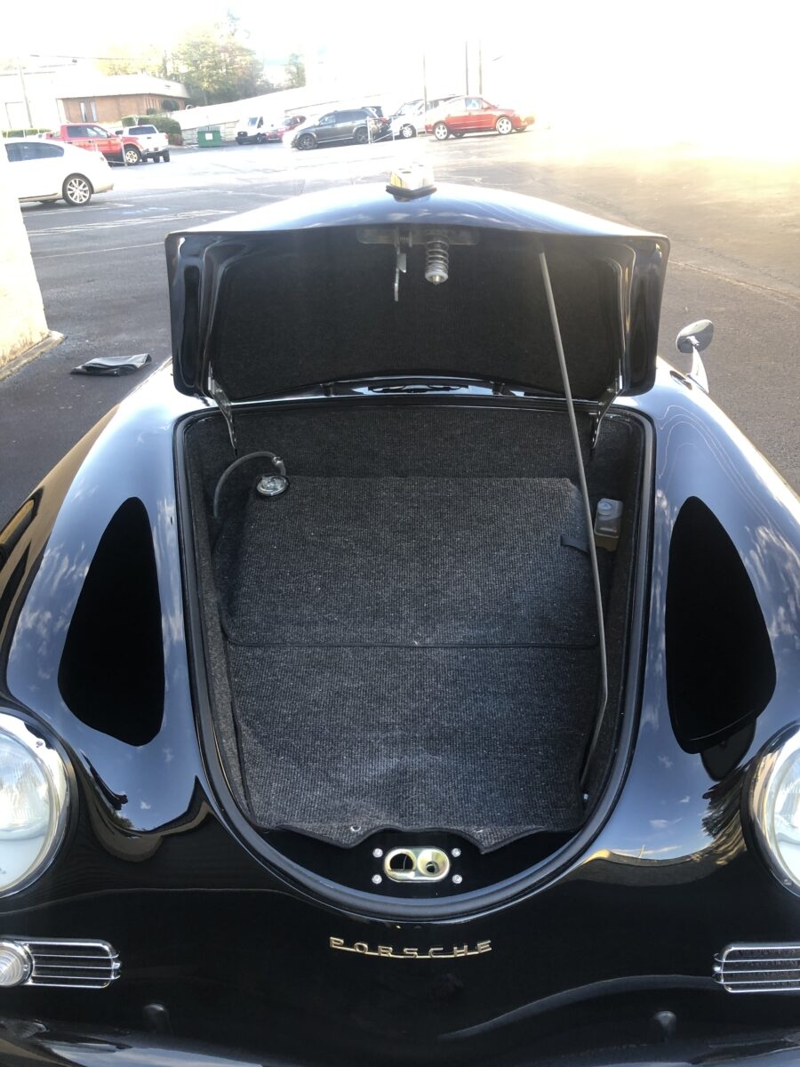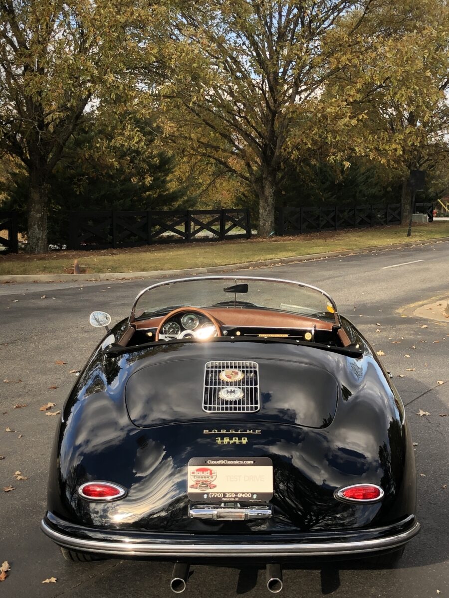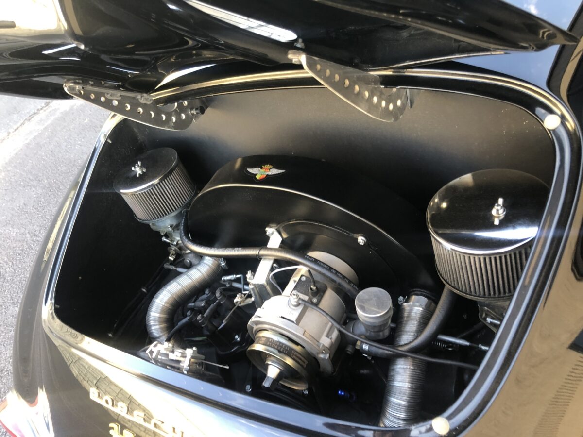 Complementing the classic Black exterior is a beautiful baseball glove interior with Black German square weave carpeting. The Speedster seats are very comfortable. Door panels have polished door pulls. Matching dash pad and passenger side grab handle. Period correct VDO gauges with a GPS Speedometer and digital odometer allow the driver to monitor the speed and performance of this air cooled Speedster. This one was ordered with gauges in Kilometers giving it a European flair. Beautiful Wood Grain steering wheel with a Porsche horn button and vintage style turn signal lever adds to the authenticity. This 356 is also optioned with traditional heat boxes and vents as well as heated seats A period looking Retrosound Bluetooth Stereo is neatly mounted with speakers hidden under dash. Vintage Speed Shifter for a crisp, short throw pattern for your driving pleasure. Shelf pad behind the front seats. Custom set of Coco mats for that finishing touch. Simply gorgeous interior!!!