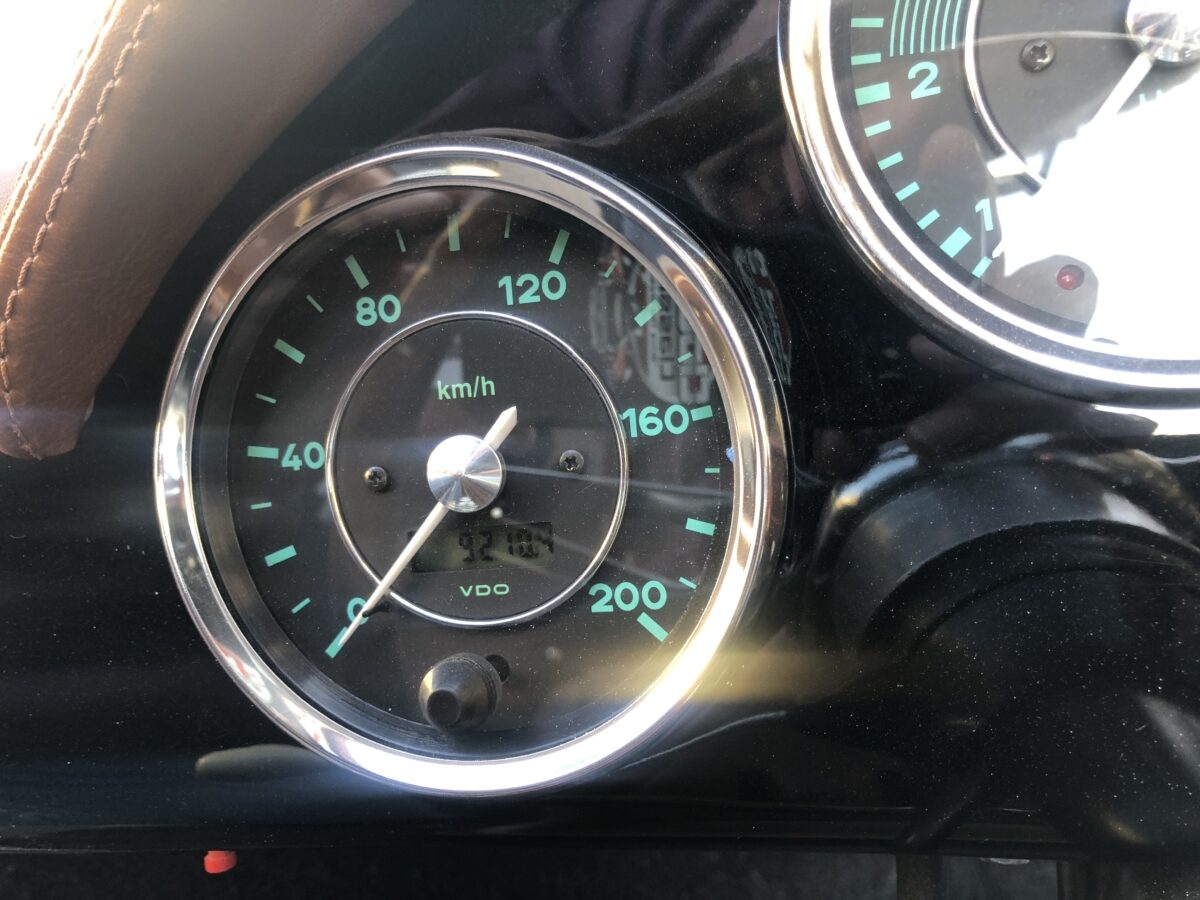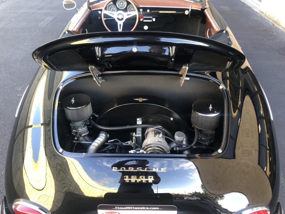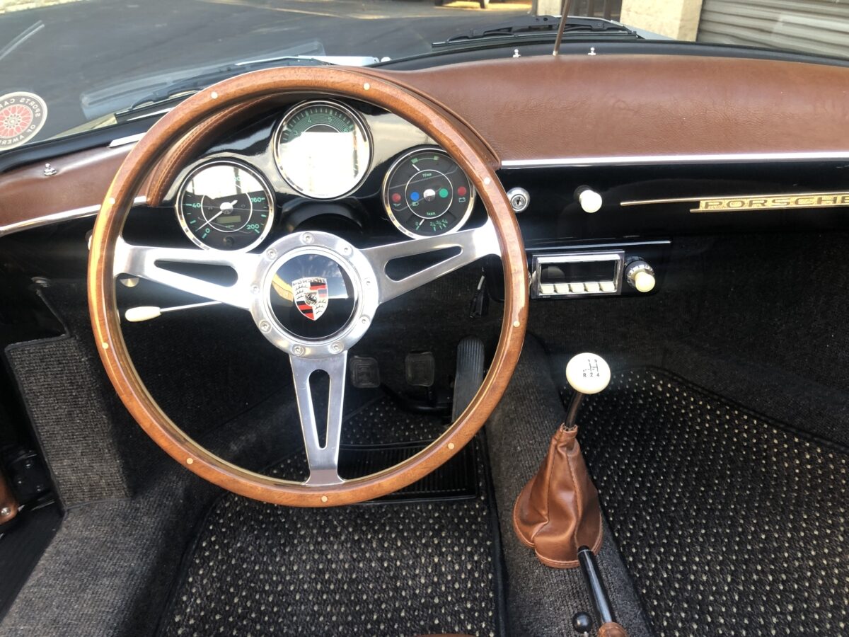 Complementing the classic Black exterior is a beautiful baseball glove interior with Black German square weave carpeting. The Speedster seats are very comfortable. Door panels have polished door pulls. Matching dash pad and passenger side grab handle. Period correct VDO gauges with a GPS Speedometer and digital odometer allow the driver to monitor the speed and performance of this air cooled Speedster. This one was ordered with gauges in Kilometers giving it a European flair. Beautiful Wood Grain steering wheel with a Porsche horn button and vintage style turn signal lever adds to the authenticity. This 356 is also optioned with traditional heat boxes and vents as well as heated seats A period looking Retrosound Bluetooth Stereo is neatly mounted with speakers hidden under dash. Vintage Speed Shifter for a crisp, short throw pattern for your driving pleasure. Shelf pad behind the front seats. Custom set of Coco mats for that finishing touch. Simply gorgeous interior!!!