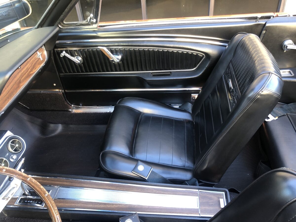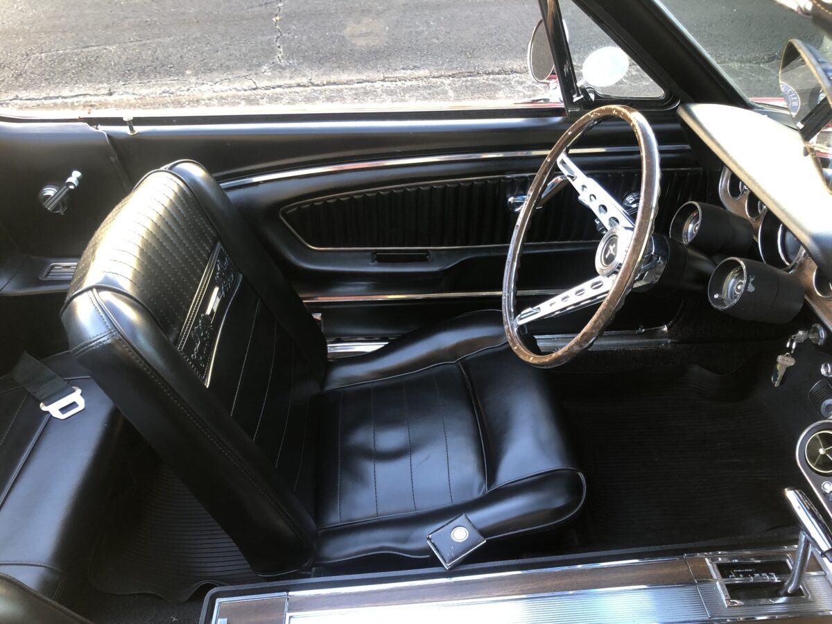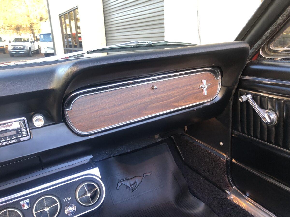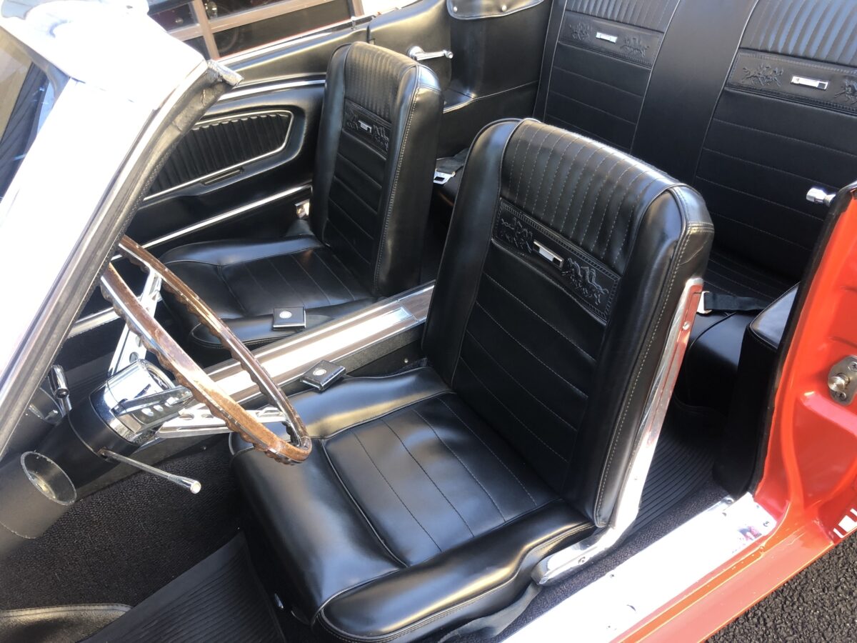 Complimenting the Signal Flare Red exterior is the deluxe black Pony interior that also looks fantastic. Door panels, dash pad, carpeting, dash bezel, center console, all look great. This Pony is very nicely equipped including factory A/C that was upgraded to R134 and has been properly maintained and still blows nice and cold. Original Rally Pac mounted on the column appears to be working well including the clock. An Autosound updated radio was added back at time of restoration and fits in the original radio spot. Interior lighting in door panels and center console all working. Weatherstripping and door felts also all look great. All of the gauges, turn signals, lights etc. appear to be working correctly. The interior is just as impressive as the body and you will be proud to show it off at any of the shows.