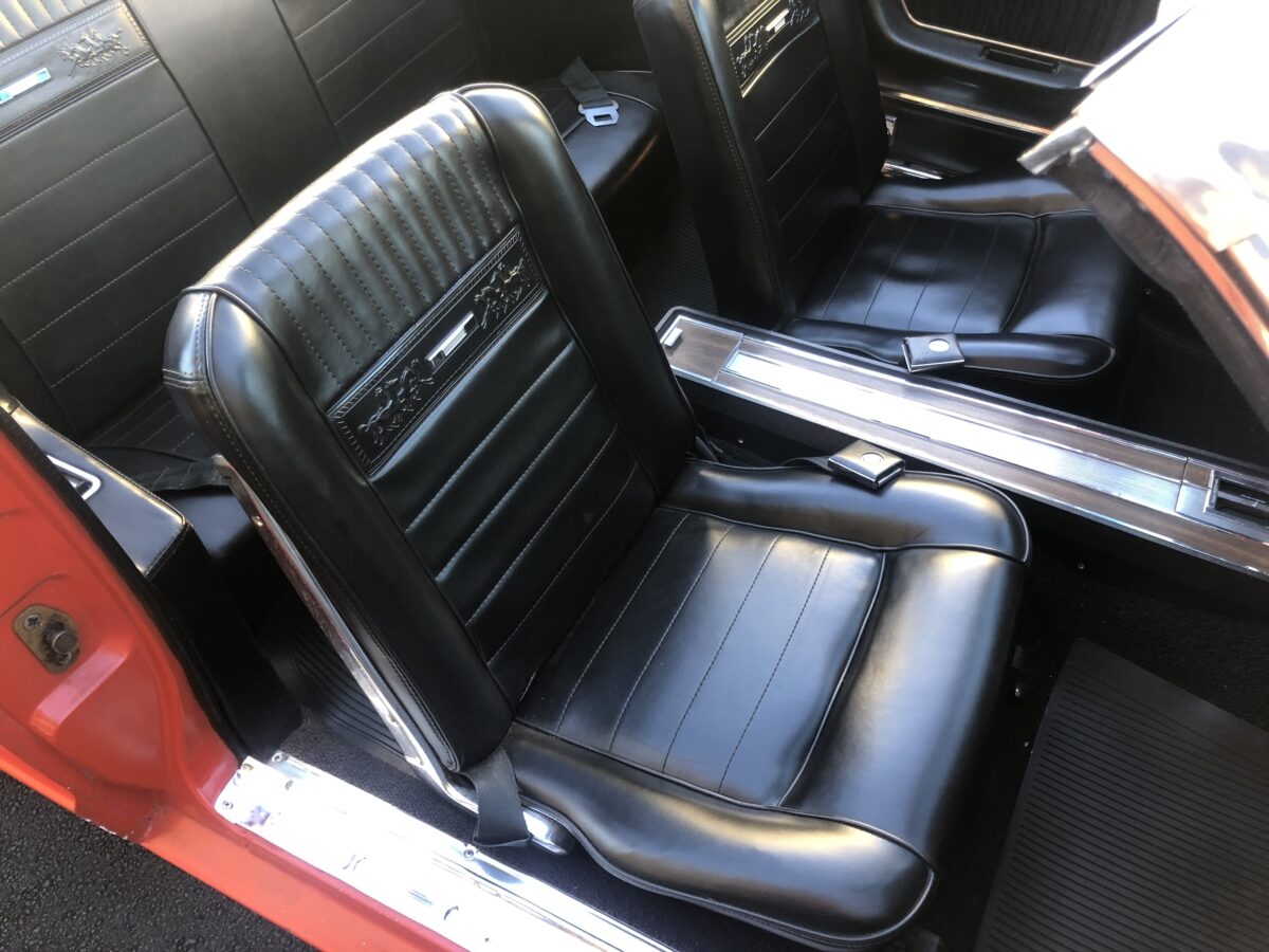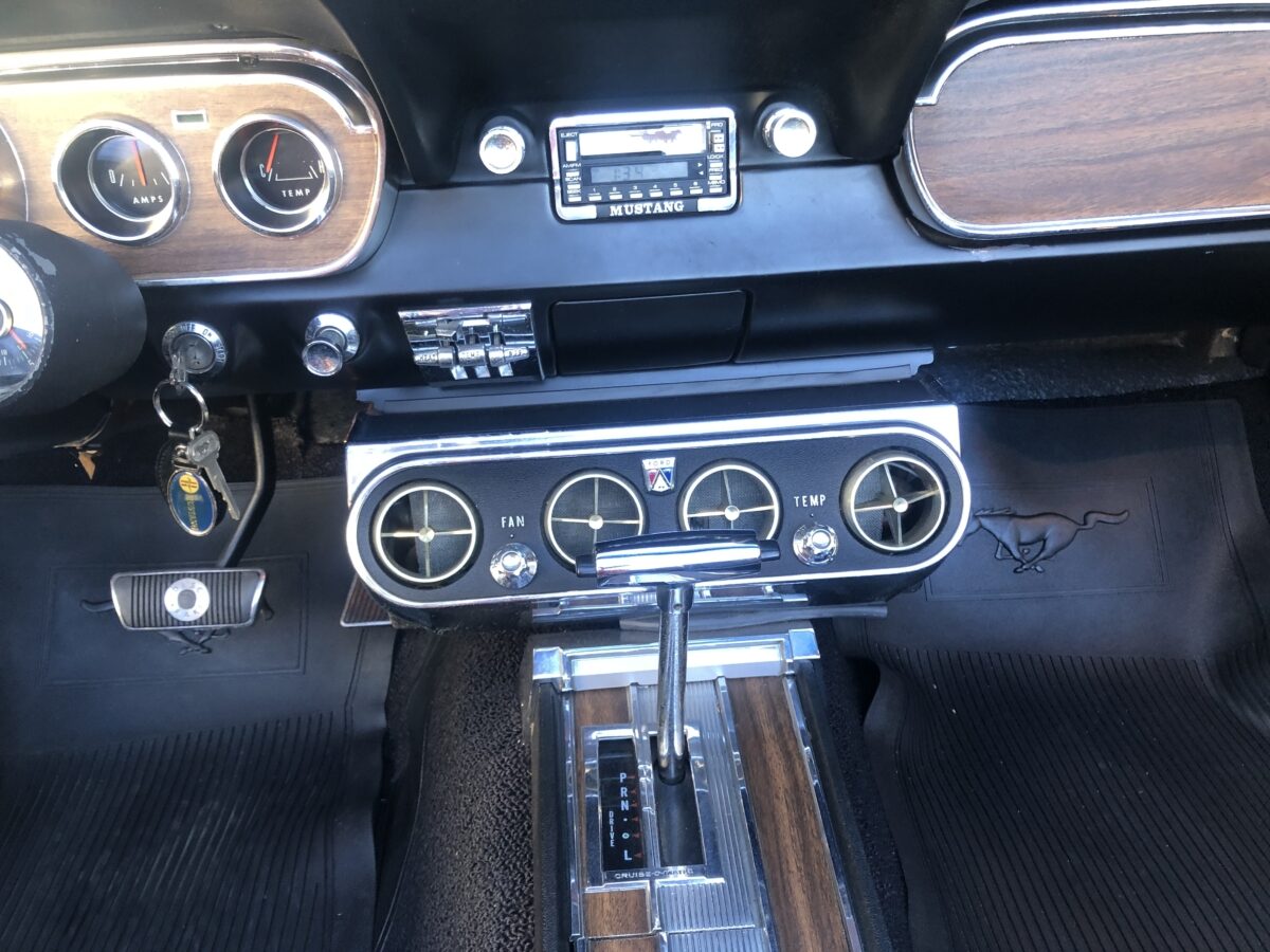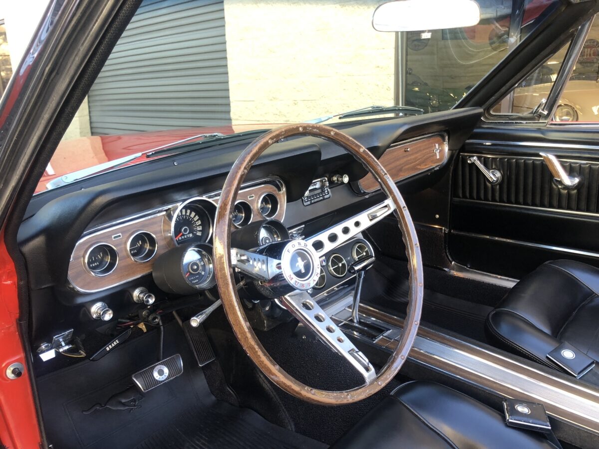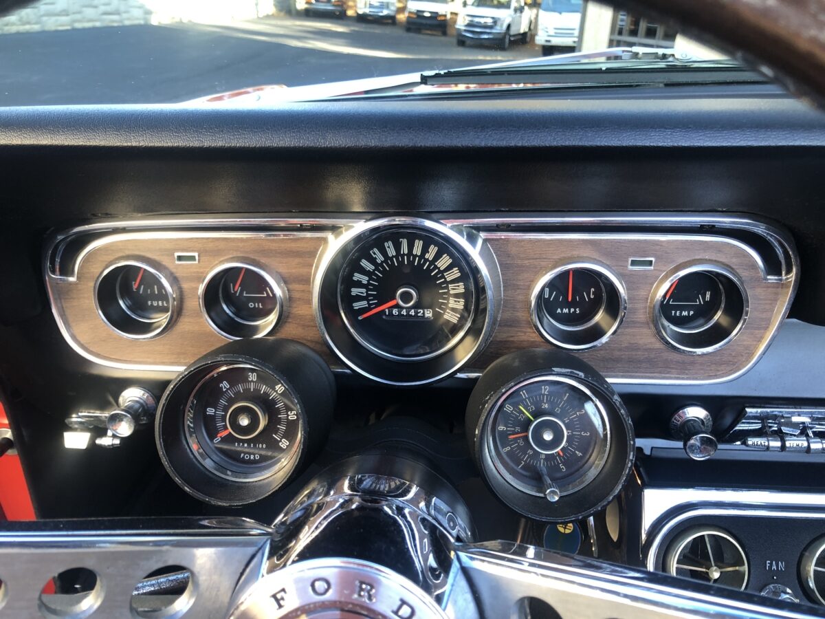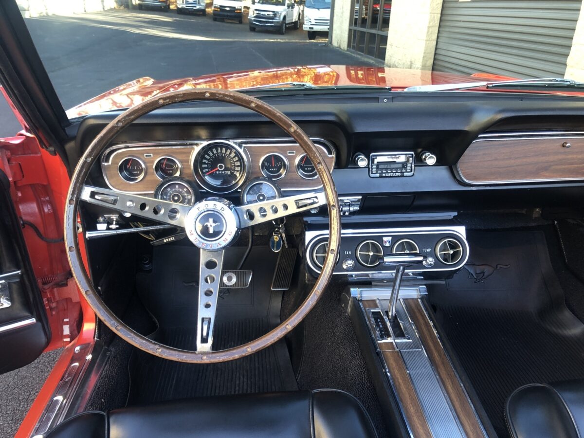 Complimenting the Signal Flare Red exterior is the deluxe black Pony interior that also looks fantastic. Door panels, dash pad, carpeting, dash bezel, center console, all look great. This Pony is very nicely equipped including factory A/C that was upgraded to R134 and has been properly maintained and still blows nice and cold. Original Rally Pac mounted on the column appears to be working well including the clock. An Autosound updated radio was added back at time of restoration and fits in the original radio spot. Interior lighting in door panels and center console all working. Weatherstripping and door felts also all look great. All of the gauges, turn signals, lights etc. appear to be working correctly. The interior is just as impressive as the body and you will be proud to show it off at any of the shows.