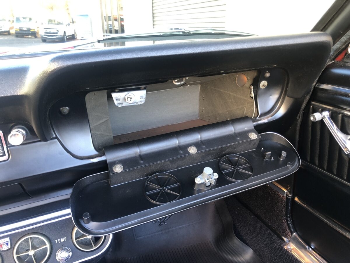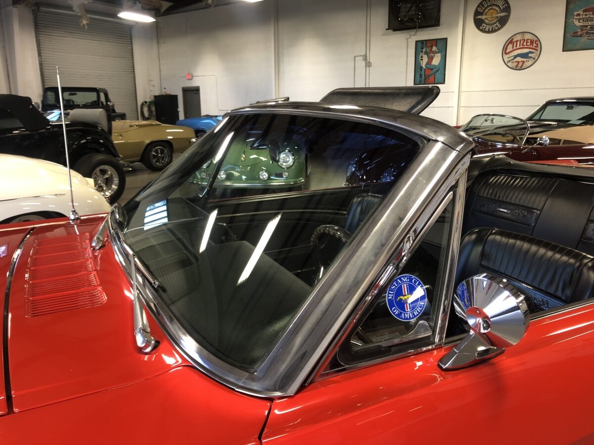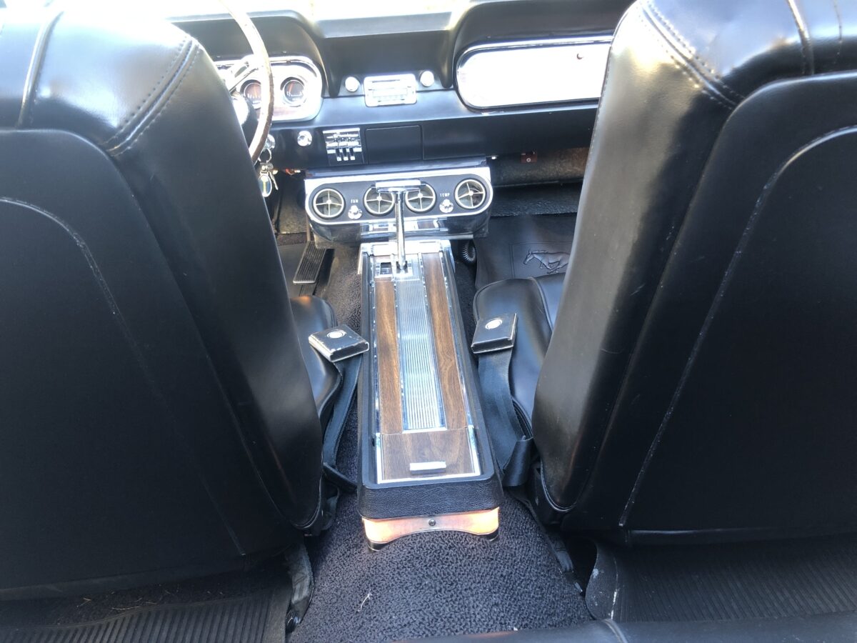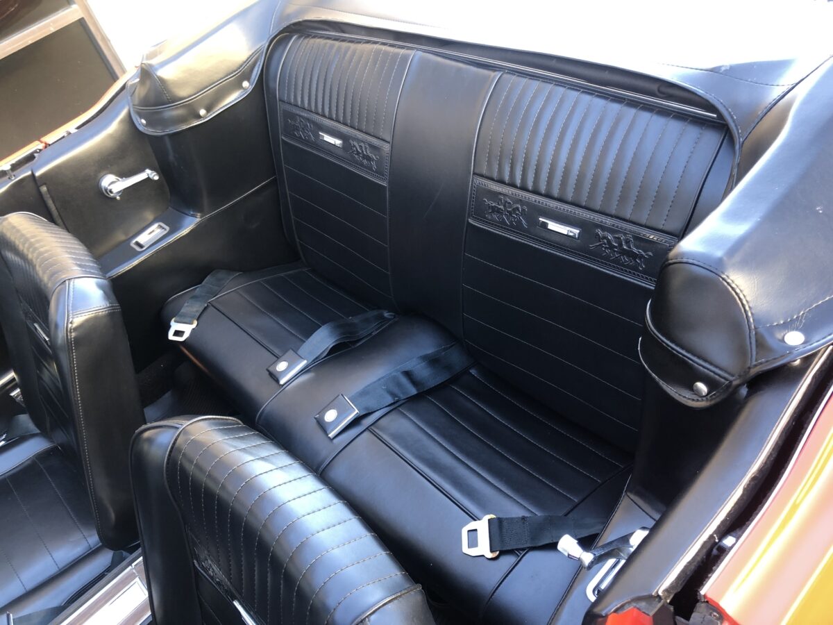 Complimenting the Signal Flare Red exterior is the deluxe black Pony interior that also looks fantastic. Door panels, dash pad, carpeting, dash bezel, center console, all look great. This Pony is very nicely equipped including factory A/C that was upgraded to R134 and has been properly maintained and still blows nice and cold. Original Rally Pac mounted on the column appears to be working well including the clock. An Autosound updated radio was added back at time of restoration and fits in the original radio spot. Interior lighting in door panels and center console all working. Weatherstripping and door felts also all look great. All of the gauges, turn signals, lights etc. appear to be working correctly. The interior is just as impressive as the body and you will be proud to show it off at any of the shows.