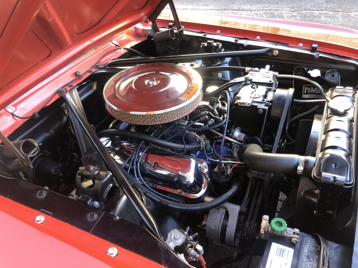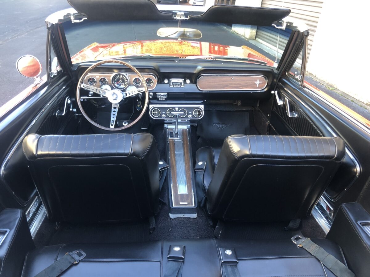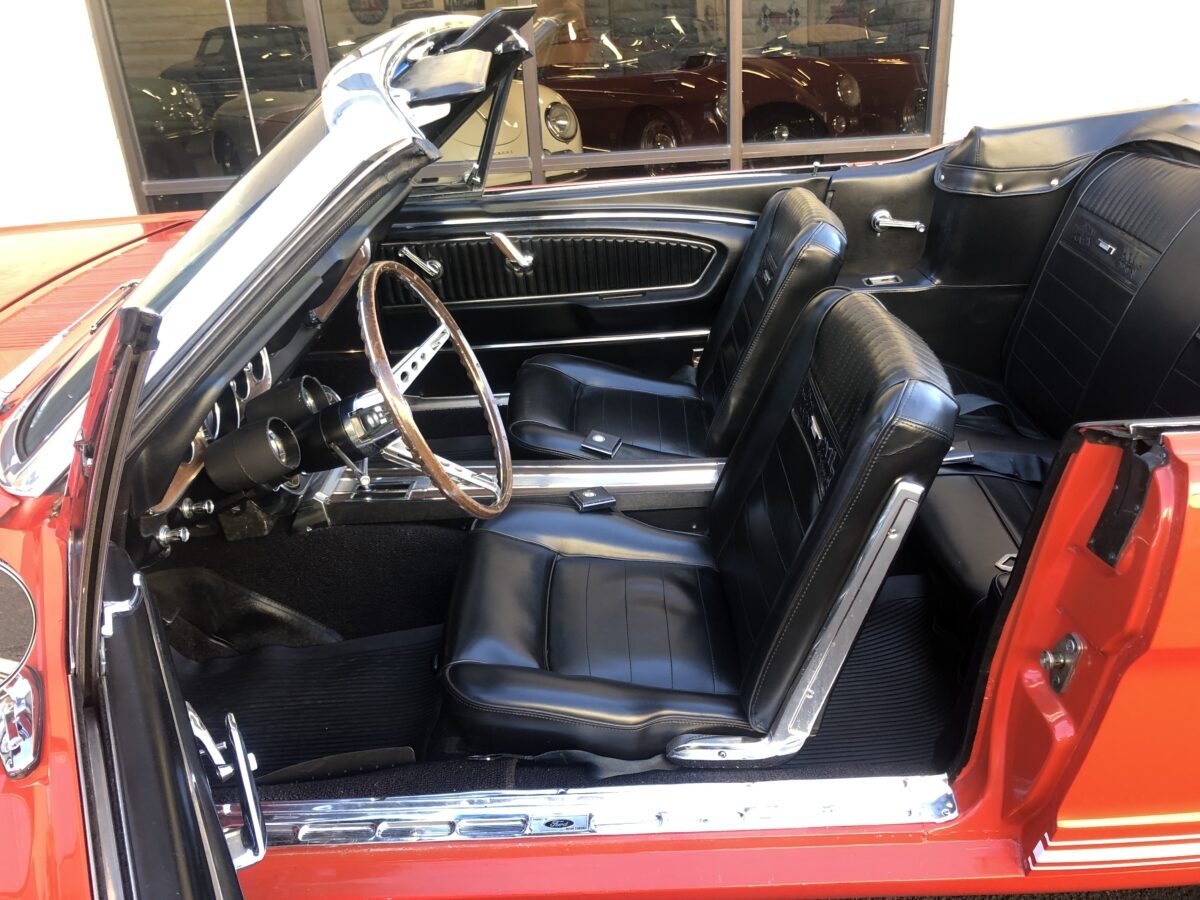 This classic Mustang was treated to a very high level restoration in 1989 in its original Signal flare red color. We have photo documentation of the restoration and it appears to have its original body panels with Ford numbers stamped on front fenders and rear quarters. The paint has held up beautifully and we just did a thorough detail to really highlight this beautiful color. Body is very straight overall and no signs of rust anywhere on the body. It wears original GT type stripes and badges and all of the chrome and trim looks excellent. Other than a few minor chips and blemishes from 33 years of enjoyment this ’66 Pony is still very show worthy and a great car to drive and enjoy and take to the local cruise-ins. There are judging sheets from Concours MCA events where it scored 441 and 450 points out of 500 making it a fantastic and correct driven show car. Beautiful White power convertible top also still in excellent condition and black boot cover for when the top is down which should be most of the time hopefully.