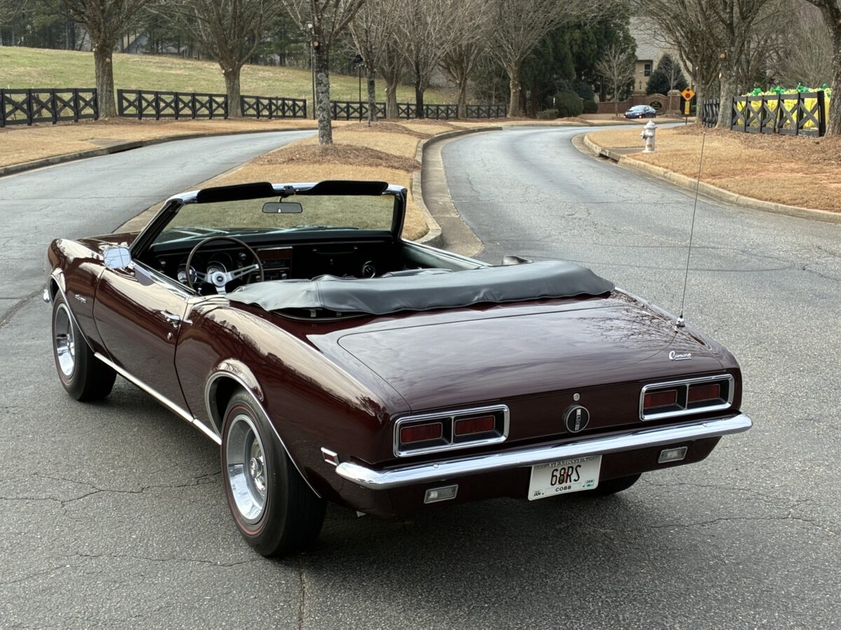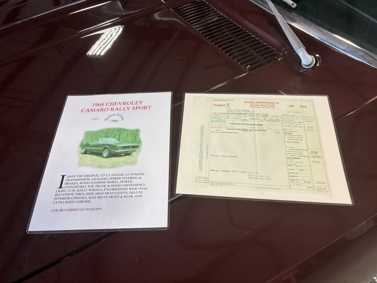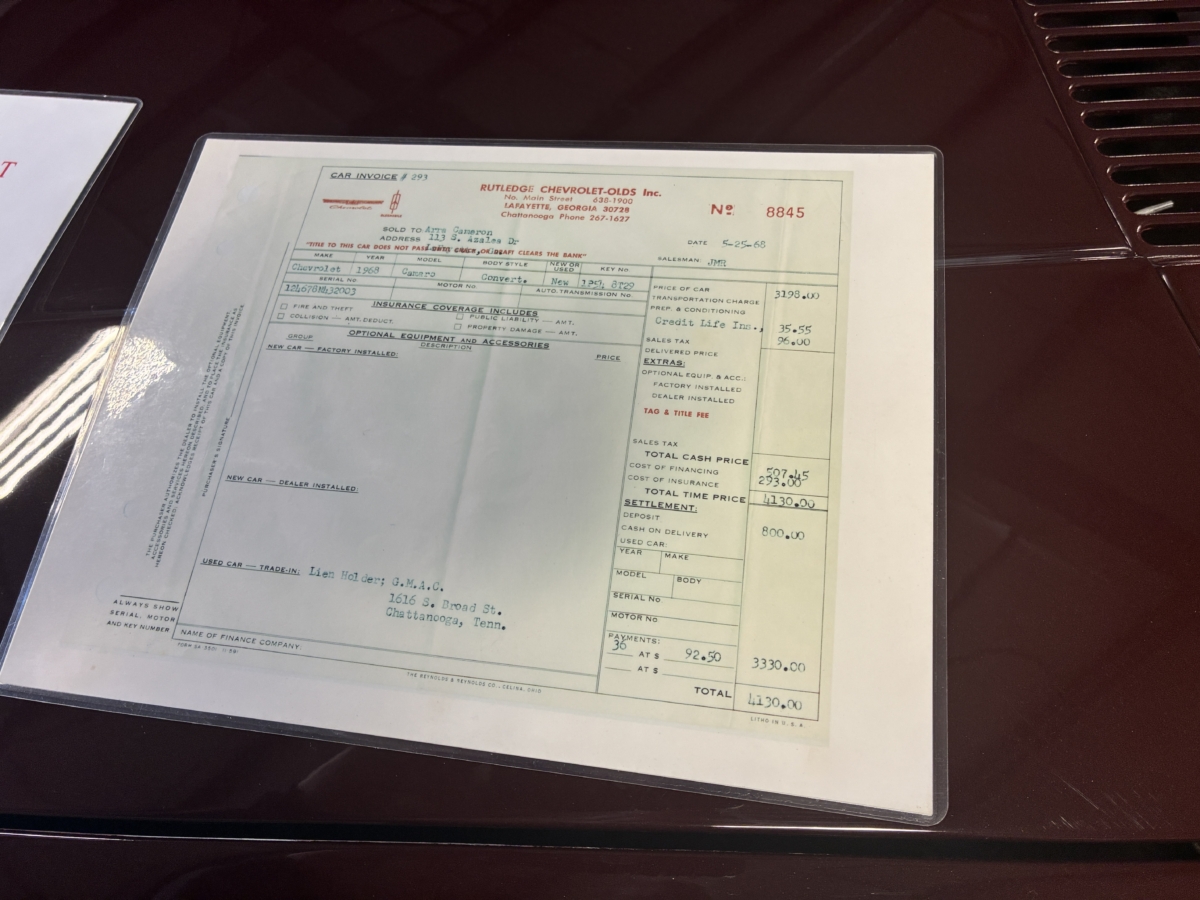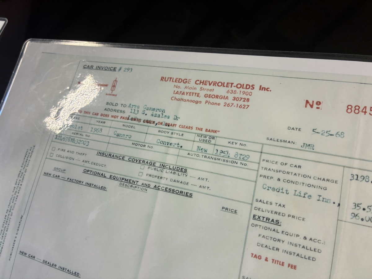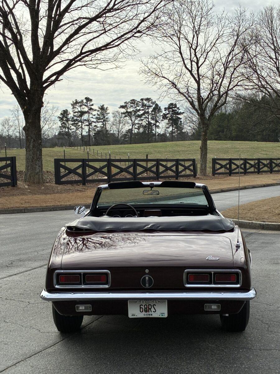 I purchased this amazing Cordovan Maroon ’68 RS convertible from a local family here in the Atlanta area who have owned this car for over 36 years! It was originally sold at Rutledge Chevrolet in Lafayette, GA on May 25, 1968. We have the original sales invoice and receipt for the $800 deposit the folks put down on it when they bought it new. I believe the car has only had 3 owners based on the documentation we have. It appears to have had one repaint in the original color, done in 1982 by the second owner as documented in the receipts. It was then sold in 1989 to the folks I purchased it from. These folks are amazing car enthusiasts who spent weekends at car events and cruise-ins and truly loved this Camaro. In addition to this Camaro they also had a C-2 Corvette Convertible and C-3 Corvette Convertible. Sadly, the owners health declined over the past several years and they were no longer able to drive and enjoy this beauty so the difficult decision was made and it is time for this beautiful Camaro to live its next chapter with a lucky new owner…maybe you?!!!