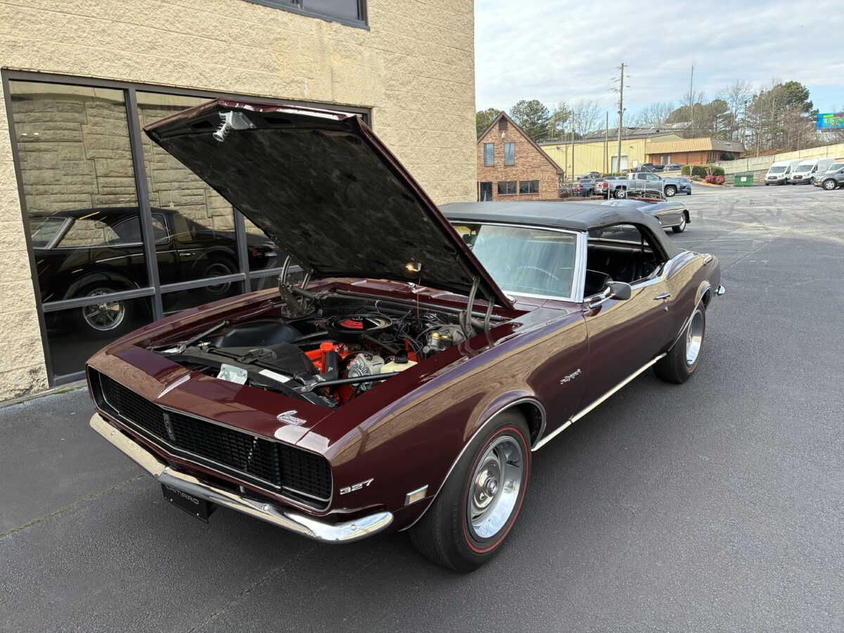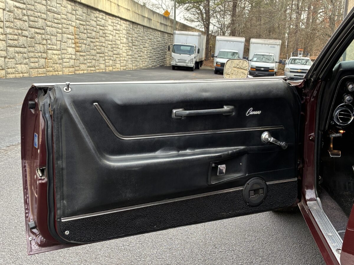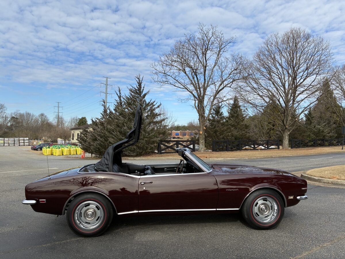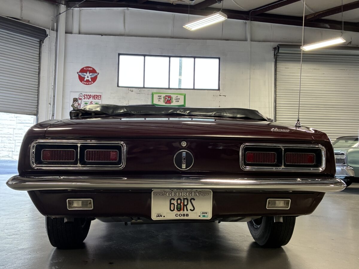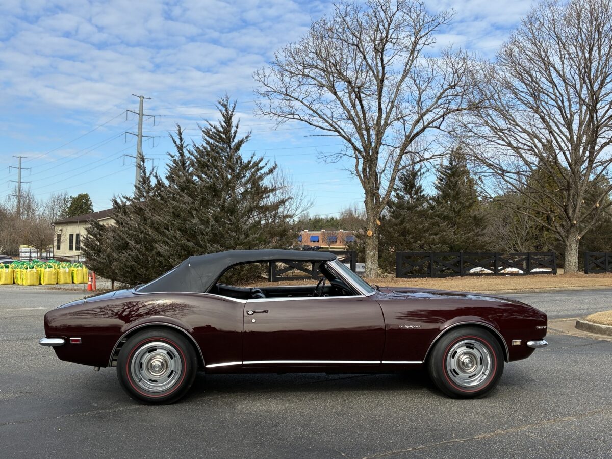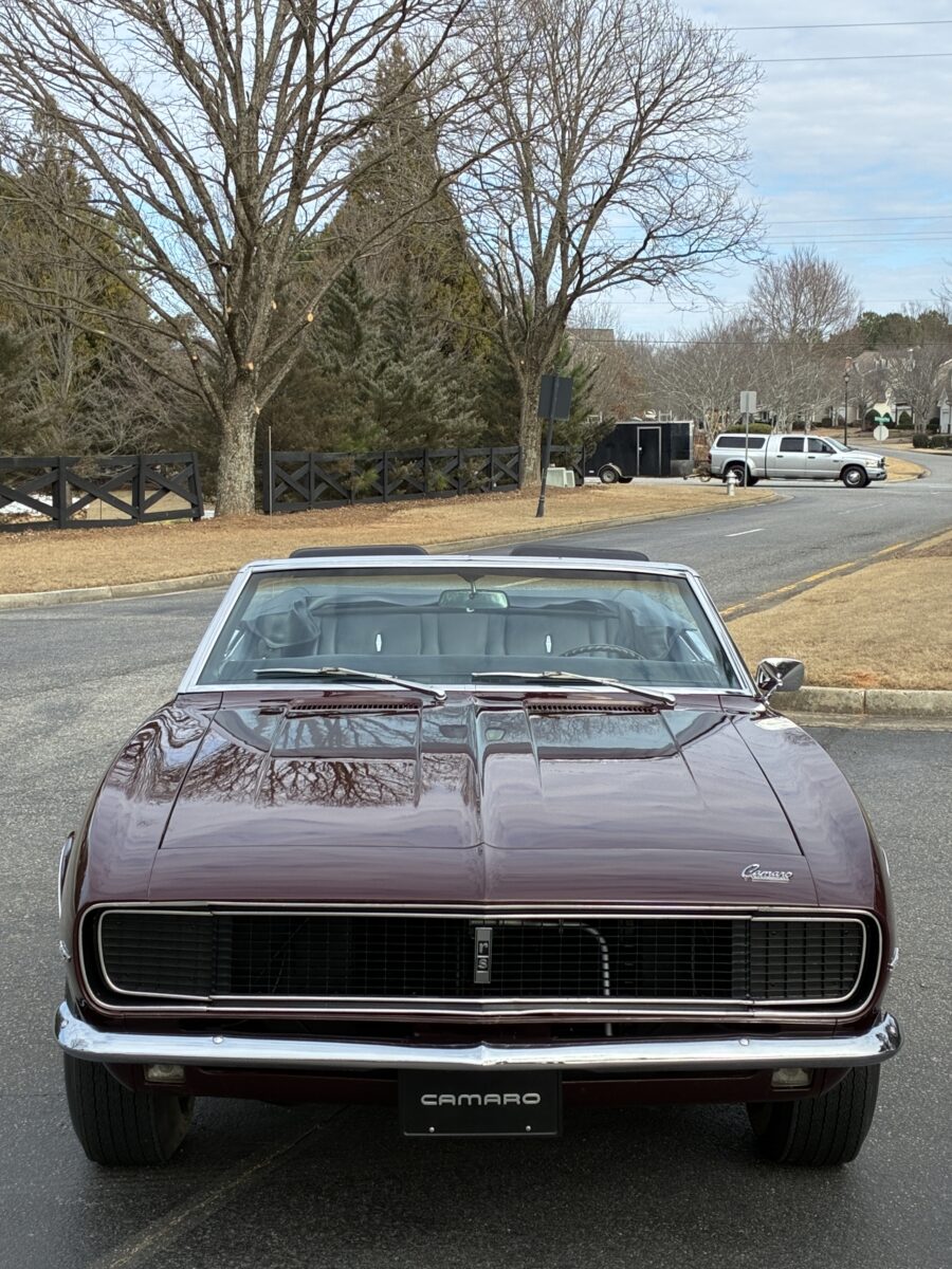I purchased this amazing Cordovan Maroon ’68 RS convertible from a local family here in the Atlanta area who have owned this car for over 36 years! It was originally sold at Rutledge Chevrolet in Lafayette, GA on May 25, 1968. We have the original sales invoice and receipt for the $800 deposit the folks put down on it when they bought it new. I believe the car has only had 3 owners based on the documentation we have. It appears to have had one repaint in the original color, done in 1982 by the second owner as documented in the receipts. It was then sold in 1989 to the folks I purchased it from. These folks are amazing car enthusiasts who spent weekends at car events and cruise-ins and truly loved this Camaro. In addition to this Camaro they also had a C-2 Corvette Convertible and C-3 Corvette Convertible. Sadly, the owners health declined over the past several years and they were no longer able to drive and enjoy this beauty so the difficult decision was made and it is time for this beautiful Camaro to live its next chapter with a lucky new owner…maybe you?!!!