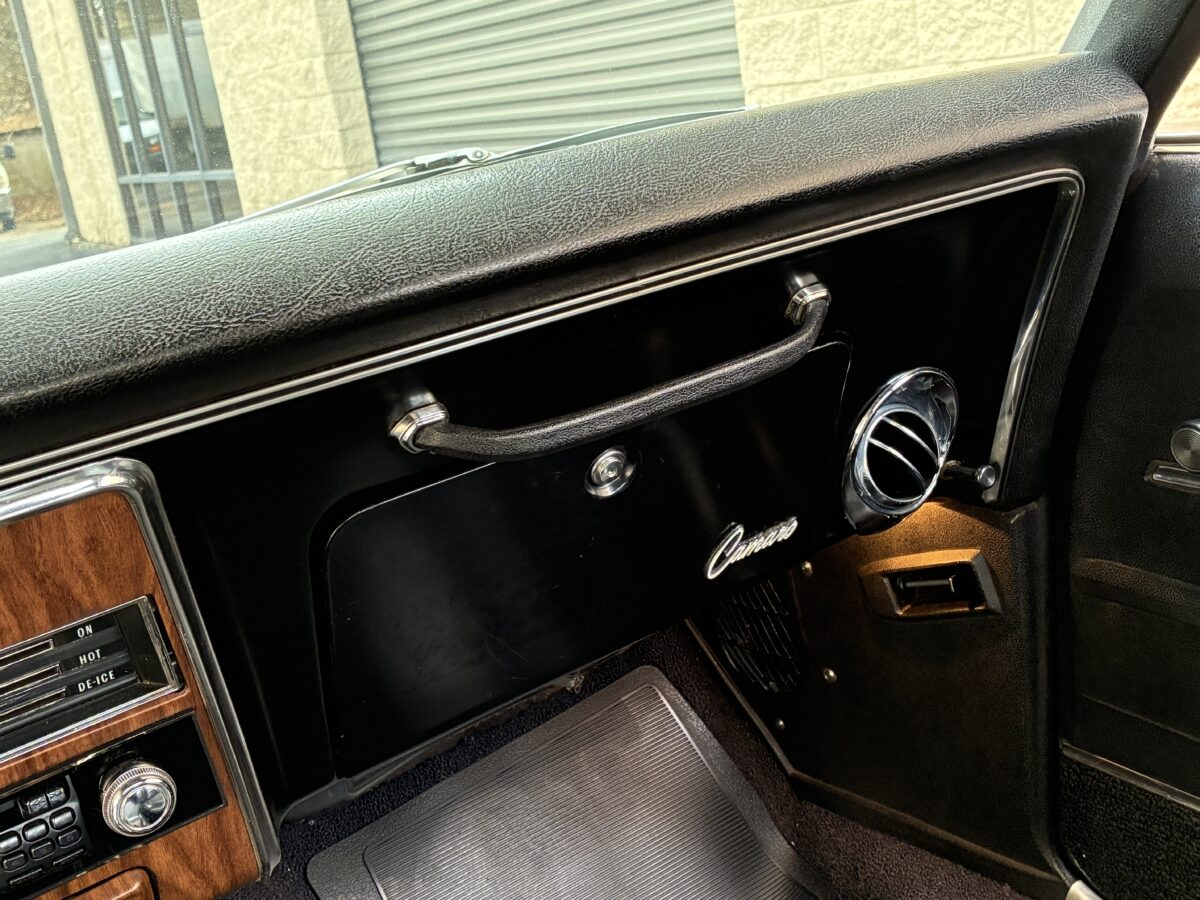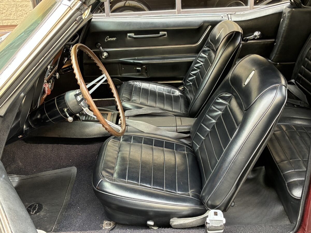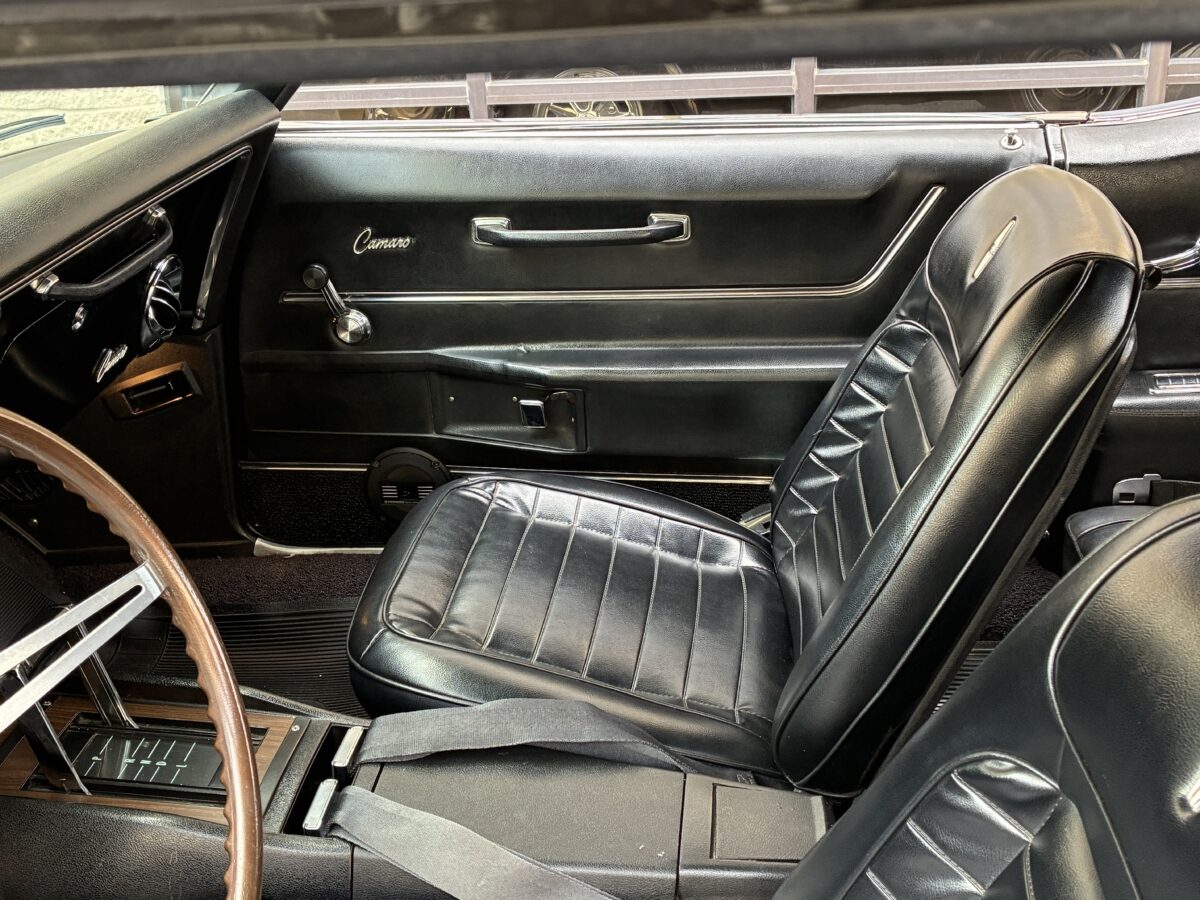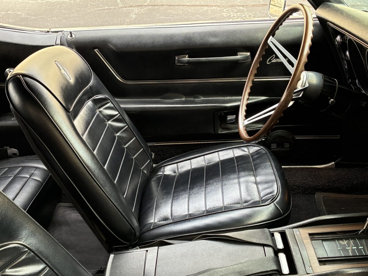 Open the drivers side door and you will see that this Camaro is equally as nice inside as it is outside. The code 714 Custom Deluxe bucket seat interior looks fantastic with no wear or tear evident. Front seats were redone by previous owner including new seat foams. Carpet was also replaced by previous owner. Dash looks great and you will notice the woodgrain accents on dash and console with the Staple style shifter. Hard to miss the beautiful upgraded woodgrain steering wheel. Aftermarket am/fm/cassette with speakers neatly mounted in the door panels works nicely. All of the gauges, blinkers and lights appear to be working correctly. All of the weatherstripping looks fantastic and new window felts were done by previous owner. The interior basically looks like it did when it left the showroom and you will be proud to show it off. Here’s a look inside: