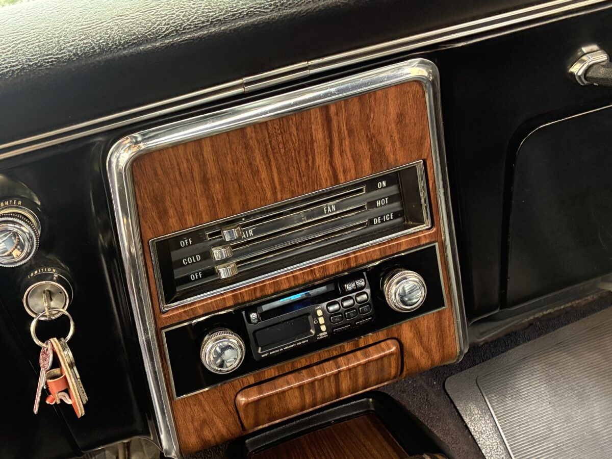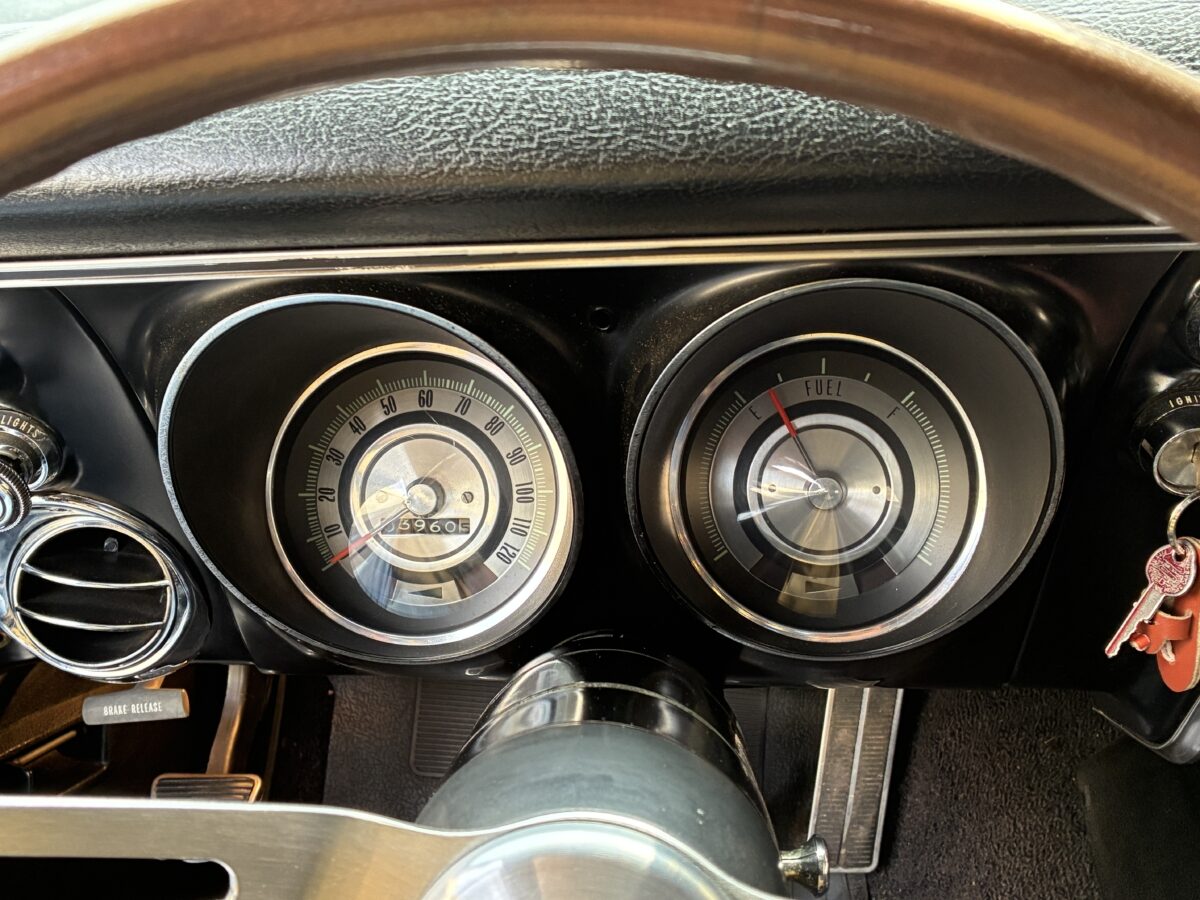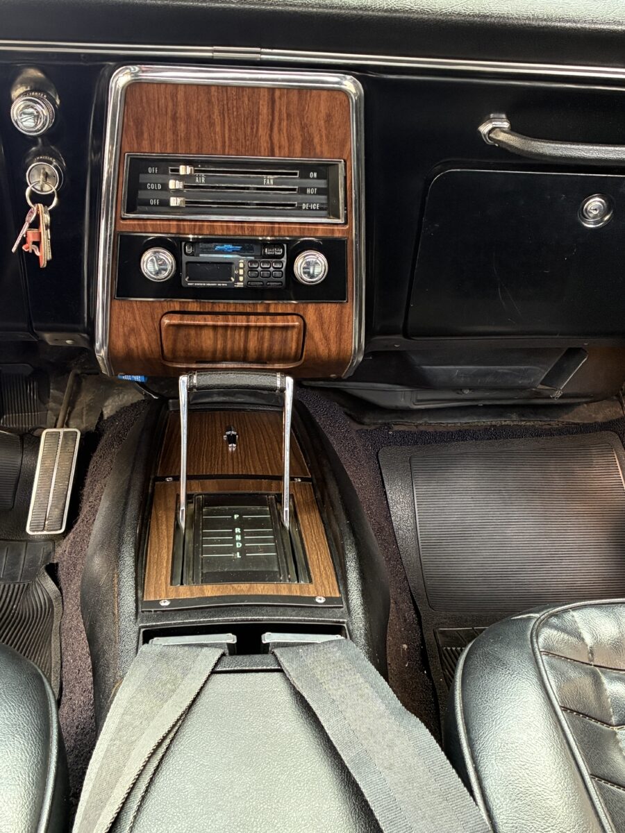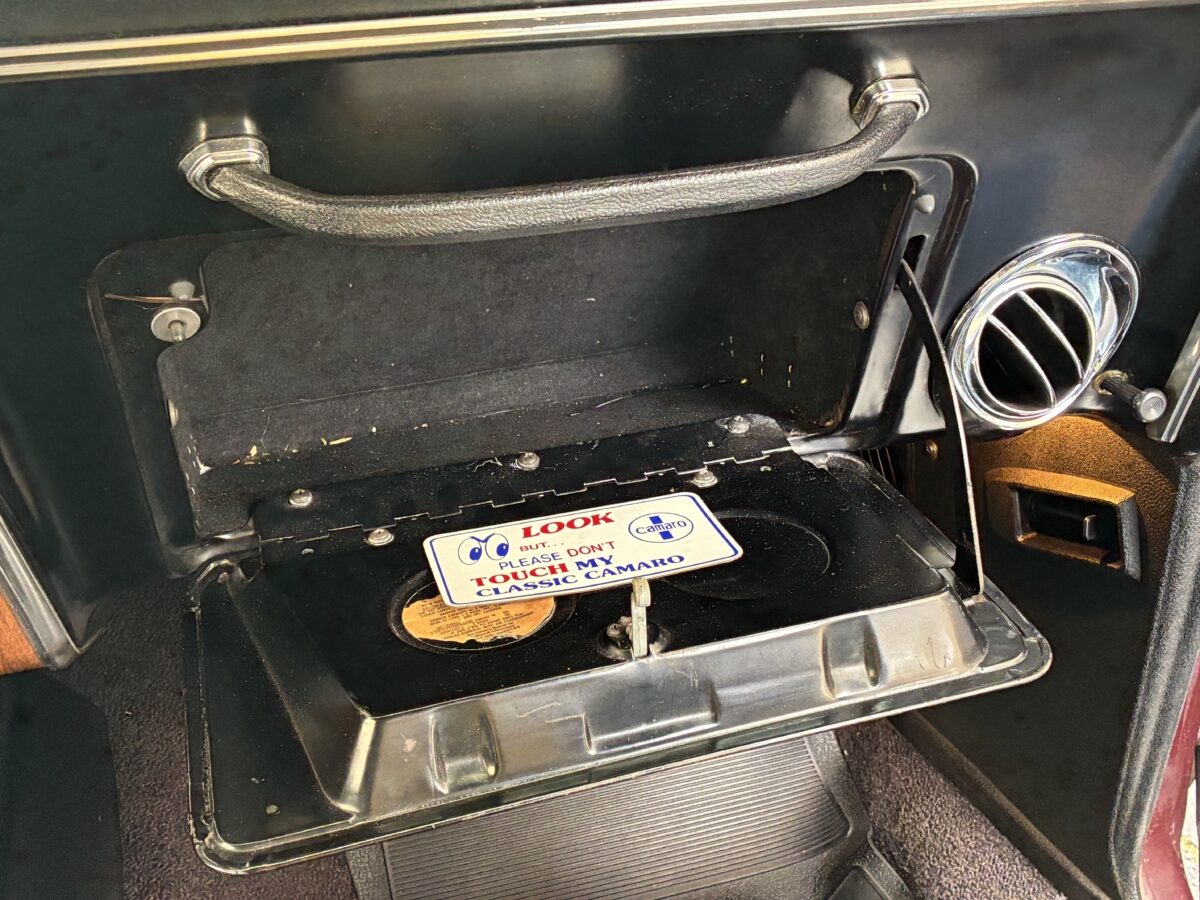 Open the drivers side door and you will see that this Camaro is equally as nice inside as it is outside. The code 714 Custom Deluxe bucket seat interior looks fantastic with no wear or tear evident. Front seats were redone by previous owner including new seat foams. Carpet was also replaced by previous owner. Dash looks great and you will notice the woodgrain accents on dash and console with the Staple style shifter. Hard to miss the beautiful upgraded woodgrain steering wheel. Aftermarket am/fm/cassette with speakers neatly mounted in the door panels works nicely. All of the gauges, blinkers and lights appear to be working correctly. All of the weatherstripping looks fantastic and new window felts were done by previous owner. The interior basically looks like it did when it left the showroom and you will be proud to show it off. Here’s a look inside: