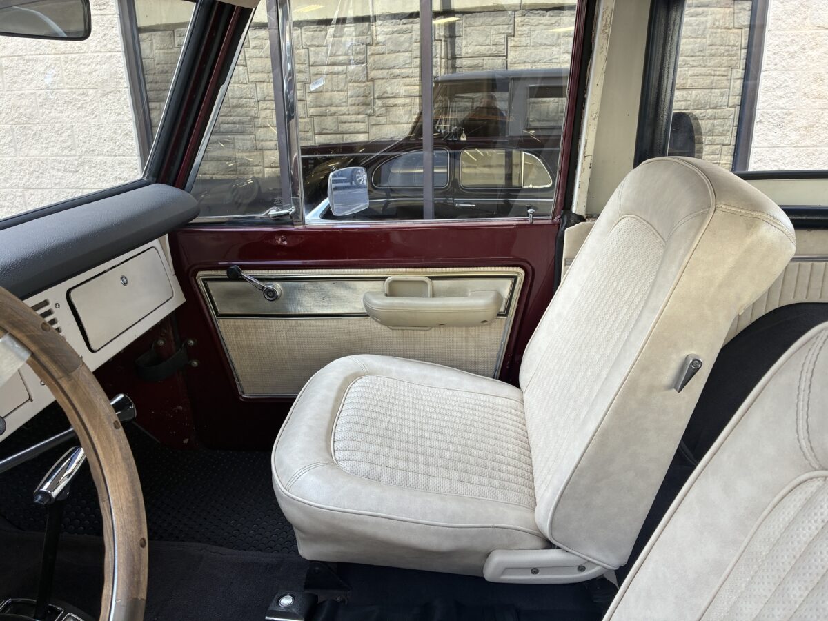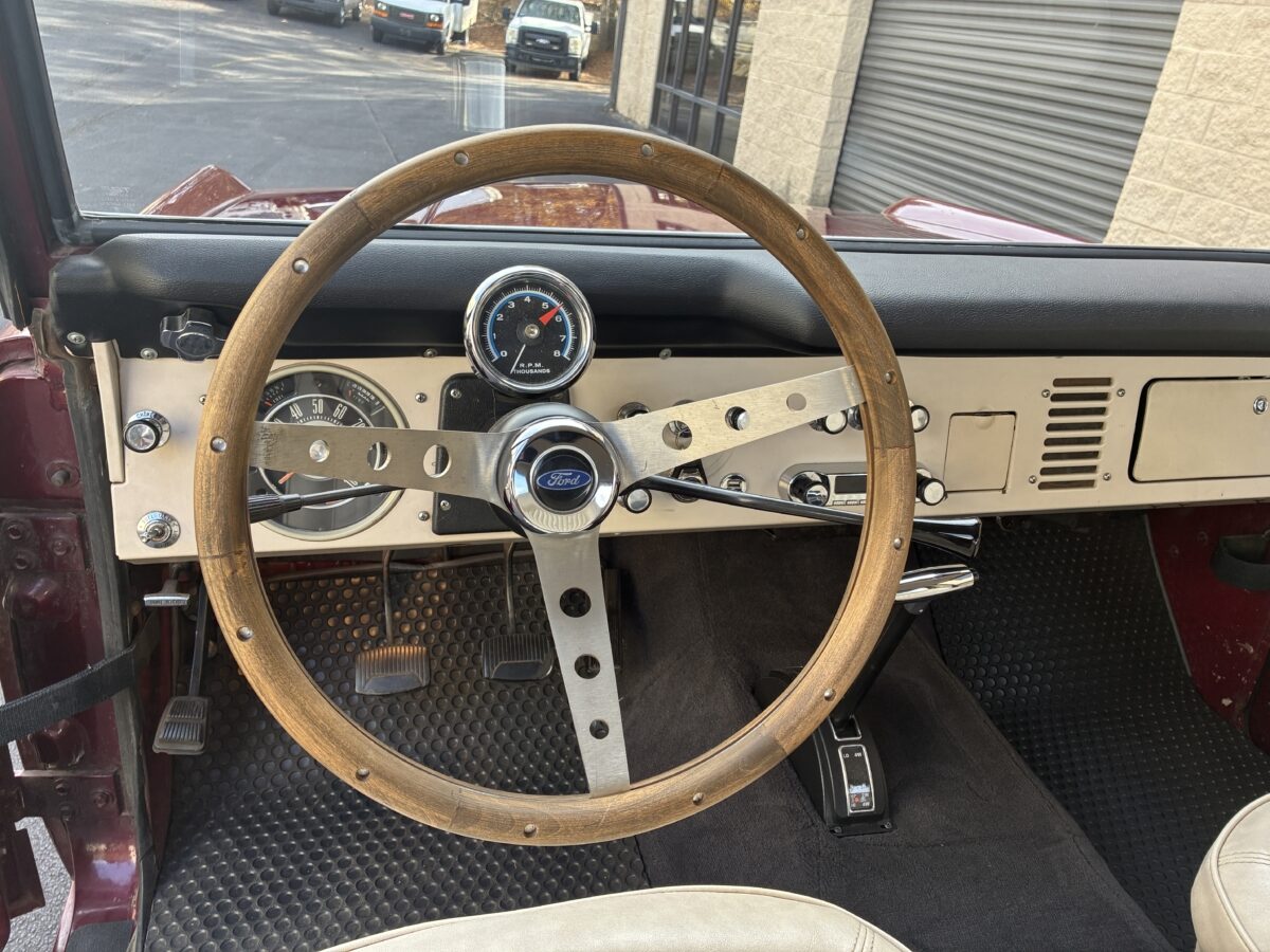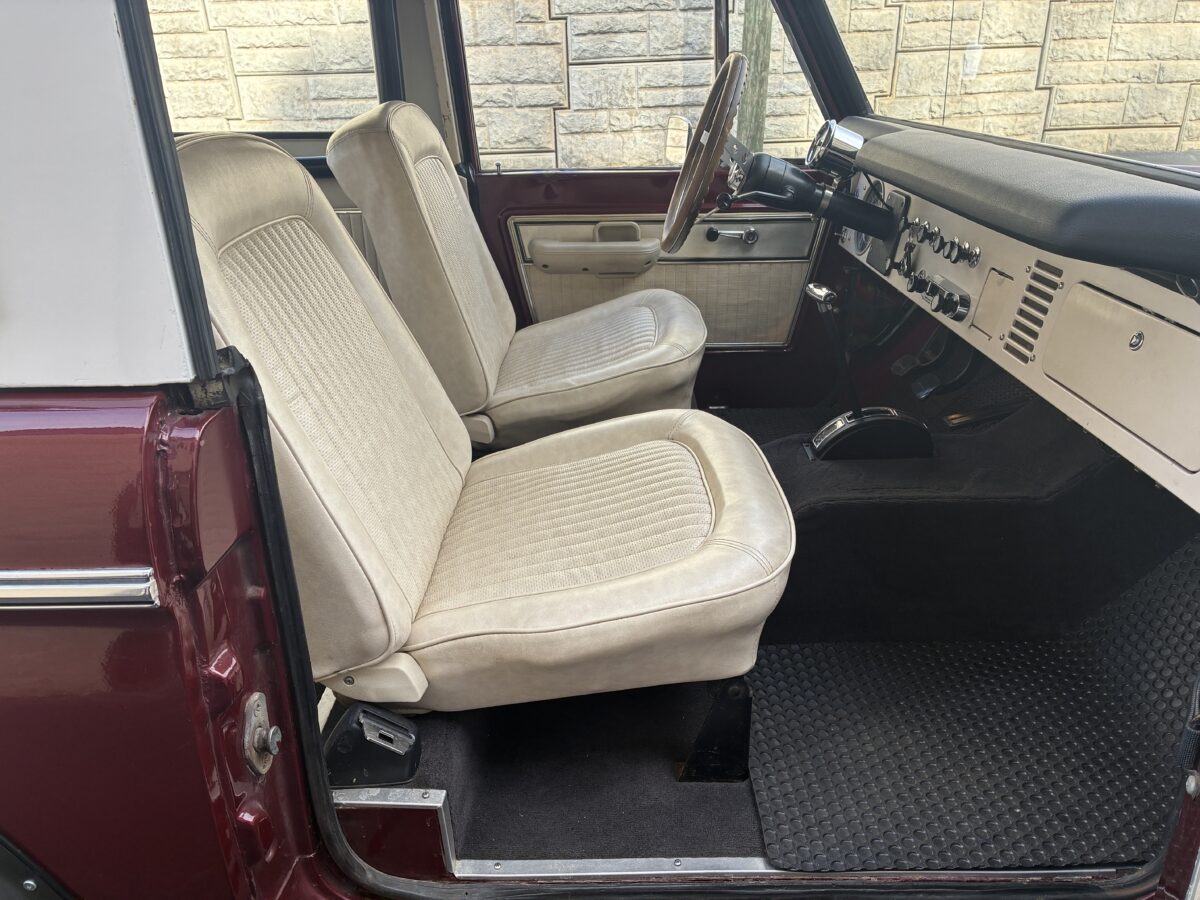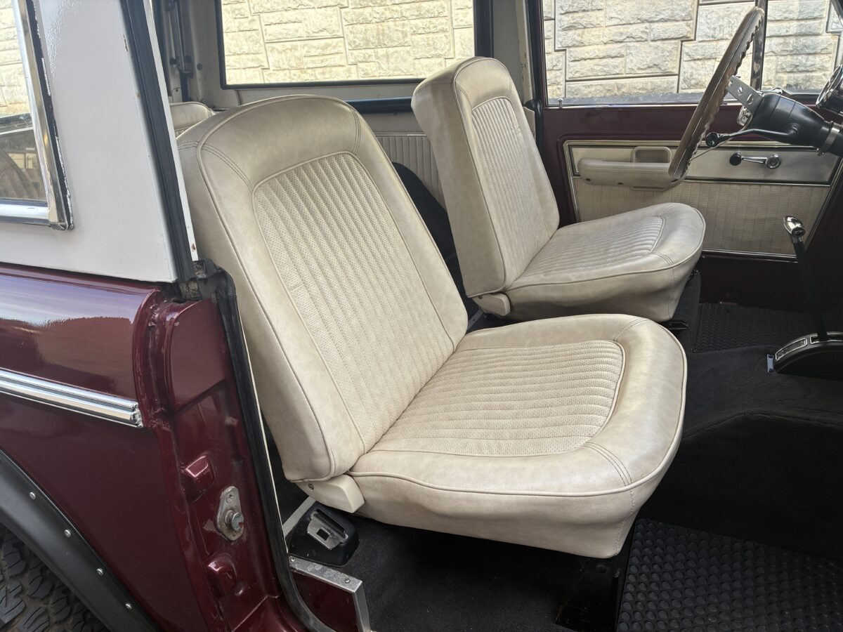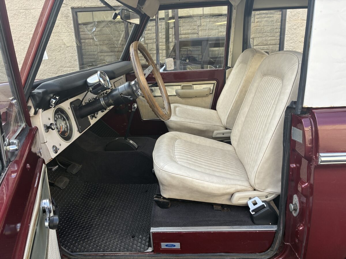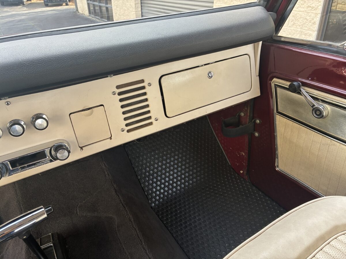 Complimenting the Royal Maroon Metallic exterior is a very nice Parchment white interior. Original front bucket seats and original rear bench seat look great with barely any wear. Nicely updated with rear TBP (Toms Bronco Parts) Quarter Panel Inserts (for soft top), TBP Premium Charcoal Carpet Kit, TBP Full cab floorboard insulation kit, TBP Quarter panel and wheel well insulation kit, a RetroSound Huntington radio w/Bluetooth and dual coil direct fit dash speaker (no cutting of the dash with this installation!!). Added tach on the column and aftermarket Woodgrain steering wheel. All Gauges work including both fuel tanks with auxiliary tank switch. Still has manual choke that works. Front and rear seat belts and a nice roll bar were installed. Some chips in the paint on the inner doors and small dent on top of inner drivers side door missing some paint. Overall the interior looks great and has some great features. Have a look: