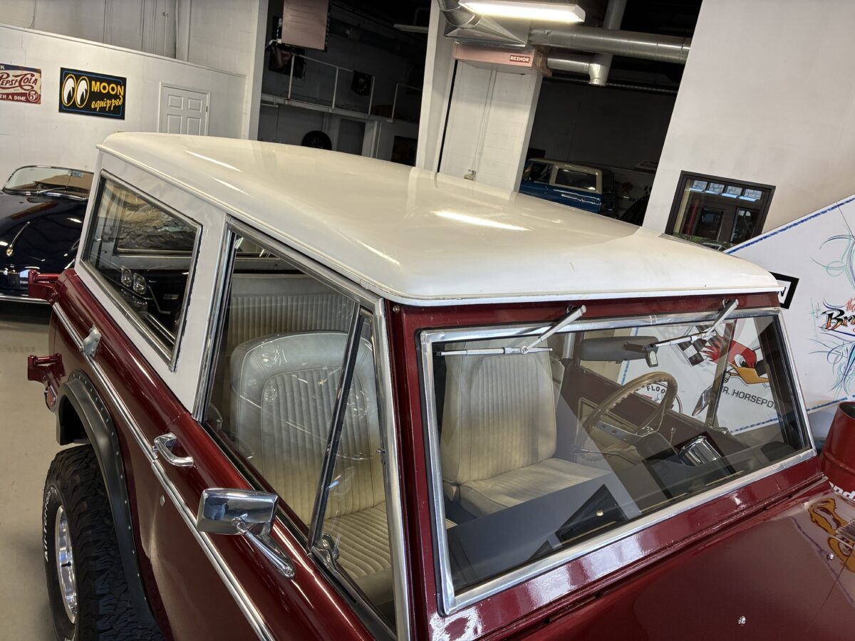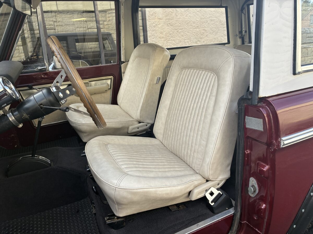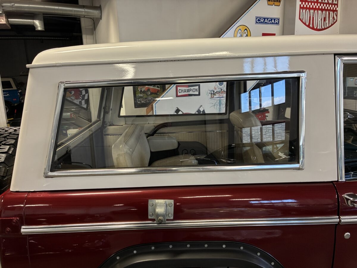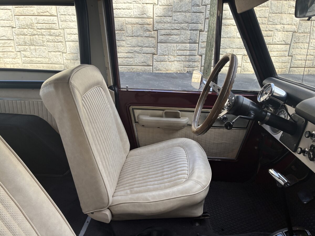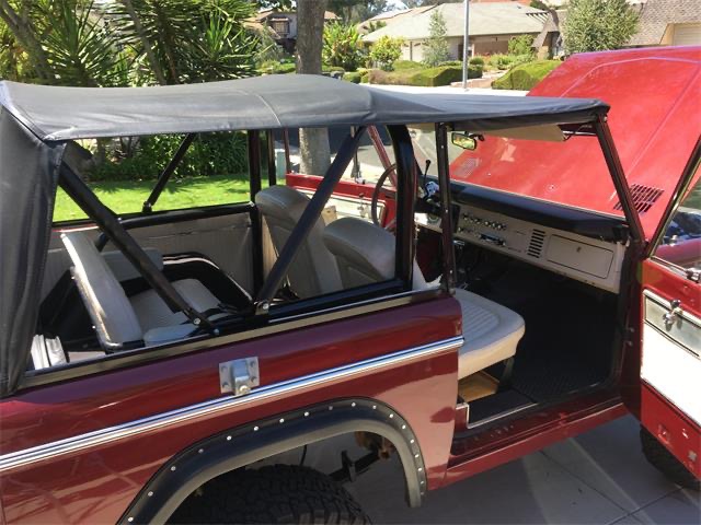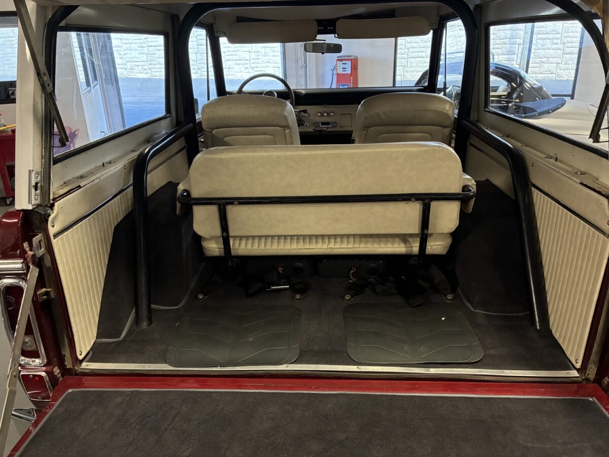 Complimenting the Royal Maroon Metallic exterior is a very nice Parchment white interior. Original front bucket seats and original rear bench seat look great with barely any wear. Nicely updated with rear TBP (Toms Bronco Parts) Quarter Panel Inserts (for soft top), TBP Premium Charcoal Carpet Kit, TBP Full cab floorboard insulation kit, TBP Quarter panel and wheel well insulation kit, a RetroSound Huntington radio w/Bluetooth and dual coil direct fit dash speaker (no cutting of the dash with this installation!!). Added tach on the column and aftermarket Woodgrain steering wheel. All Gauges work including both fuel tanks with auxiliary tank switch. Still has manual choke that works. Front and rear seat belts and a nice roll bar were installed. Some chips in the paint on the inner doors and small dent on top of inner drivers side door missing some paint. Overall the interior looks great and has some great features. Have a look: