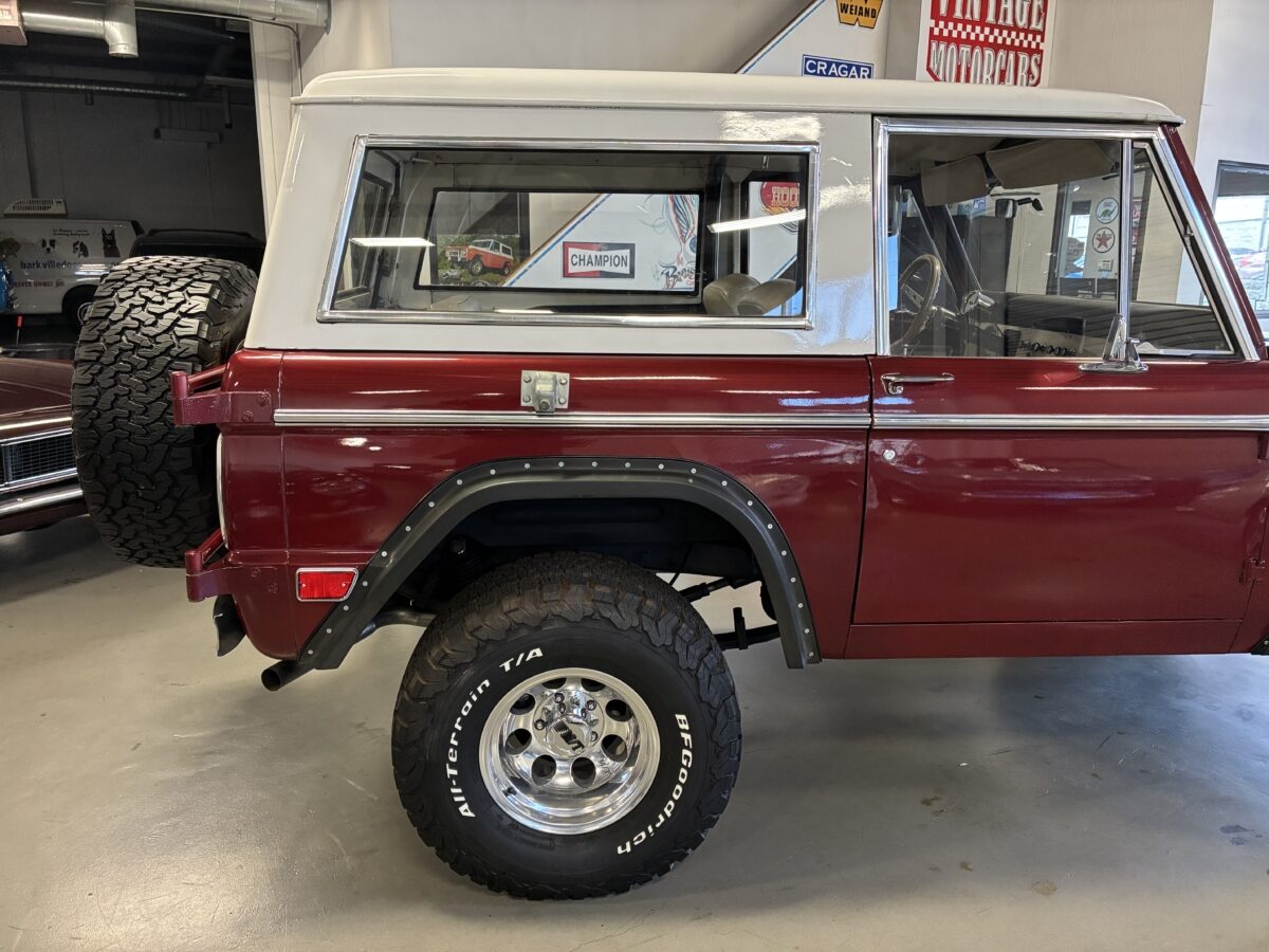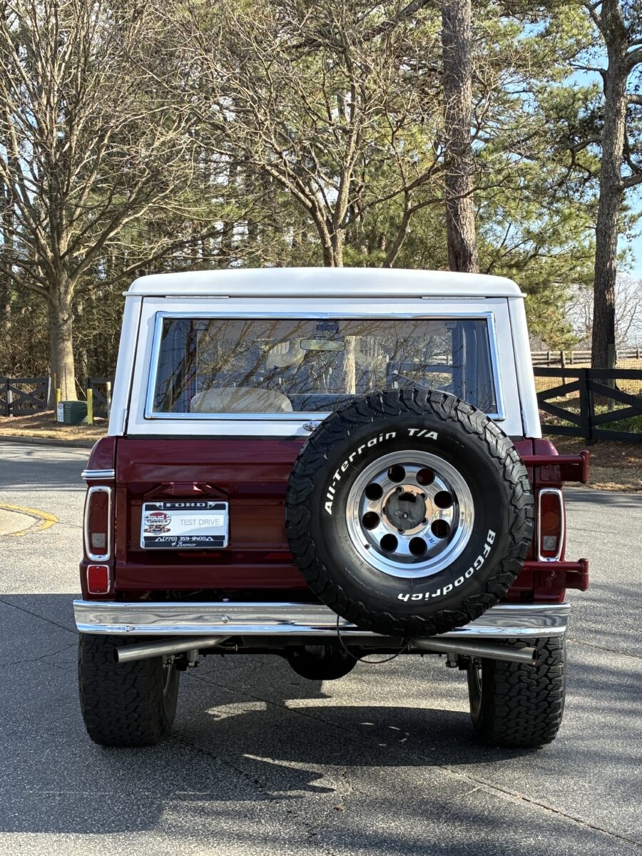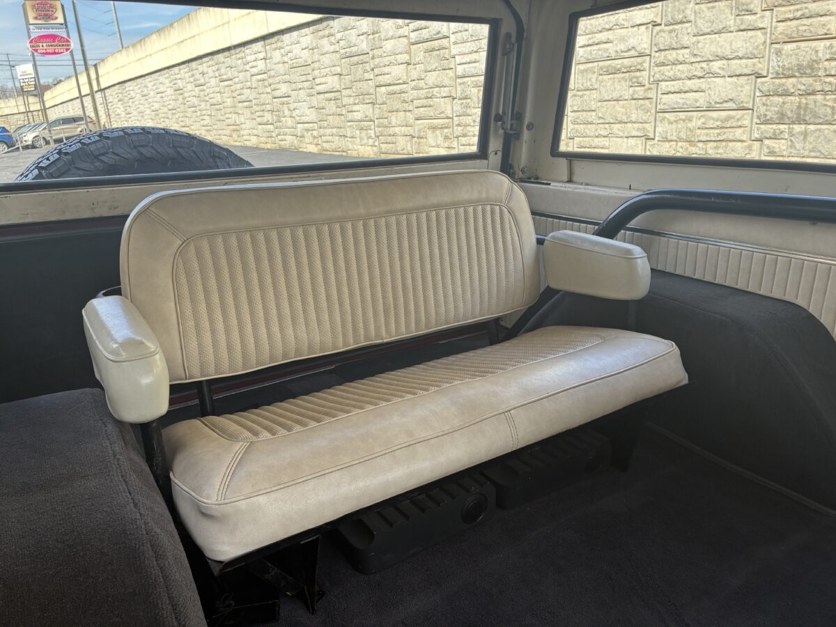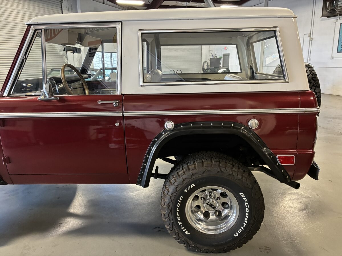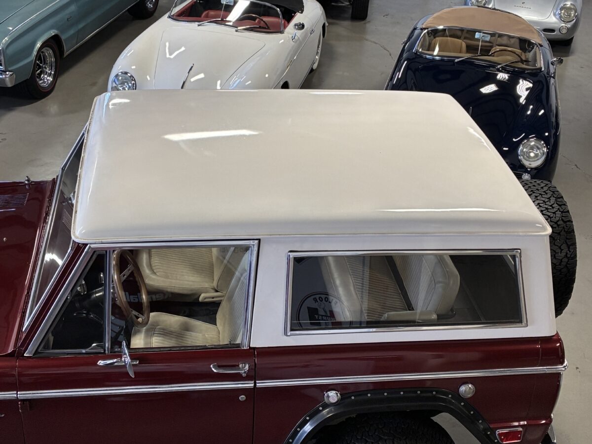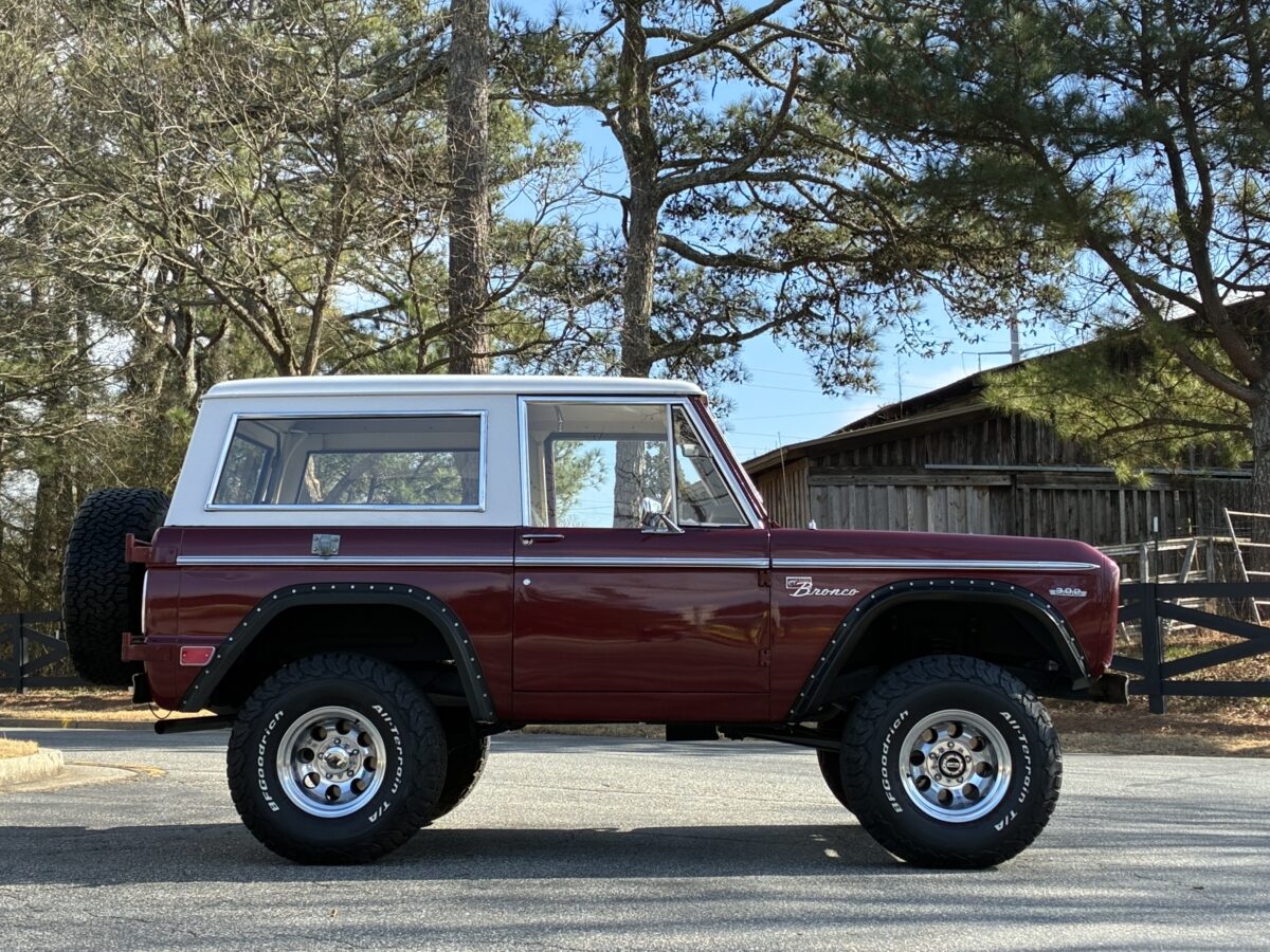 Complimenting the Royal Maroon Metallic exterior is a very nice Parchment white interior. Original front bucket seats and original rear bench seat look great with barely any wear. Nicely updated with rear TBP (Toms Bronco Parts) Quarter Panel Inserts (for soft top), TBP Premium Charcoal Carpet Kit, TBP Full cab floorboard insulation kit, TBP Quarter panel and wheel well insulation kit, a RetroSound Huntington radio w/Bluetooth and dual coil direct fit dash speaker (no cutting of the dash with this installation!!). Added tach on the column and aftermarket Woodgrain steering wheel. All Gauges work including both fuel tanks with auxiliary tank switch. Still has manual choke that works. Front and rear seat belts and a nice roll bar were installed. Some chips in the paint on the inner doors and small dent on top of inner drivers side door missing some paint. Overall the interior looks great and has some great features. Have a look: