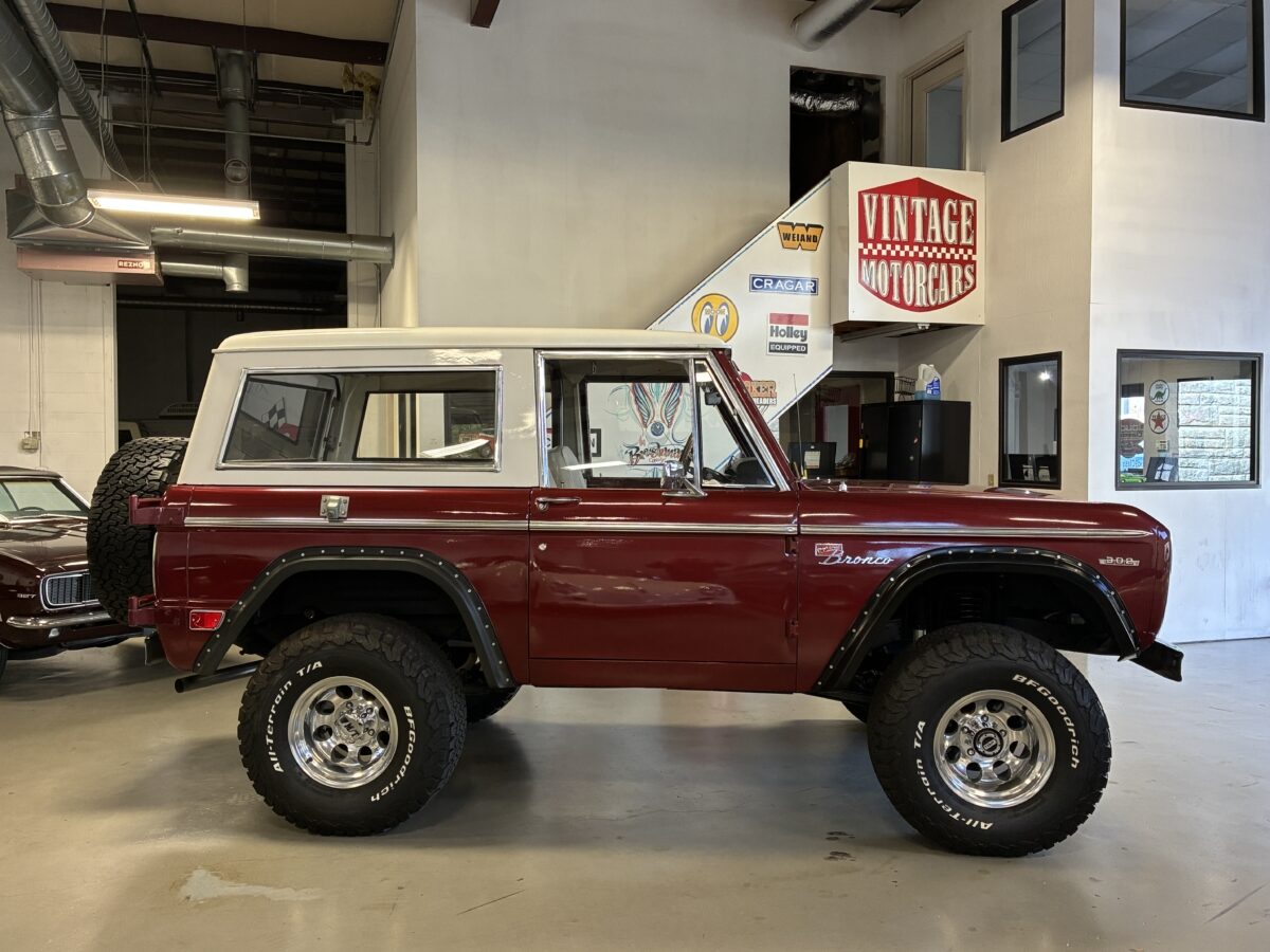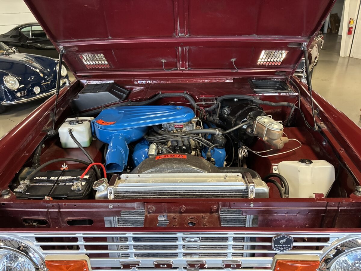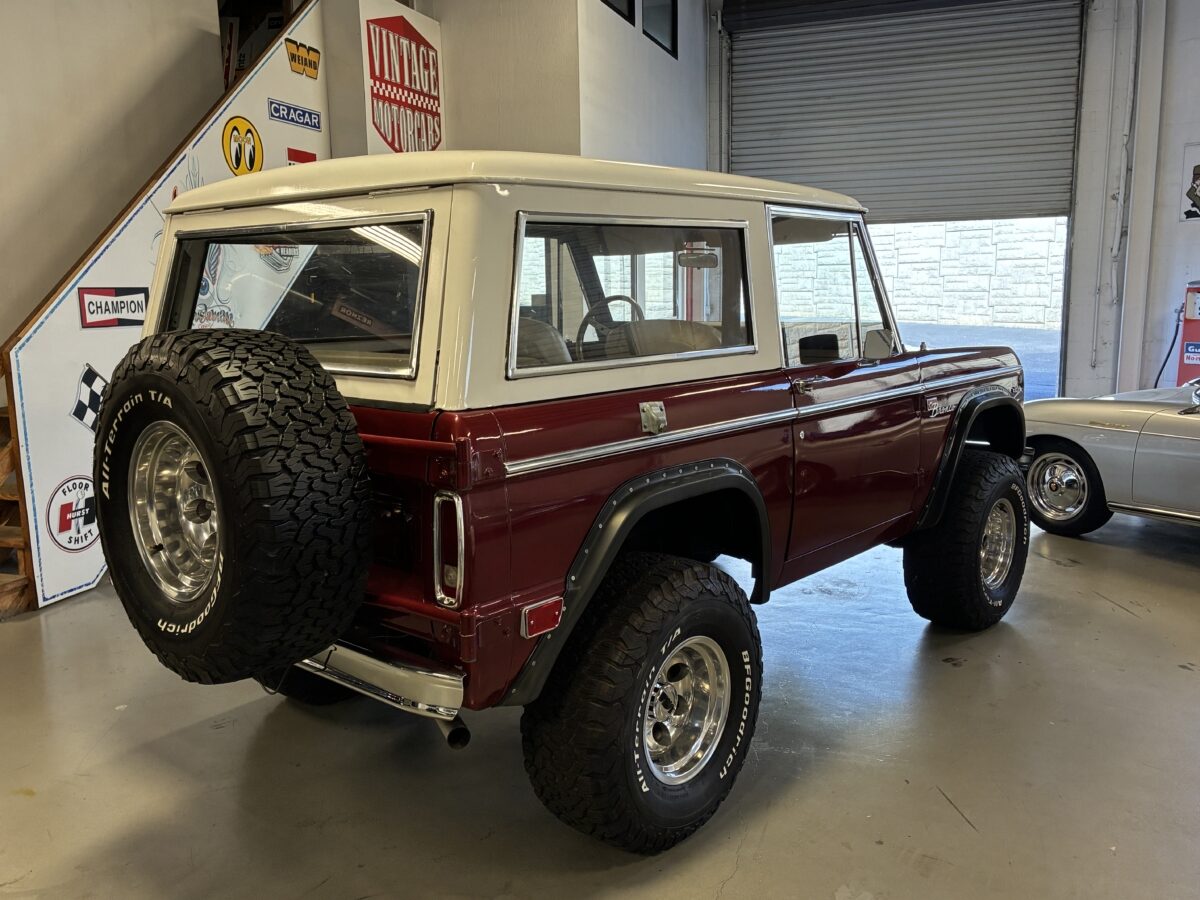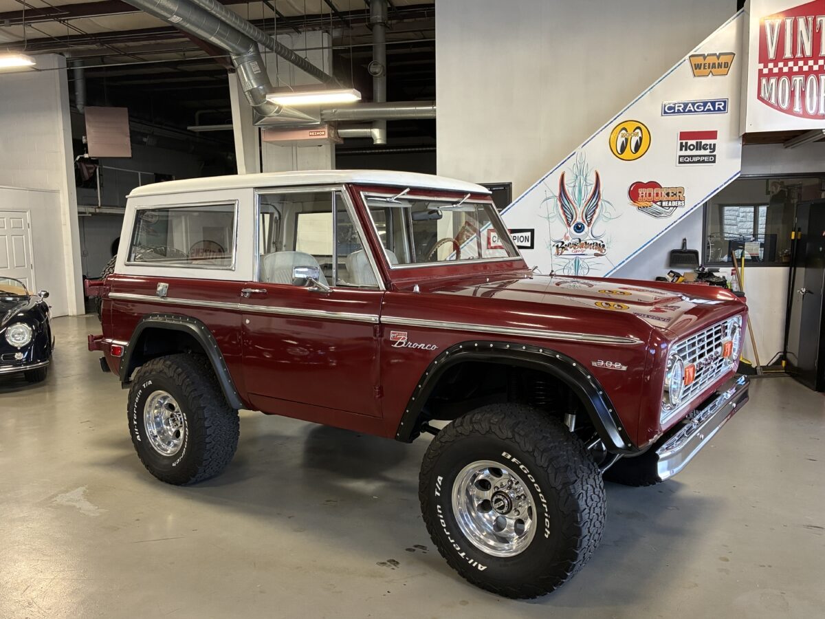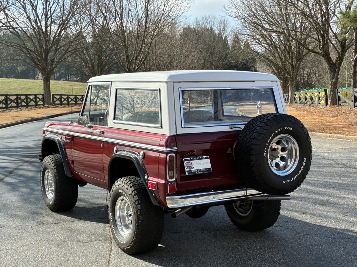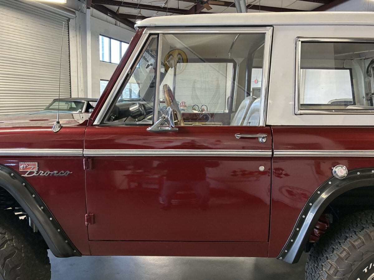 Complimenting the Royal Maroon Metallic exterior is a very nice Parchment white interior. Original front bucket seats and original rear bench seat look great with barely any wear. Nicely updated with rear TBP (Toms Bronco Parts) Quarter Panel Inserts (for soft top), TBP Premium Charcoal Carpet Kit, TBP Full cab floorboard insulation kit, TBP Quarter panel and wheel well insulation kit, a RetroSound Huntington radio w/Bluetooth and dual coil direct fit dash speaker (no cutting of the dash with this installation!!). Added tach on the column and aftermarket Woodgrain steering wheel. All Gauges work including both fuel tanks with auxiliary tank switch. Still has manual choke that works. Front and rear seat belts and a nice roll bar were installed. Some chips in the paint on the inner doors and small dent on top of inner drivers side door missing some paint. Overall the interior looks great and has some great features. Have a look: