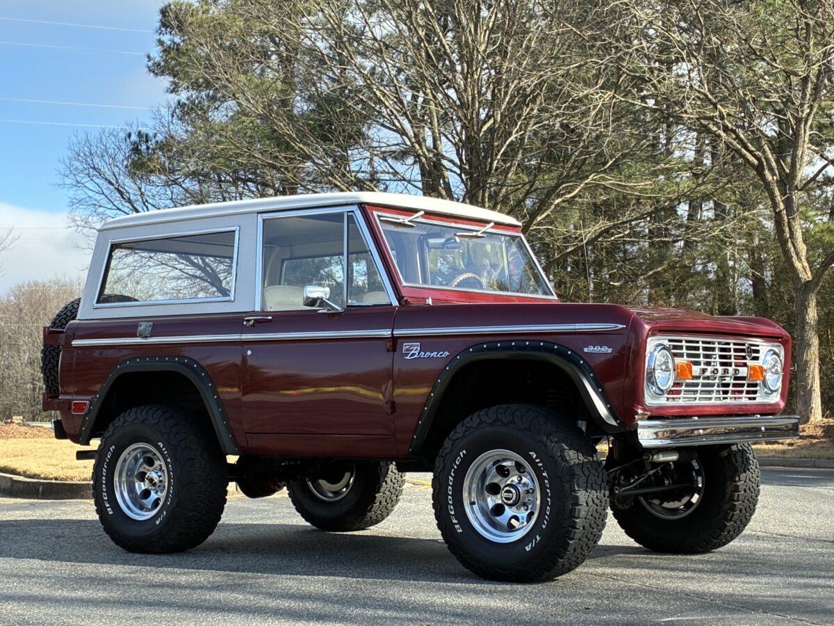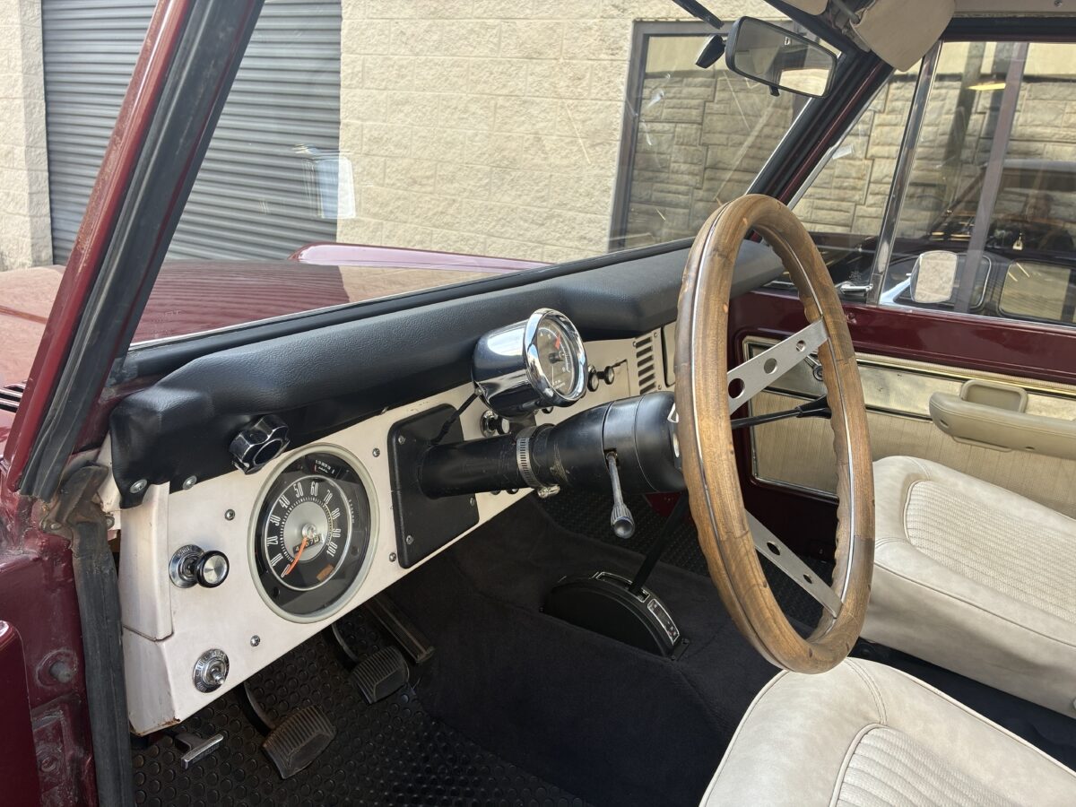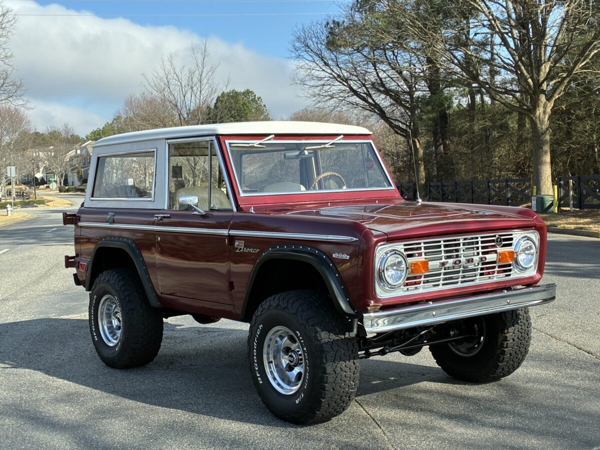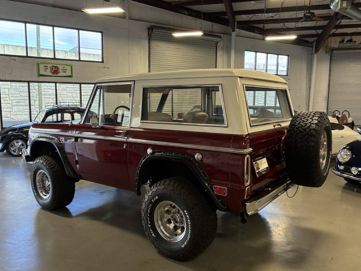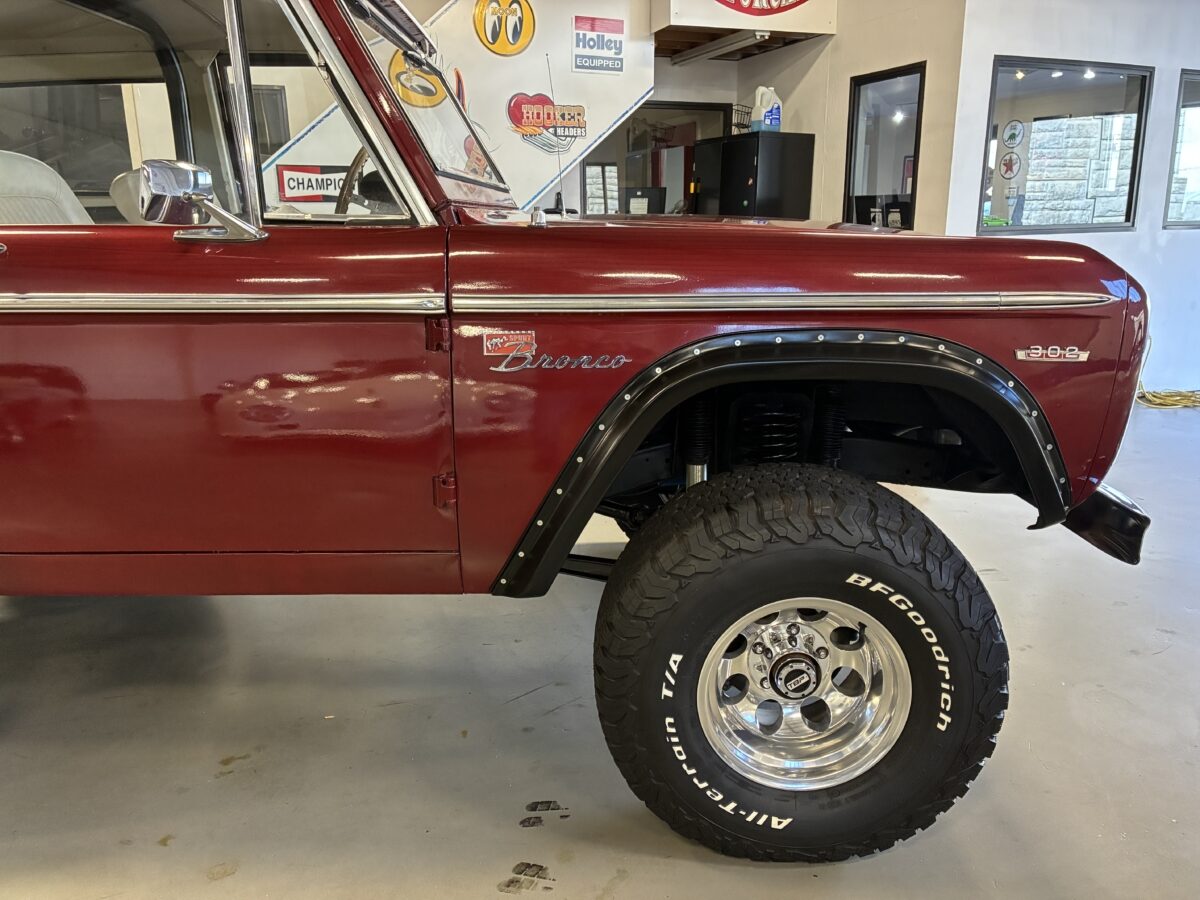Complimenting the Royal Maroon Metallic exterior is a very nice Parchment white interior. Original front bucket seats and original rear bench seat look great with barely any wear. Nicely updated with rear TBP (Toms Bronco Parts) Quarter Panel Inserts (for soft top), TBP Premium Charcoal Carpet Kit, TBP Full cab floorboard insulation kit, TBP Quarter panel and wheel well insulation kit, a RetroSound Huntington radio w/Bluetooth and dual coil direct fit dash speaker (no cutting of the dash with this installation!!). Added tach on the column and aftermarket Woodgrain steering wheel. All Gauges work including both fuel tanks with auxiliary tank switch. Still has manual choke that works. Front and rear seat belts and a nice roll bar were installed. Some chips in the paint on the inner doors and small dent on top of inner drivers side door missing some paint. Overall the interior looks great and has some great features. Have a look:
