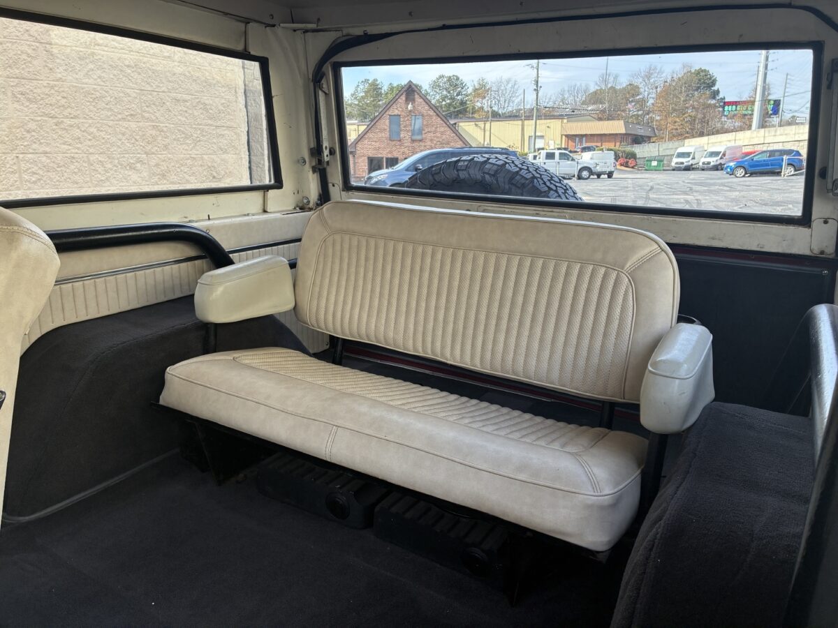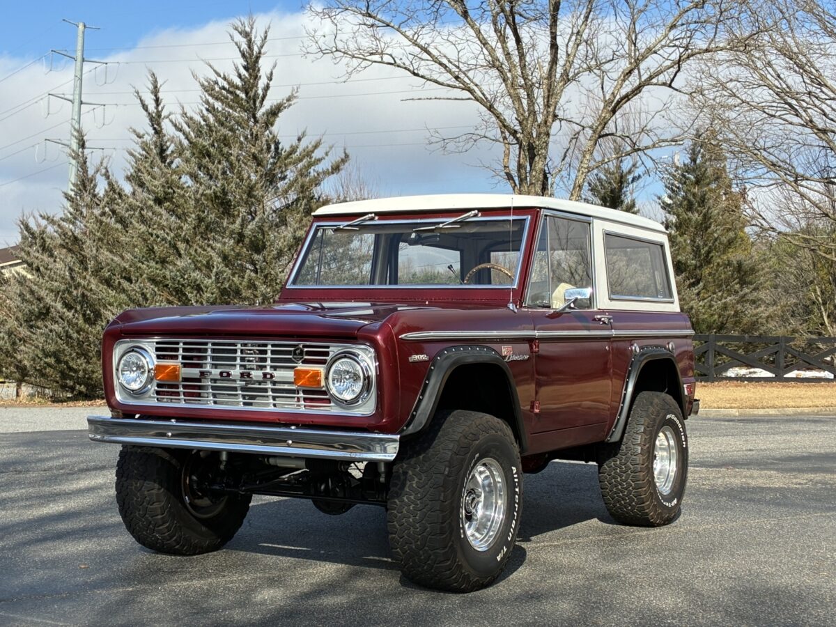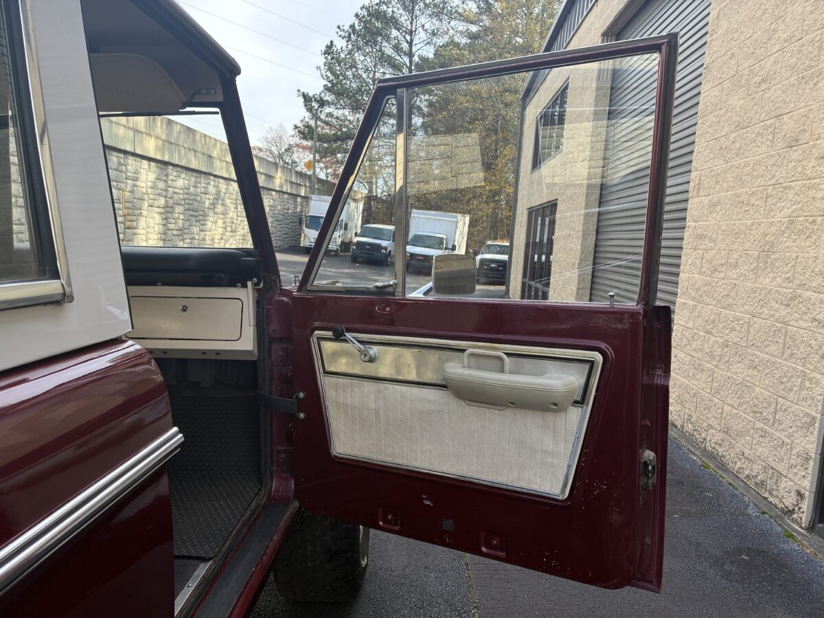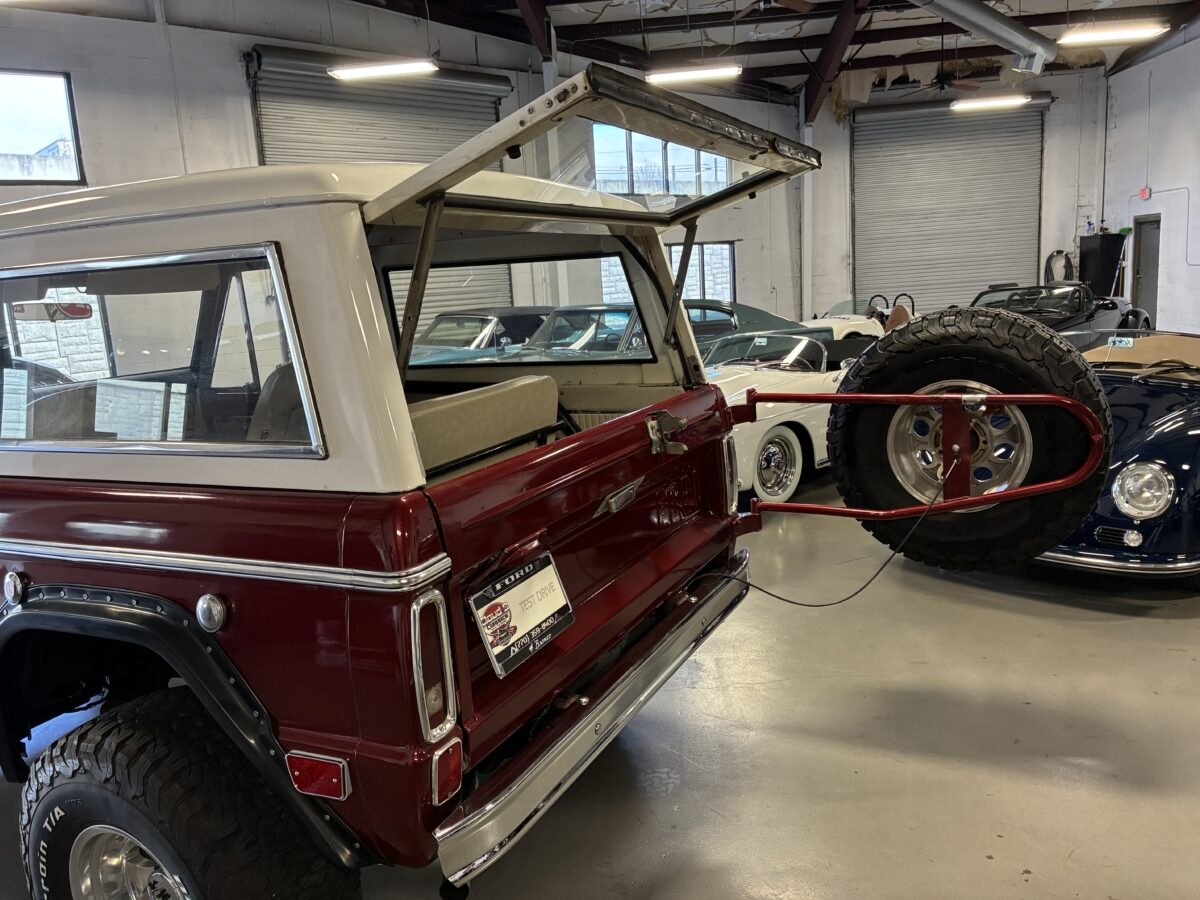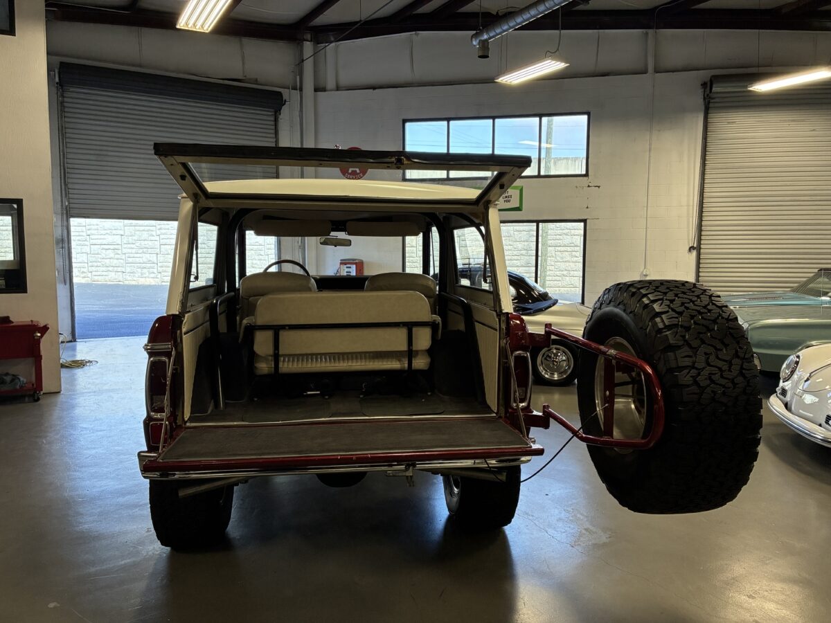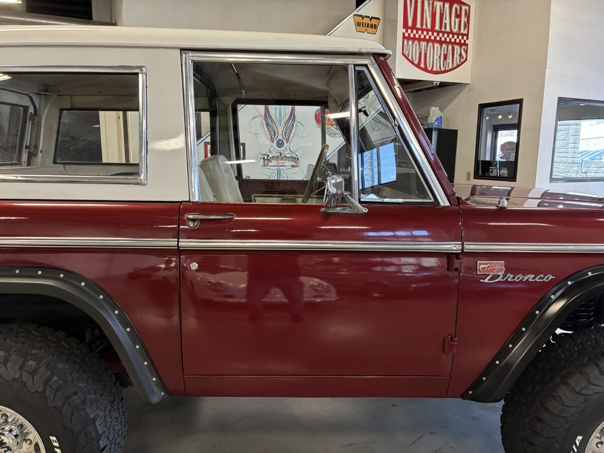Complimenting the Royal Maroon Metallic exterior is a very nice Parchment white interior. Original front bucket seats and original rear bench seat look great with barely any wear. Nicely updated with rear TBP (Toms Bronco Parts) Quarter Panel Inserts (for soft top), TBP Premium Charcoal Carpet Kit, TBP Full cab floorboard insulation kit, TBP Quarter panel and wheel well insulation kit, a RetroSound Huntington radio w/Bluetooth and dual coil direct fit dash speaker (no cutting of the dash with this installation!!). Added tach on the column and aftermarket Woodgrain steering wheel. All Gauges work including both fuel tanks with auxiliary tank switch. Still has manual choke that works. Front and rear seat belts and a nice roll bar were installed. Some chips in the paint on the inner doors and small dent on top of inner drivers side door missing some paint. Overall the interior looks great and has some great features. Have a look: