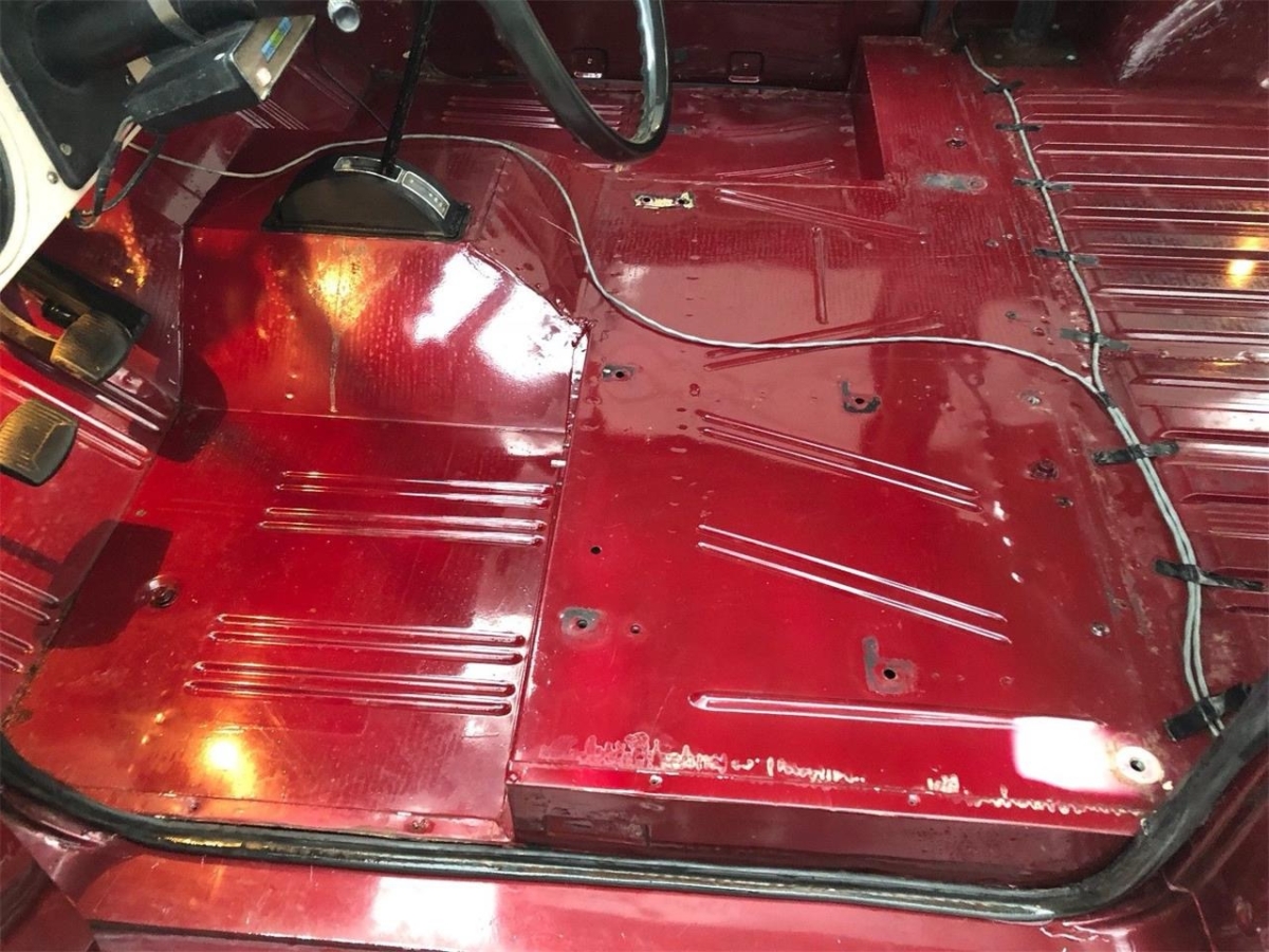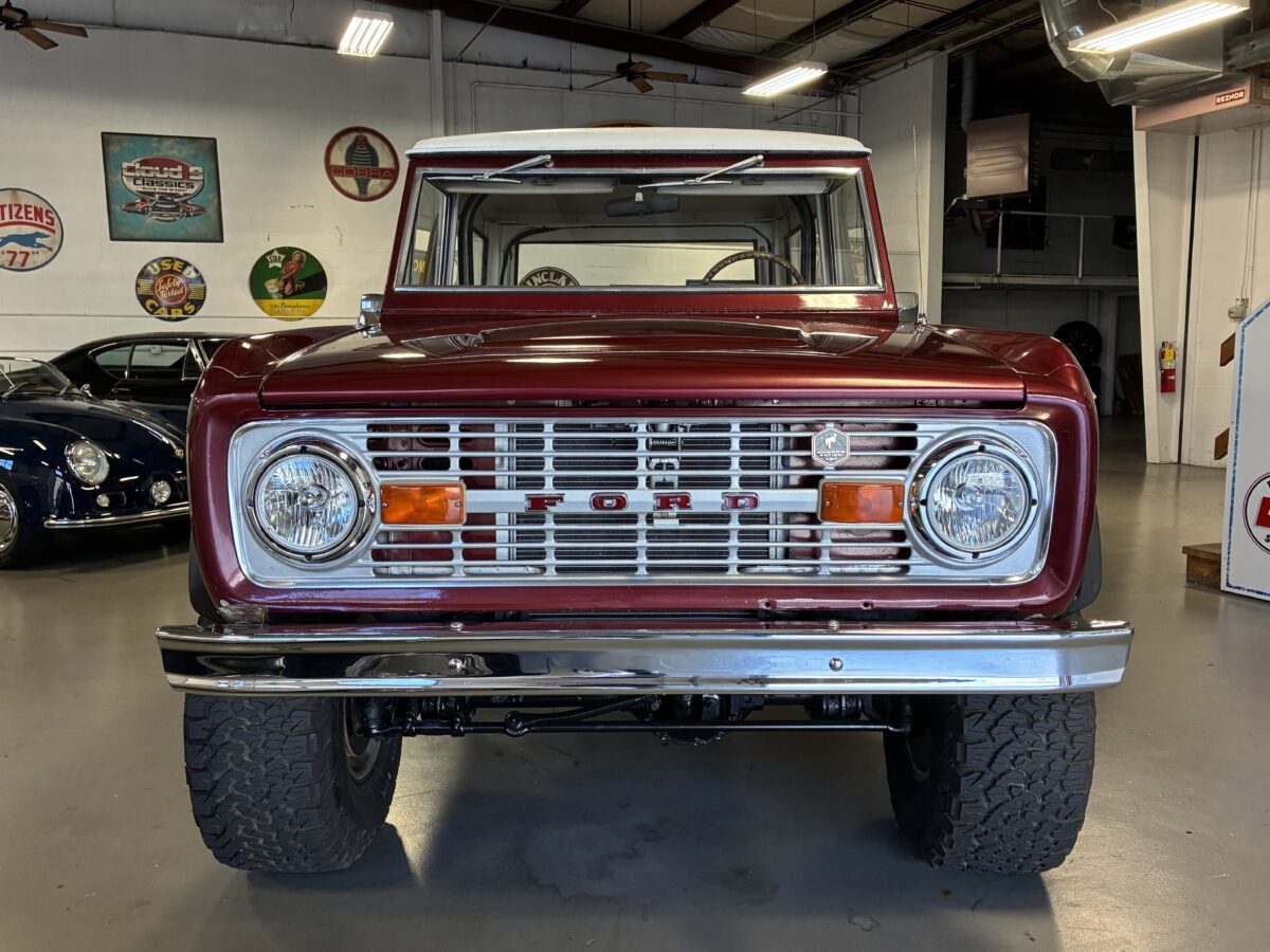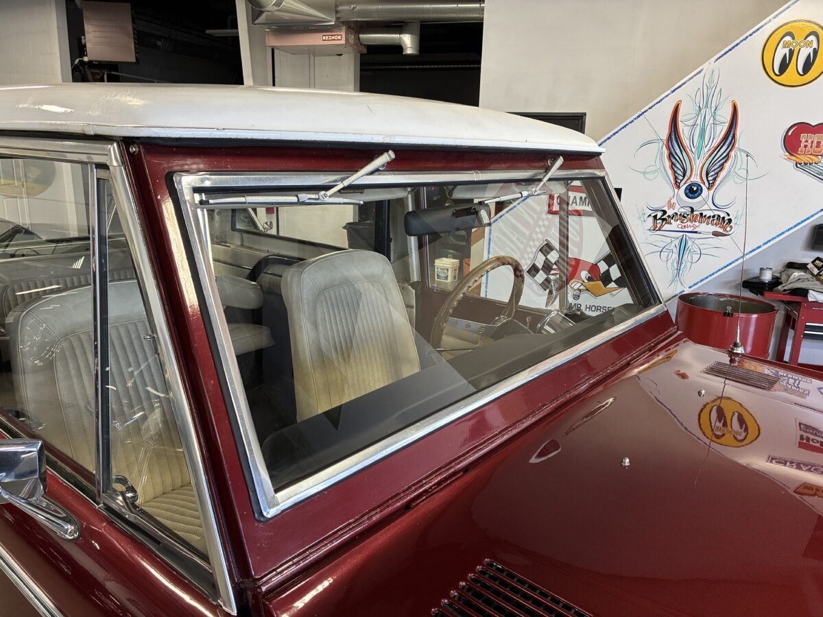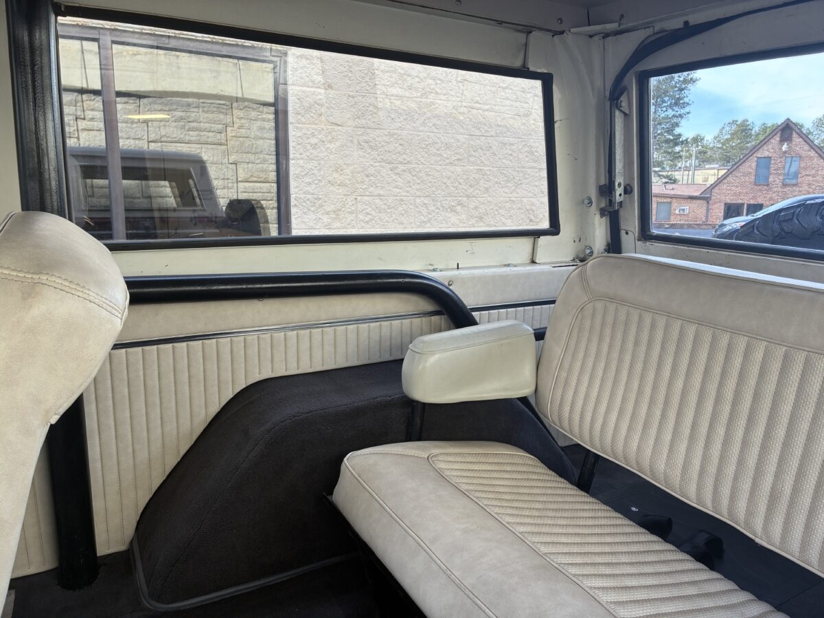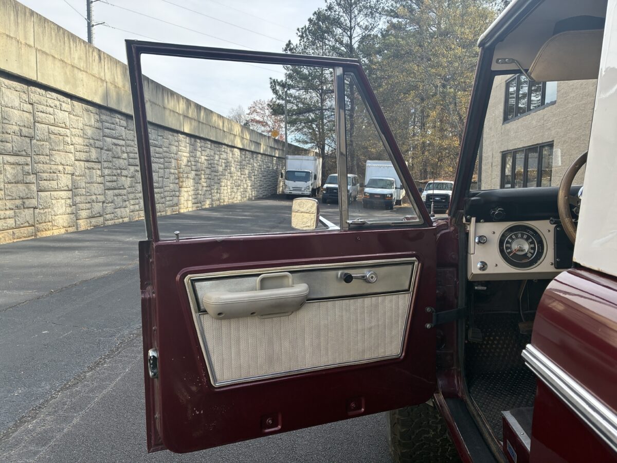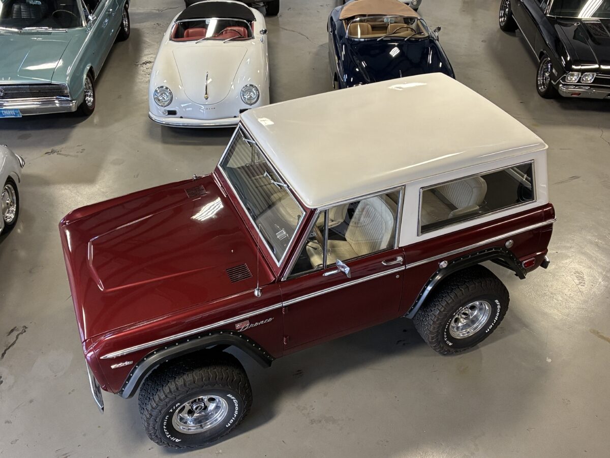 Complimenting the Royal Maroon Metallic exterior is a very nice Parchment white interior. Original front bucket seats and original rear bench seat look great with barely any wear. Nicely updated with rear TBP (Toms Bronco Parts) Quarter Panel Inserts (for soft top), TBP Premium Charcoal Carpet Kit, TBP Full cab floorboard insulation kit, TBP Quarter panel and wheel well insulation kit, a RetroSound Huntington radio w/Bluetooth and dual coil direct fit dash speaker (no cutting of the dash with this installation!!). Added tach on the column and aftermarket Woodgrain steering wheel. All Gauges work including both fuel tanks with auxiliary tank switch. Still has manual choke that works. Front and rear seat belts and a nice roll bar were installed. Some chips in the paint on the inner doors and small dent on top of inner drivers side door missing some paint. Overall the interior looks great and has some great features. Have a look: