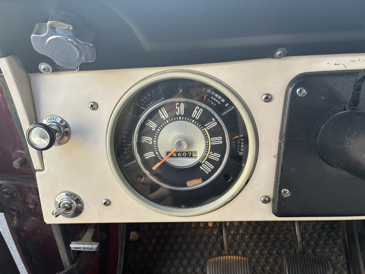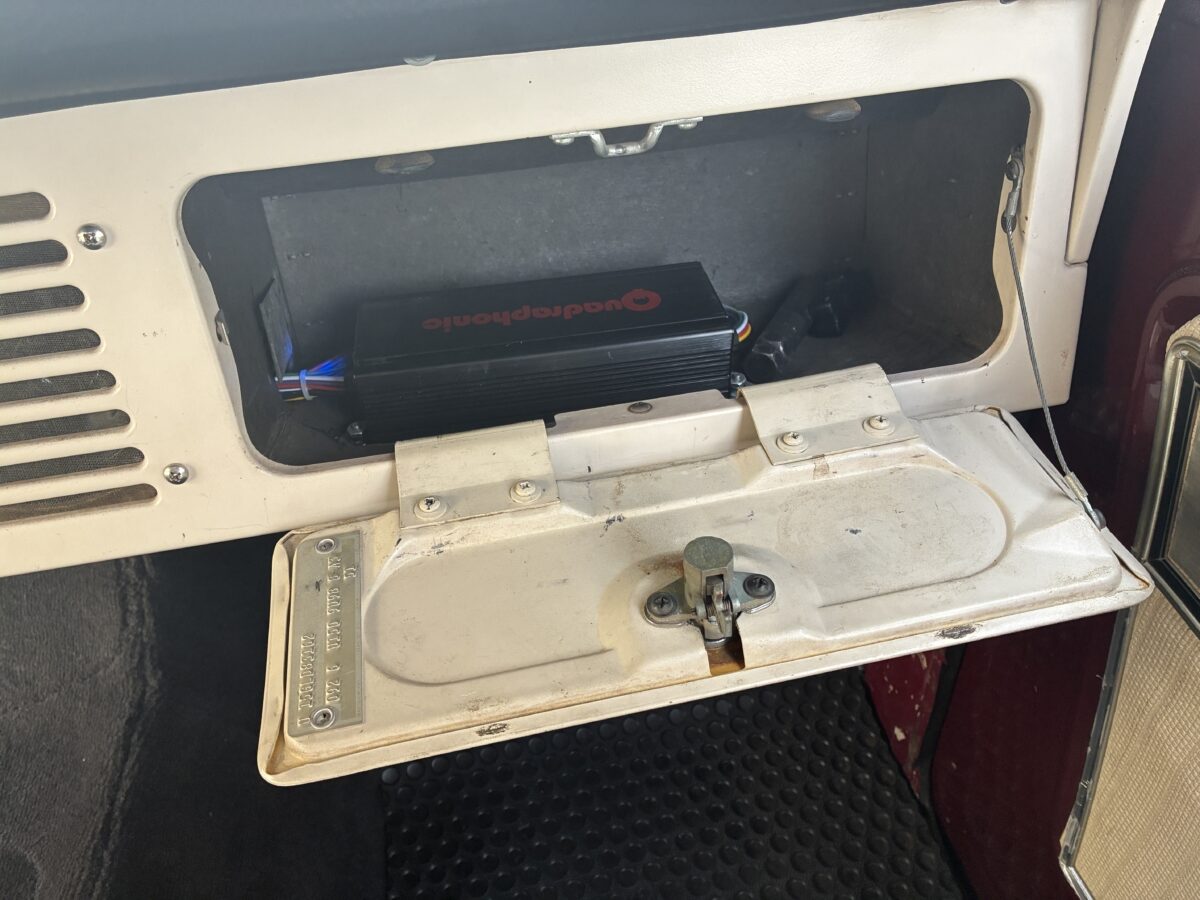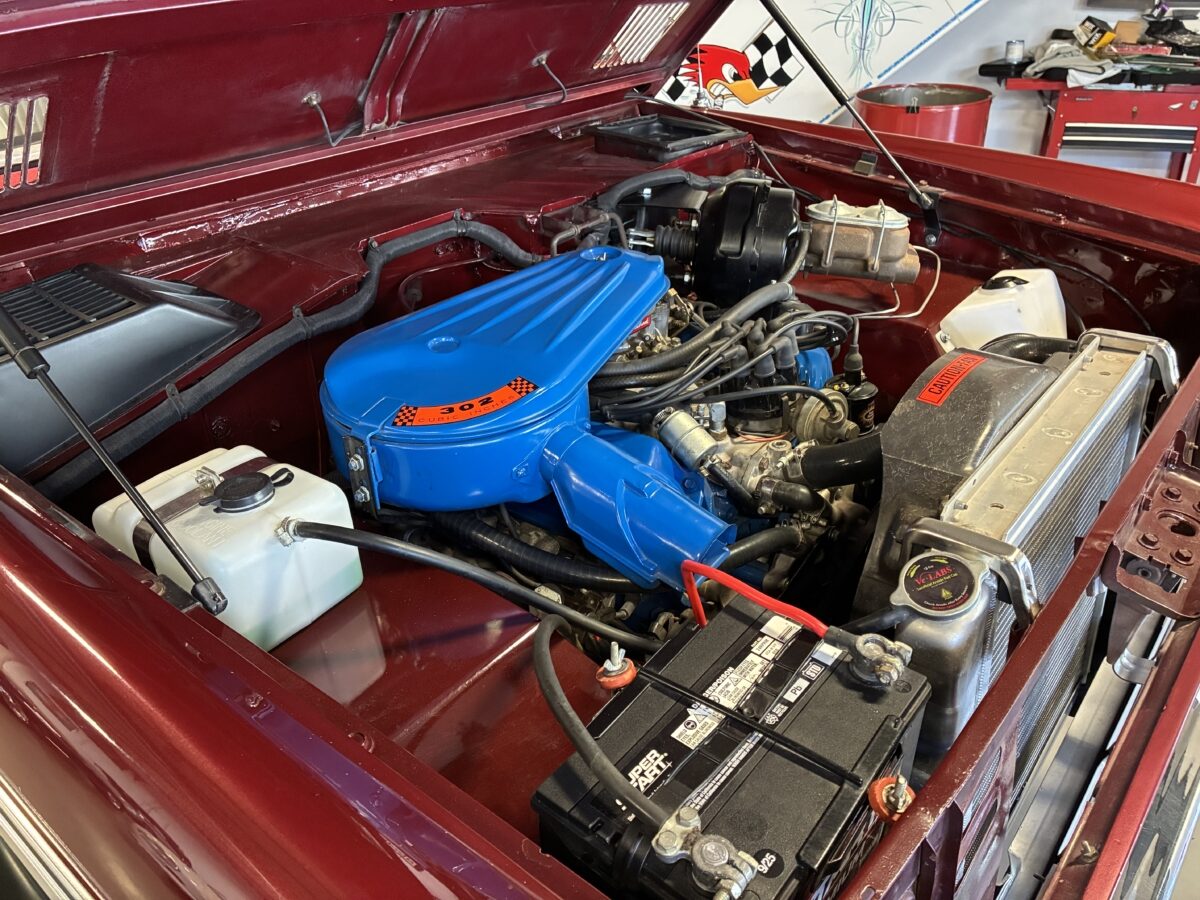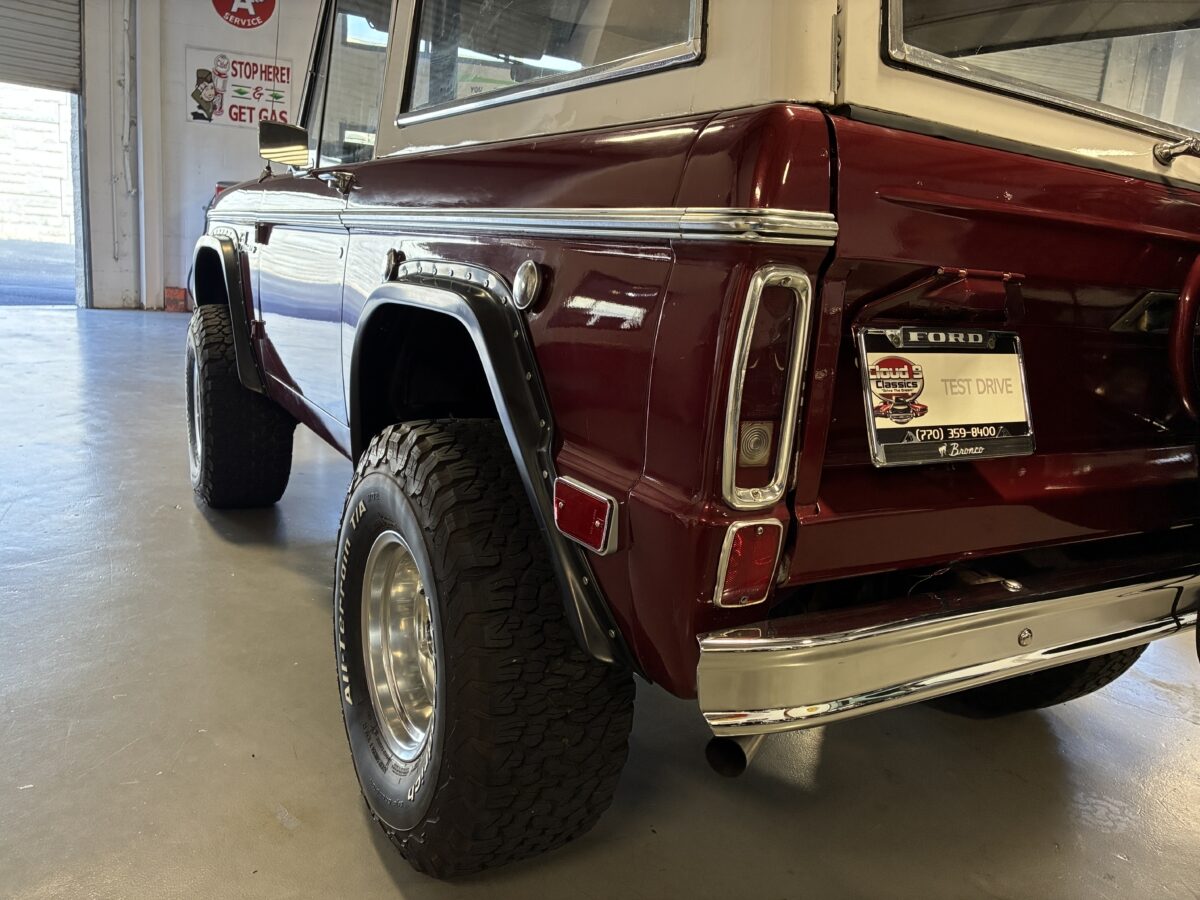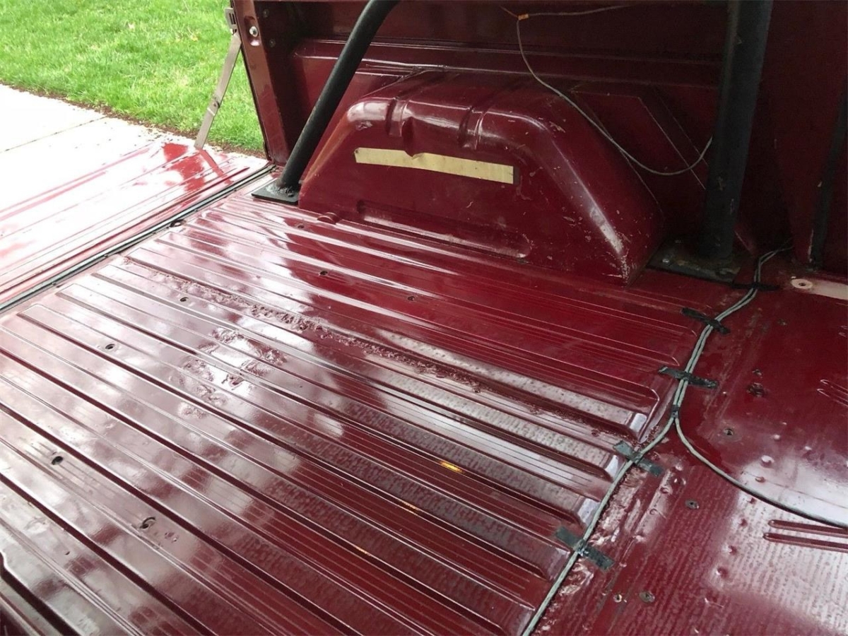 Complimenting the Royal Maroon Metallic exterior is a very nice Parchment white interior. Original front bucket seats and original rear bench seat look great with barely any wear. Nicely updated with rear TBP (Toms Bronco Parts) Quarter Panel Inserts (for soft top), TBP Premium Charcoal Carpet Kit, TBP Full cab floorboard insulation kit, TBP Quarter panel and wheel well insulation kit, a RetroSound Huntington radio w/Bluetooth and dual coil direct fit dash speaker (no cutting of the dash with this installation!!). Added tach on the column and aftermarket Woodgrain steering wheel. All Gauges work including both fuel tanks with auxiliary tank switch. Still has manual choke that works. Front and rear seat belts and a nice roll bar were installed. Some chips in the paint on the inner doors and small dent on top of inner drivers side door missing some paint. Overall the interior looks great and has some great features. Have a look: