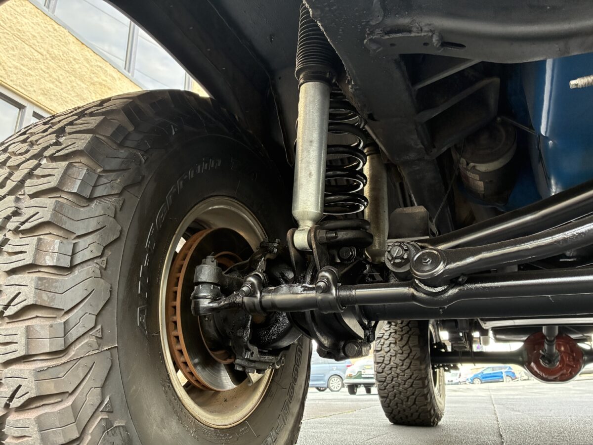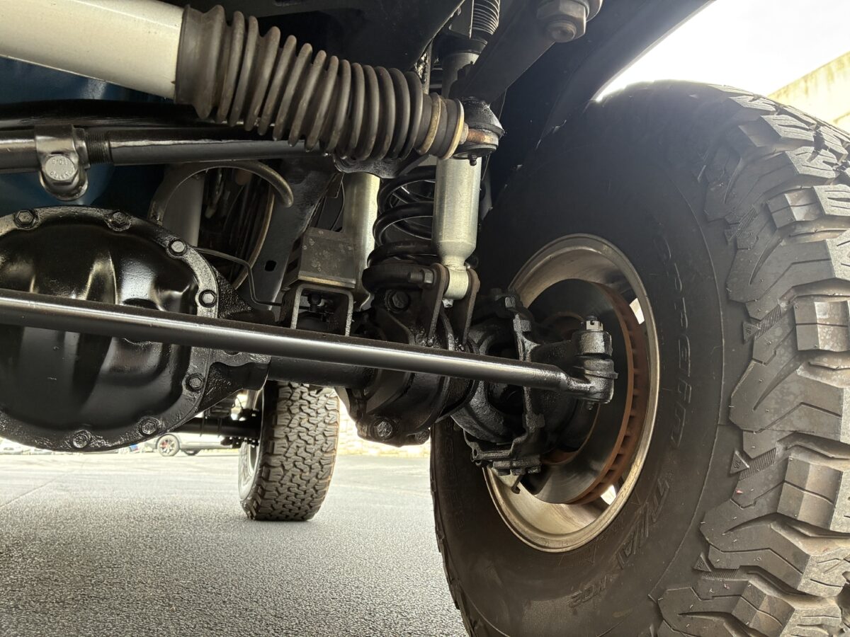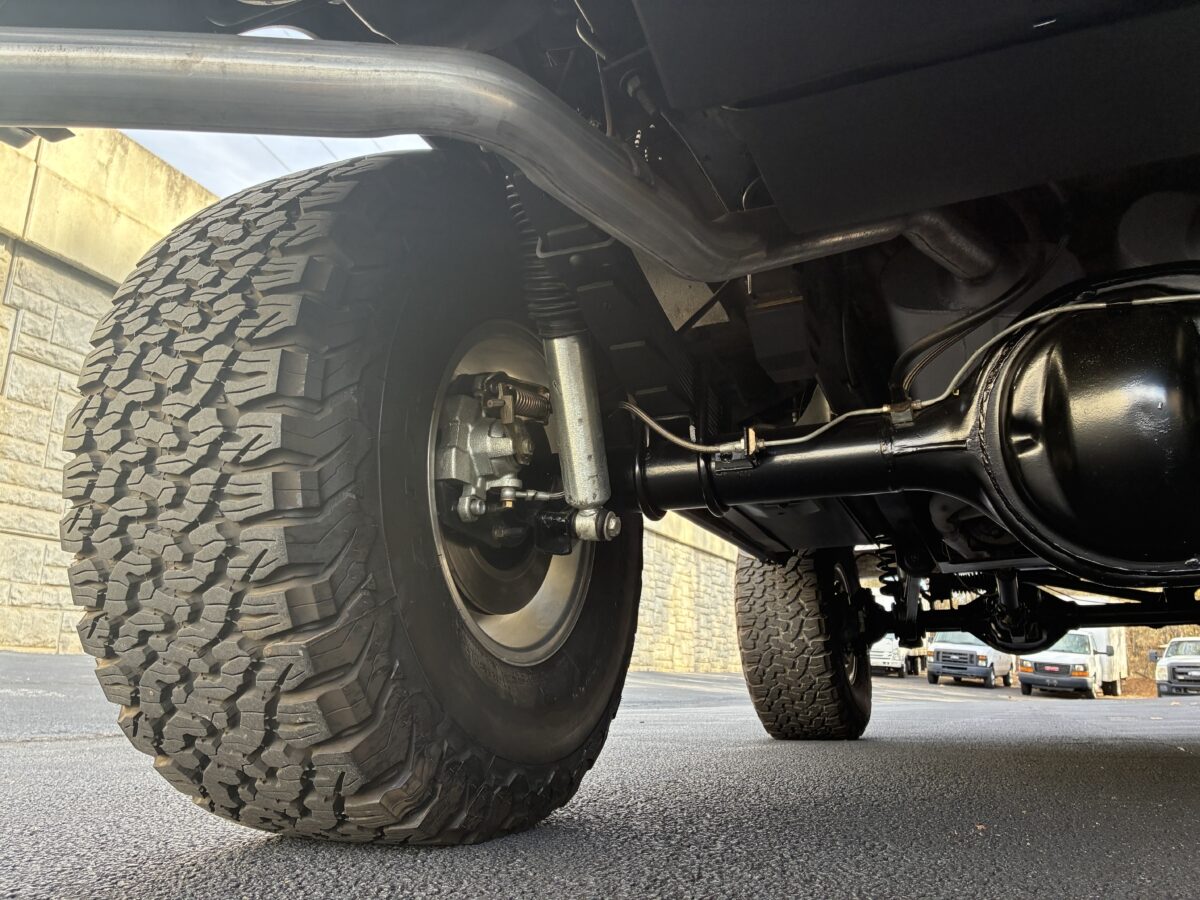 The Bronco suspension has been upgraded with Tom’s Bronco Parts 2.5” premium suspension kit. Kit includes 2.5” lift front progressive rate coil springs, 2.5” lift rear 9-pack leaf springs w/bushings & U-bolts, 14 piece C-bushing kit , 7-degree C-bushings, track bar bushings & rear radius arm bushings, front & rear extended brake hoses, driver & passenger extended e-brake cables, Bilstein 5100 series 2.5” lift shocks. All bushings have been replaced, with new adjustable track bar and track bar bushings, and HD bump stops front and rear. The steering system was completely replaced with a new TBP power steering kit, new t-style steering linkage, upper/lower steering shaft, and wood grain steering wheel. The Brake system was upgraded with TBP premium 4-wheel power disc brakes kit. The Bronco sits on a set of Mickey Thompson Classic III polished 15 x10 wheels with BFG KO2’s (33×12 50R 15 LT) tires. I have all the receipts for the work done by previous owner since 2018.