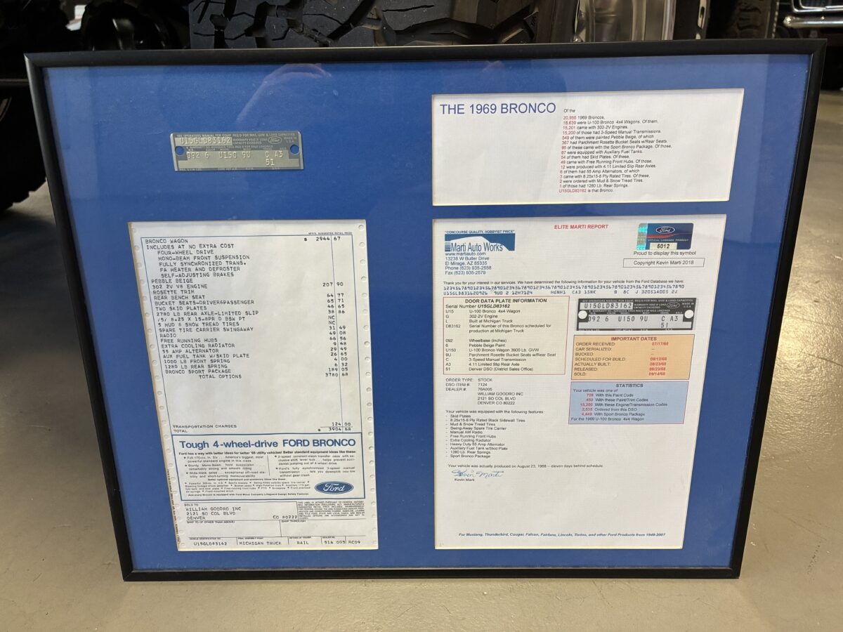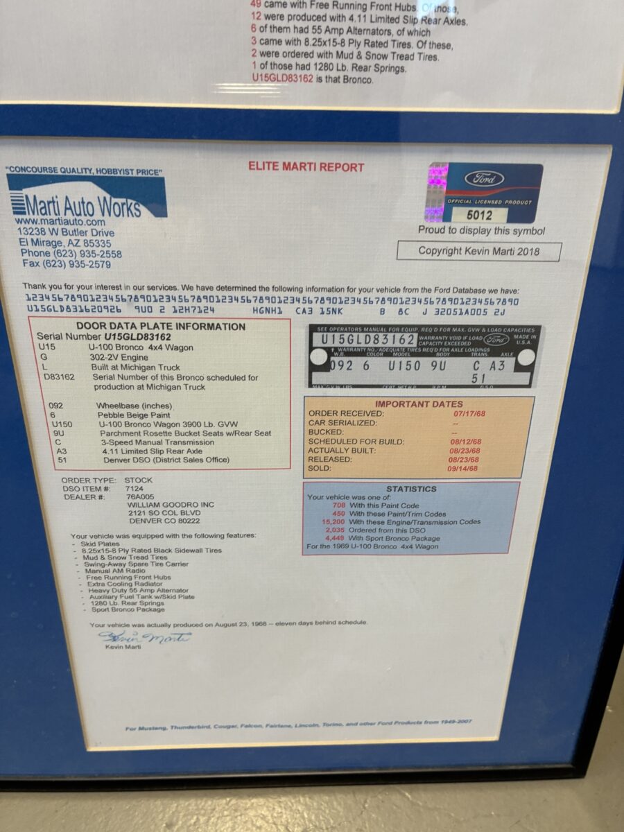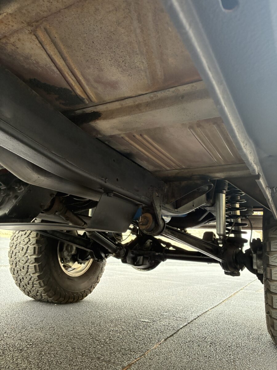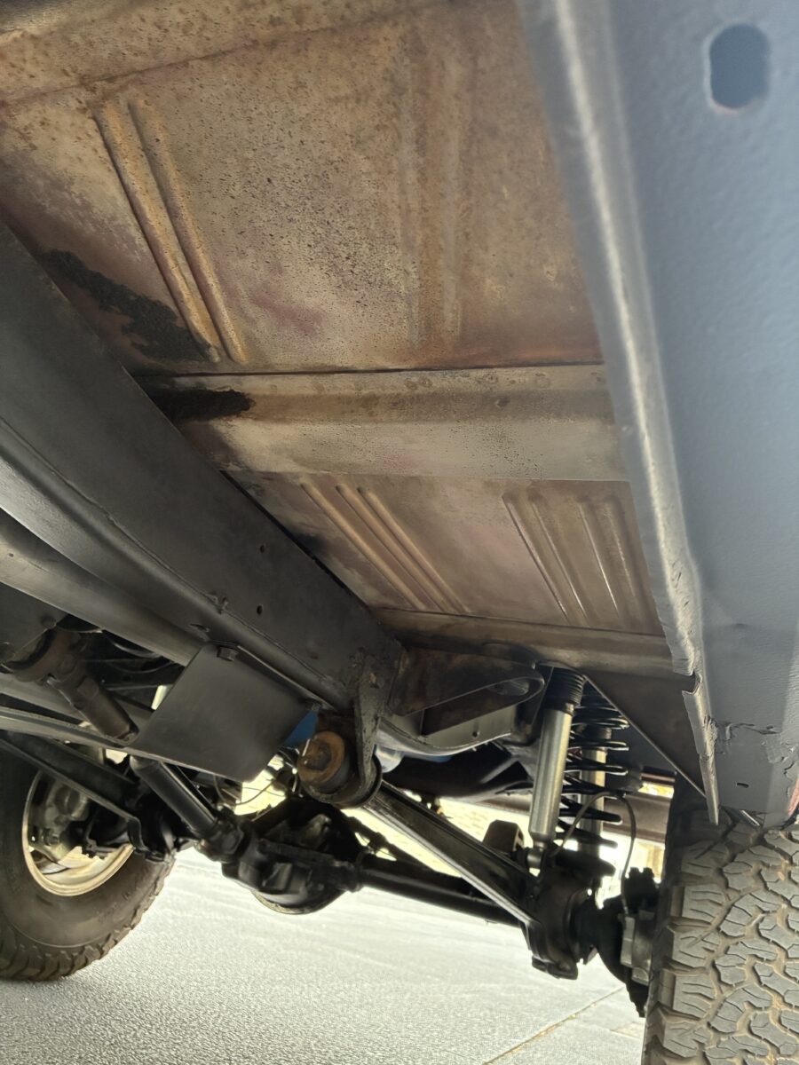 The undercarriage is very original with no rust on the underside of the body or frame. The original floor pans are super nice and retain the factory applied red-oxide primer that show no signs of repair. I have a deluxe MARTI report and all of the original keys. This Bronco was driven on a regular basis by the previous owner and only has about 1000 miles on it since the engine and suspension work were completed.