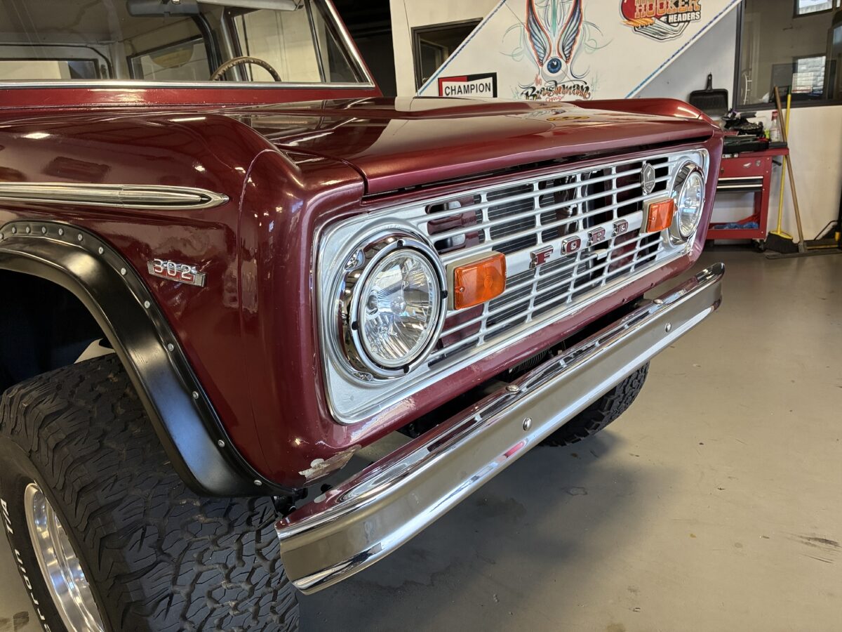 As you will see in the pics this Royal Maroon Metallic ’69 Bronco has great eye appeal. This is a Bronco Sport which means it got the additional chrome trim around the windshield, window frames and hard top windows and the Sport Emblems. This one also has the body side moldings. Body panels appear to be all original with the fenders cut for fender flares at some point. Previous owner bought it in 2018 and believes it only had 2-3 owners before him and was repainted about 25 years ago. The color was changed from the original Pebble Beige color and there are no signs of the original color that I could find. There are some dings, chips and paint blemishes along the body as you would expect from a Bronco that was driven and enjoyed and not a trailer queen. Small dents under the front grill that are barely noticeable. In my opinion this is a great Bronco for someone who wants one to drive and enjoy and take to the local shows and cruise-ins. If you prefer a show truck it would not take much to get it there with a fresh paint job and minor details. You can see the minor flaws in the video walk around tour. Previous owner installed a new black Rampage Soft top and kept the hard top stored in very nice condition. He installed the hard top for transport to me in enclosed trailer. Bumpers and trim all look great and we refreshed the gray painted grille and added a new set of Red FORD letters. Here is a walk around tour of the body: