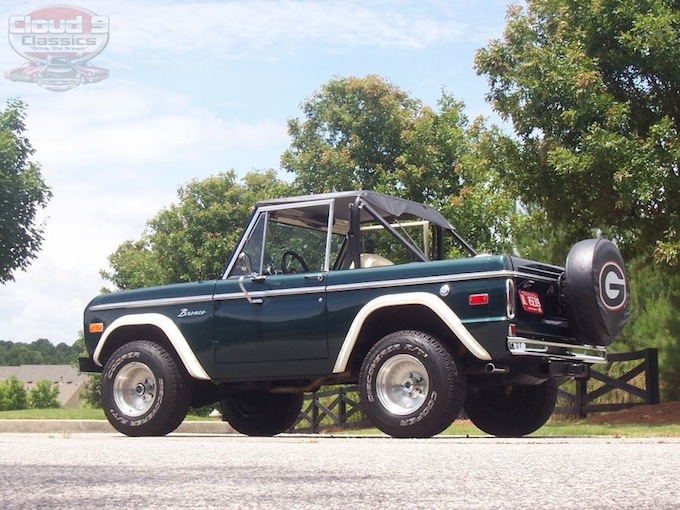 As I mentioned above this Emerald Green Metallic beauty was treated to a very nice, professional restoration about 8 years ago. According to the previous owner rust was not an issue along the body and it was stripped to bare metal before the Emerald Green paint was professionally applied. The Bronco was originally Wimbledon White but I think you will agree that the color change was a great choice. I truly believe that the Bronco actually looks even better in person then it does in the pics. It was an overcast day and the paint glistens more in person. Body is extremely straight and panel gaps are excellent. The doors, which are a notorious issue on these Early Broncos close great and line up nice and flush to the rear quarter panels. When he did the restoration he replaced the Chrome Trim around the body line which is part of the Sport Package. This Bronco appears to have been an original Ranger package which offers the Sport Trim plus a few other items originally that have been changed at restoration. The Wimbledon white Fender flares are a great accent. All of the chrome, bumpers, weatherstripping and glass are in great condition. The glass is all tinted. The original spare tire holder works great and as you can see the previous owner was a Georgia Bull Dog fan ( GO DAWGS!!). This can be easily changed to your favorite team or just a Bronco spare tire cover. Previous owner added a nice set of fog light to the front bumper as well as a nice tow hitch. Overall the body is in near flawless condition!!! I will not say it is perfect because there may be a rock chip or two that I missed but it is truly in amazing condition and I am confident the next owner will be thrilled. Here is a photo tour of the body: