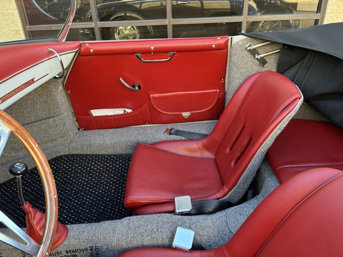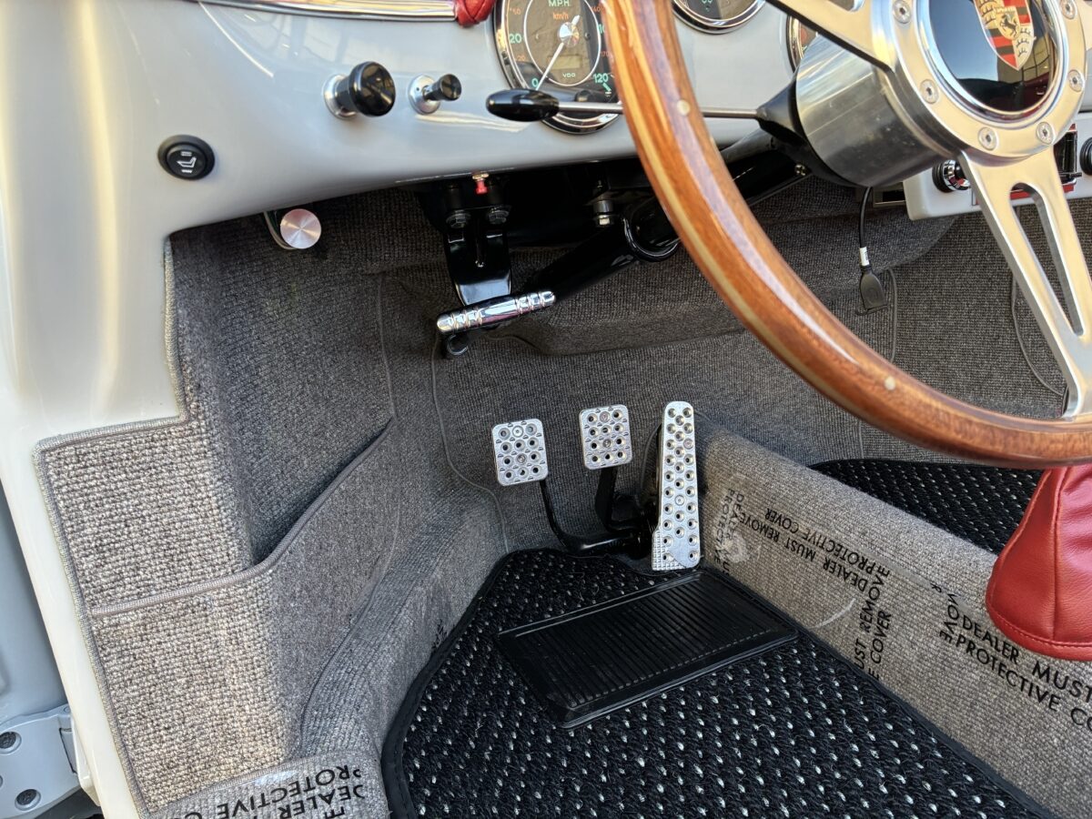 Accenting the stunning Chalk exterior is an equally stunning Cardinal Red colored interior. The Speedster seats are very comfortable. Matching dash pad and passenger side grab handle. Period correct VDO gauges with GPS Speedometer and a digital odometer allow the driver to monitor the speed and performance of this air cooled Speedster. Beautiful woodgrain steering wheel with a vintage style turn signal lever adds to the authenticity. This 356 is also optioned with heated seats for both driver and passenger for those of you in cooler climates. Really cool Retrosound Bluetooth stereo has the look of old with all the modern features including microphone mounted on dash for hands free phone calls. This one has the Parking brake mounted under dash to make it even more authentic than most replicas. Sporty Aluminum Race pedals were also added. Shelf pad behind the front seats. Authentic Light Gray colored German Square carpeting and a custom set of Black/Gray coco mats finish out the interior.