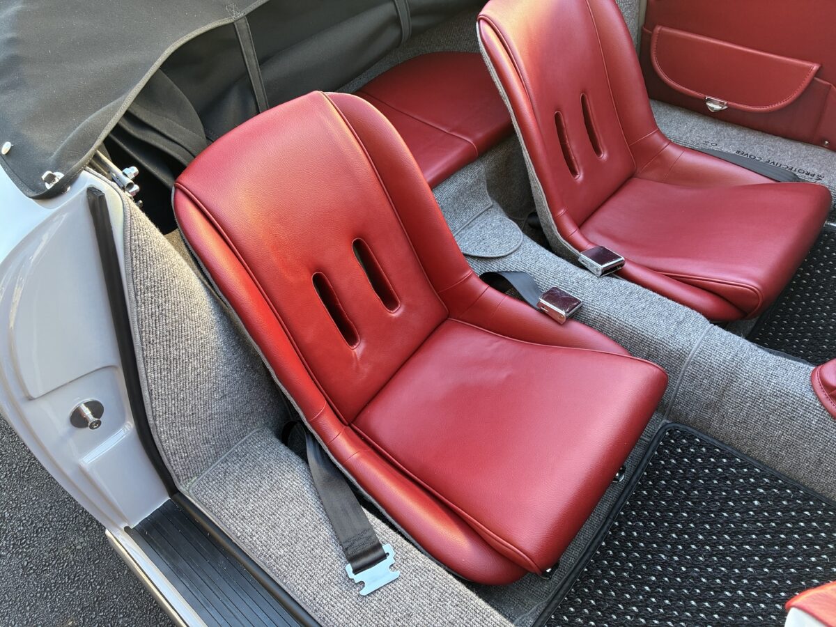 We had this one built for our inventory in a very popular color used on newer Porsches called Chalk. This color has a truly vintage feel and suits this car beautifully and the fit and finish most likely exceeds the original.. The body is adorned with Porsche badging on the nose, rear and dash. Paint and body are essentially flawless. This one has the beehive style taillights with Spyder Shine down license plate light.Front driving lights really help when driving at night on poorly lit streets. GT louvered engine lid allows more air flow into the engine bay. Mesh headlight grilles look really cool. Great stance and nicely accented by the black powder coated Vintage 190 wheels with polished drum skin covers.