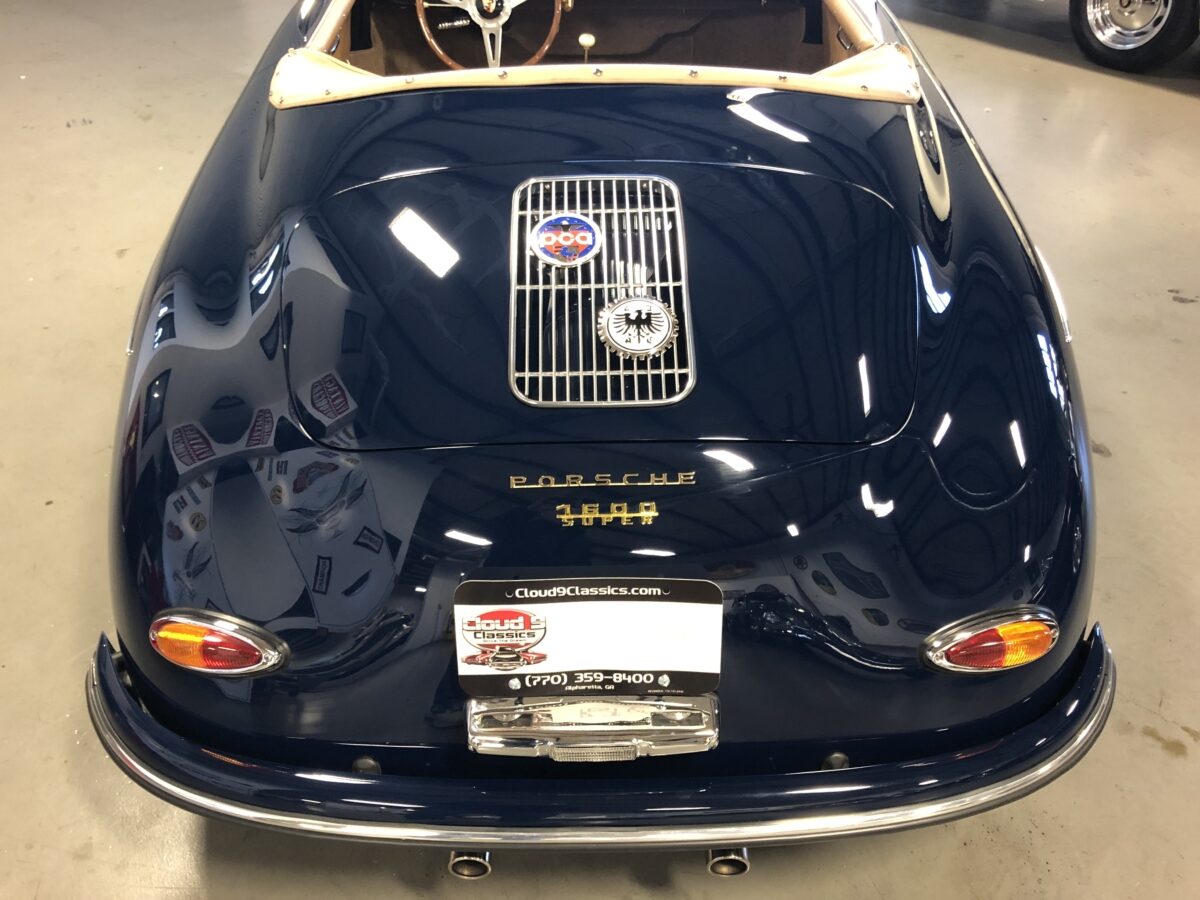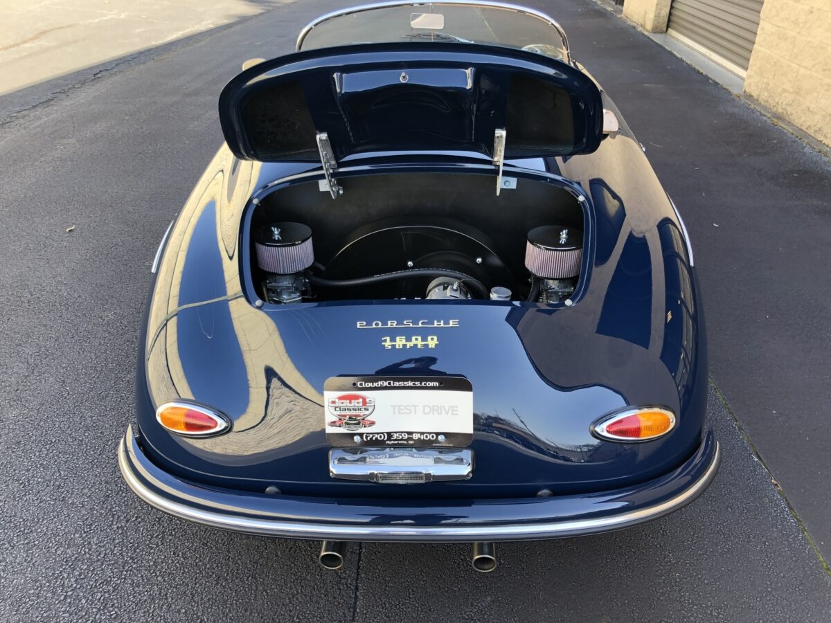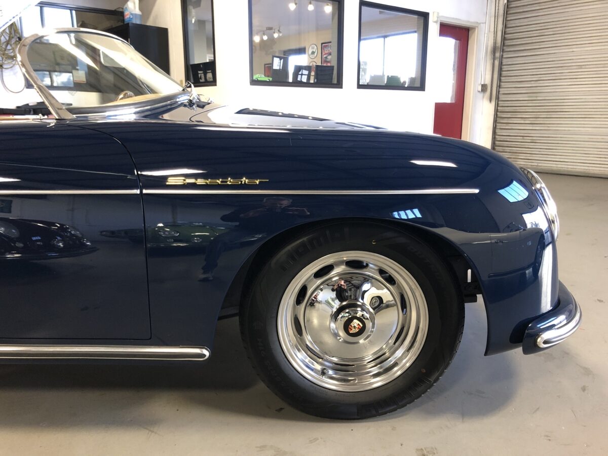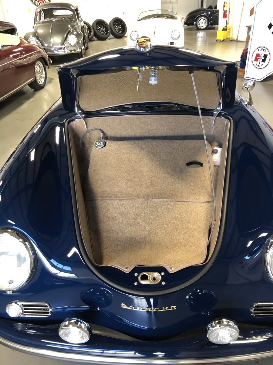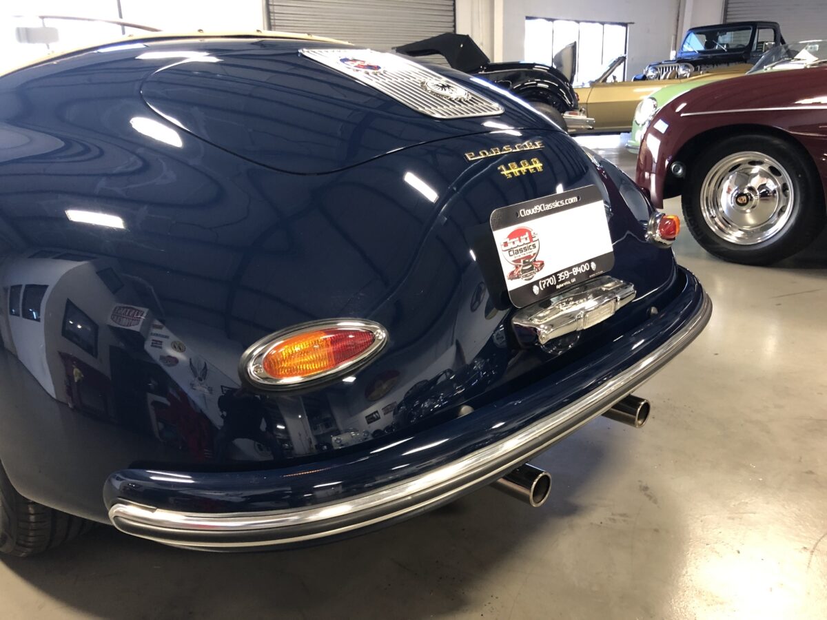 We had this one built for our inventory in an original 356 color called Bali Blue and the fit and finish most likely exceeds the original.. The body is adorned with Porsche badging on the nose, rear and dash. Paint and body are essentially flawless. This one has the European amber/red tear drop taillights. Front driving lights really help when driving at night on poorly lit streets.