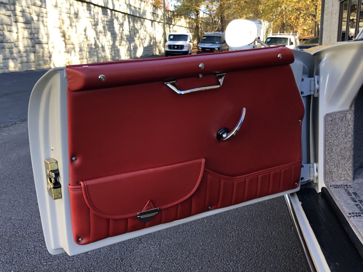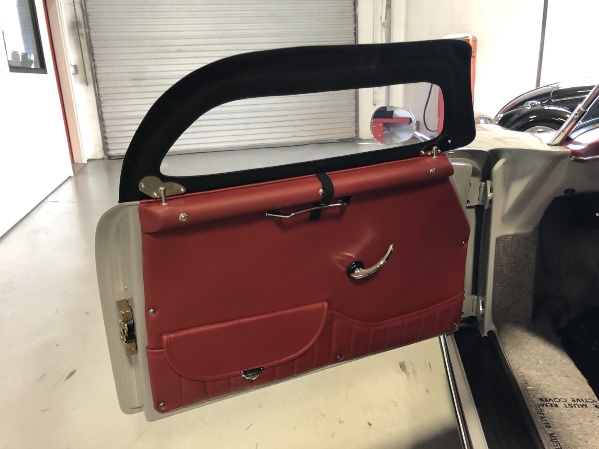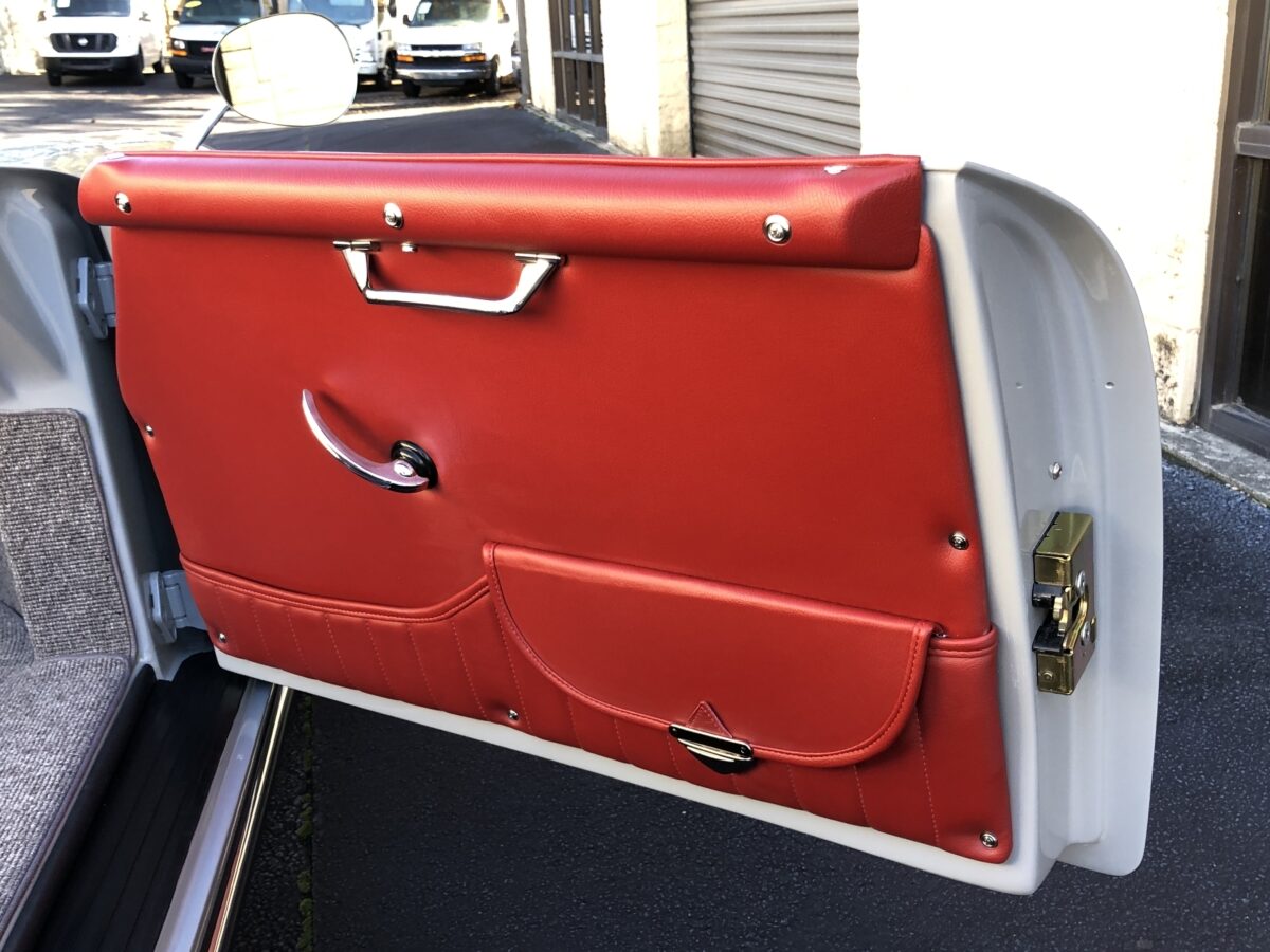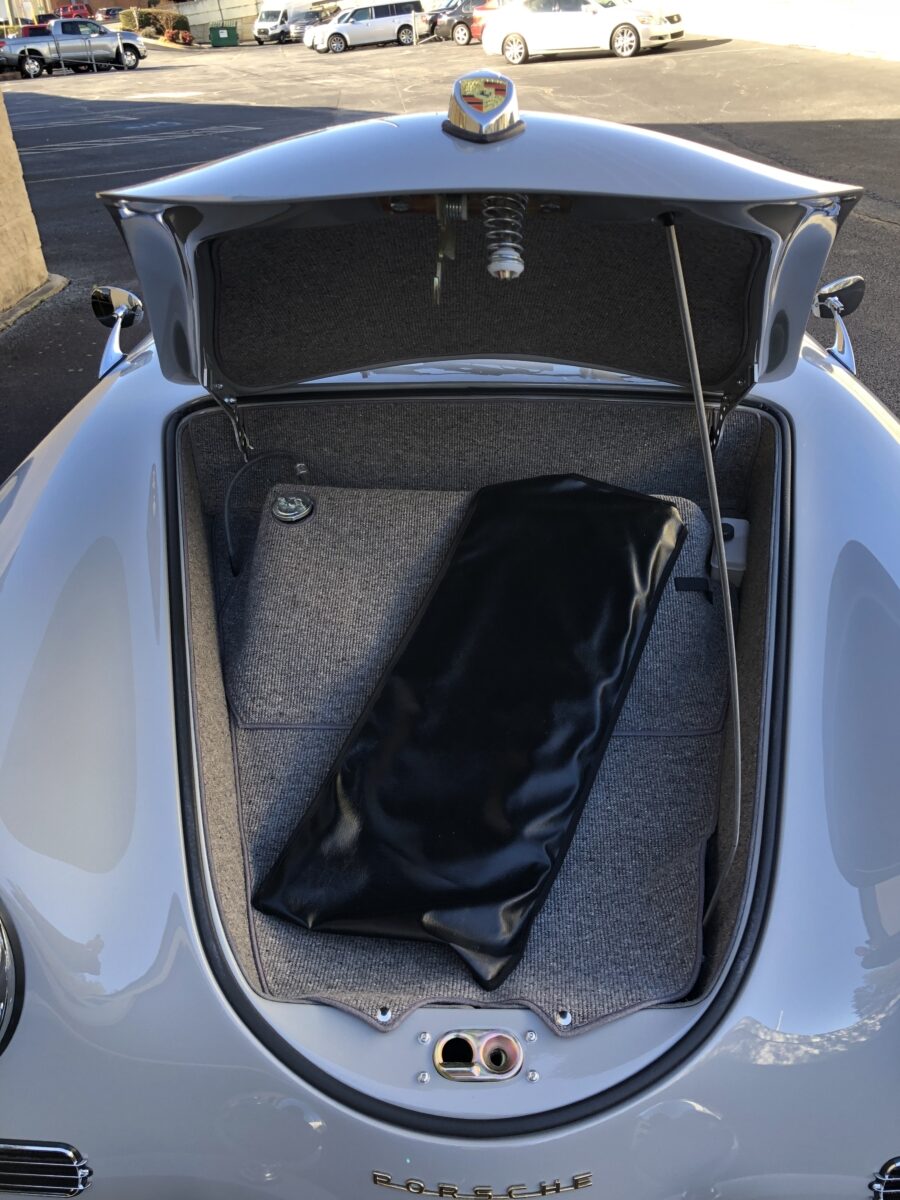Accenting the stunning Chalk exterior is an equally stunning Cardinal Red colored interior. The Speedster seats are very comfortable. Matching dash pad and passenger side grab handle. Period correct VDO gauges with GPS Speedometer and a digital odometer allow the driver to monitor the speed and performance of this air cooled Speedster. Beautiful woodgrain steering wheel with a vintage style turn signal lever adds to the authenticity. This 356 is also optioned with heated seats for both driver and passenger for those of you in cooler climates. Really cool Retrosound Bluetooth stereo has the look of old with all the modern features including microphone mounted on dash for hands free phone calls. This one has the Parking brake mounted under dash to make it even more authentic than most replicas. Sporty Aluminum Race pedals were also added. Shelf pad behind the front seats. Authentic Light Gray colored German Square carpeting and a custom set of Black/Gray coco mats finish out the interior.