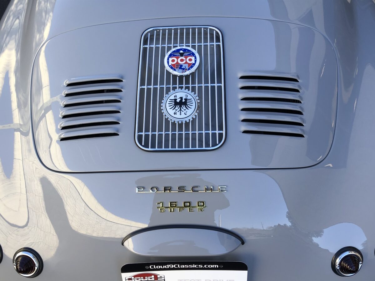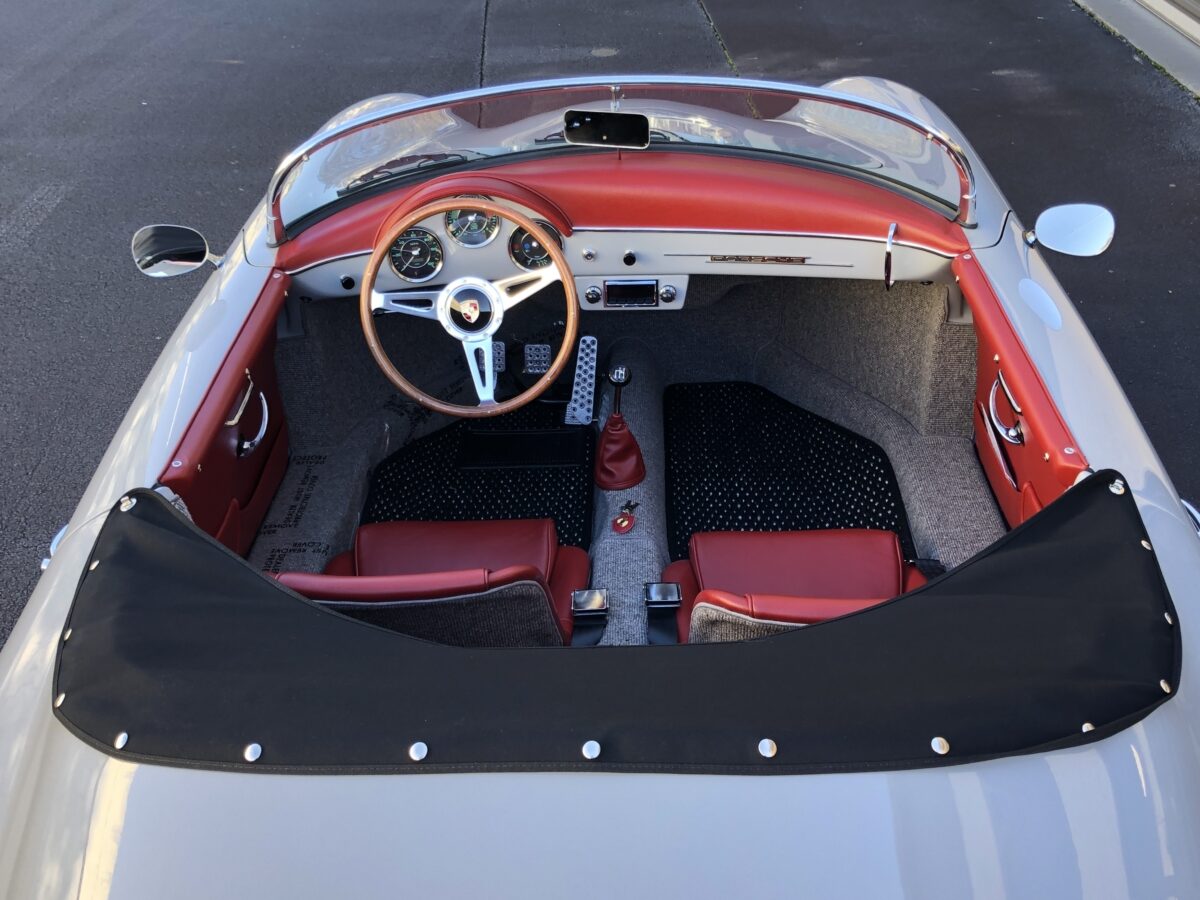 We had this one built for our inventory in a very popular color used on newer Porsches called Chalk. This color has a truly vintage feel and suits this car beautifully and the fit and finish most likely exceeds the original.. The body is adorned with Porsche badging on the nose, rear and dash. Paint and body are essentially flawless. This one has the beehive style taillights with Spyder Shine down license plate light.Front driving lights really help when driving at night on poorly lit streets. GT louvered engine lid allows more air flow into the engine bay. Mesh headlight grilles look really cool. Great stance and nicely accented by the black powder coated Vintage 190 wheels with polished drum skin covers.