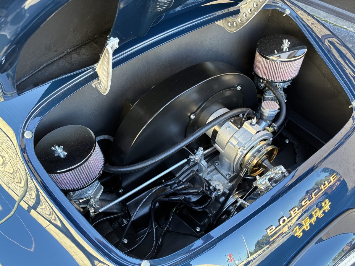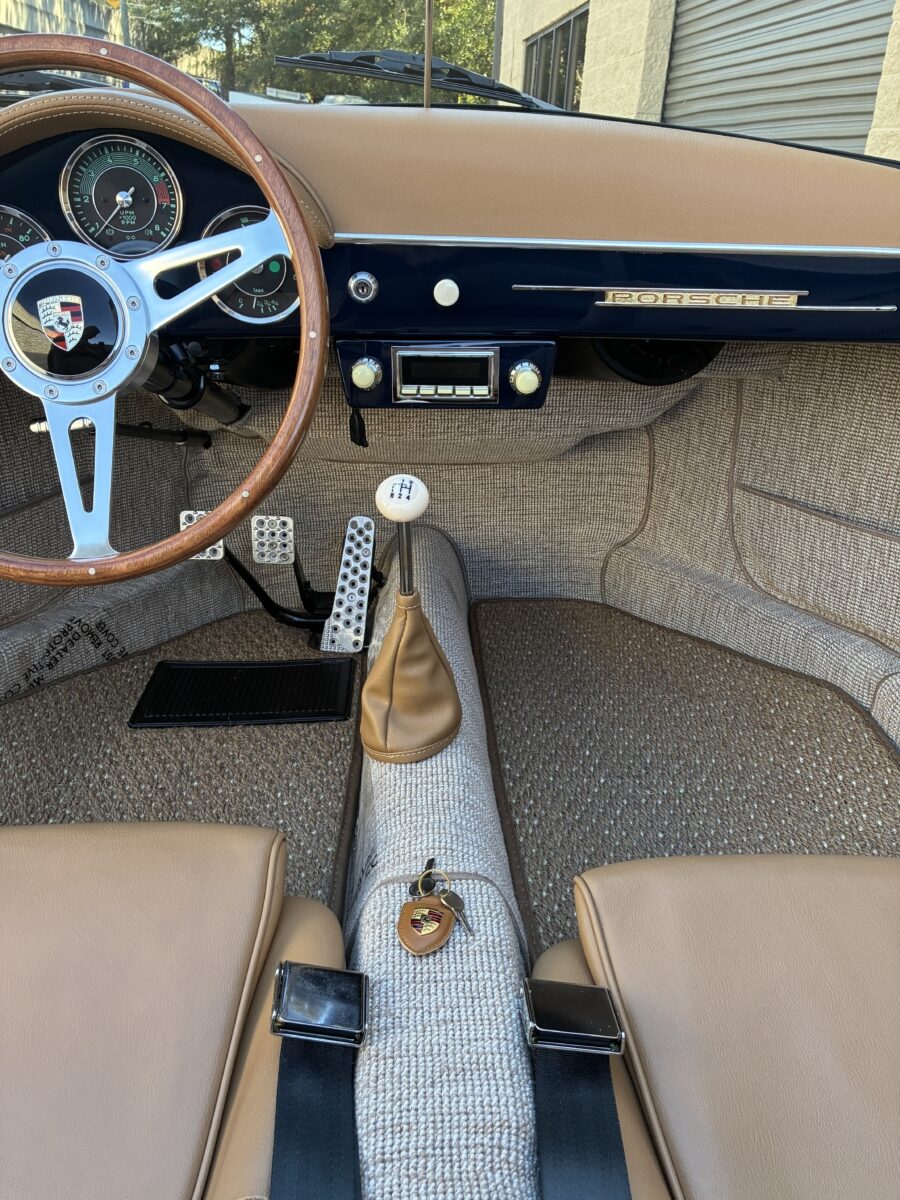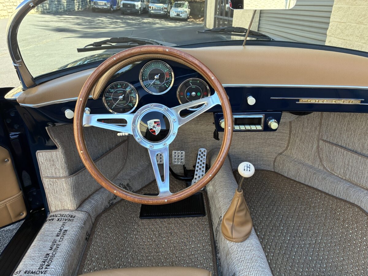 We had this one built for our inventory in an original 356 color called Bali Blue and the fit and finish most likely exceeds the original.. The body is adorned with Porsche badging on the nose, rear and dash. Paint and body are essentially flawless. This one has the beehive taillights with a Spyder Shine down license plate light. Front driving lights really help when driving at night on poorly lit streets. It also has the nipple emblem hubcaps.