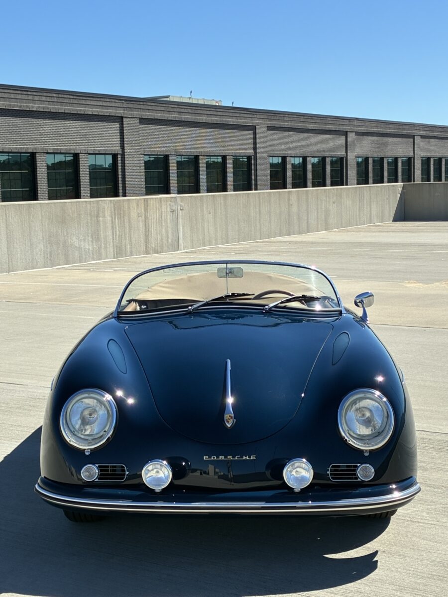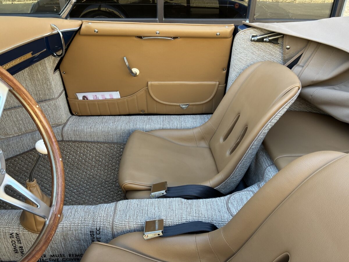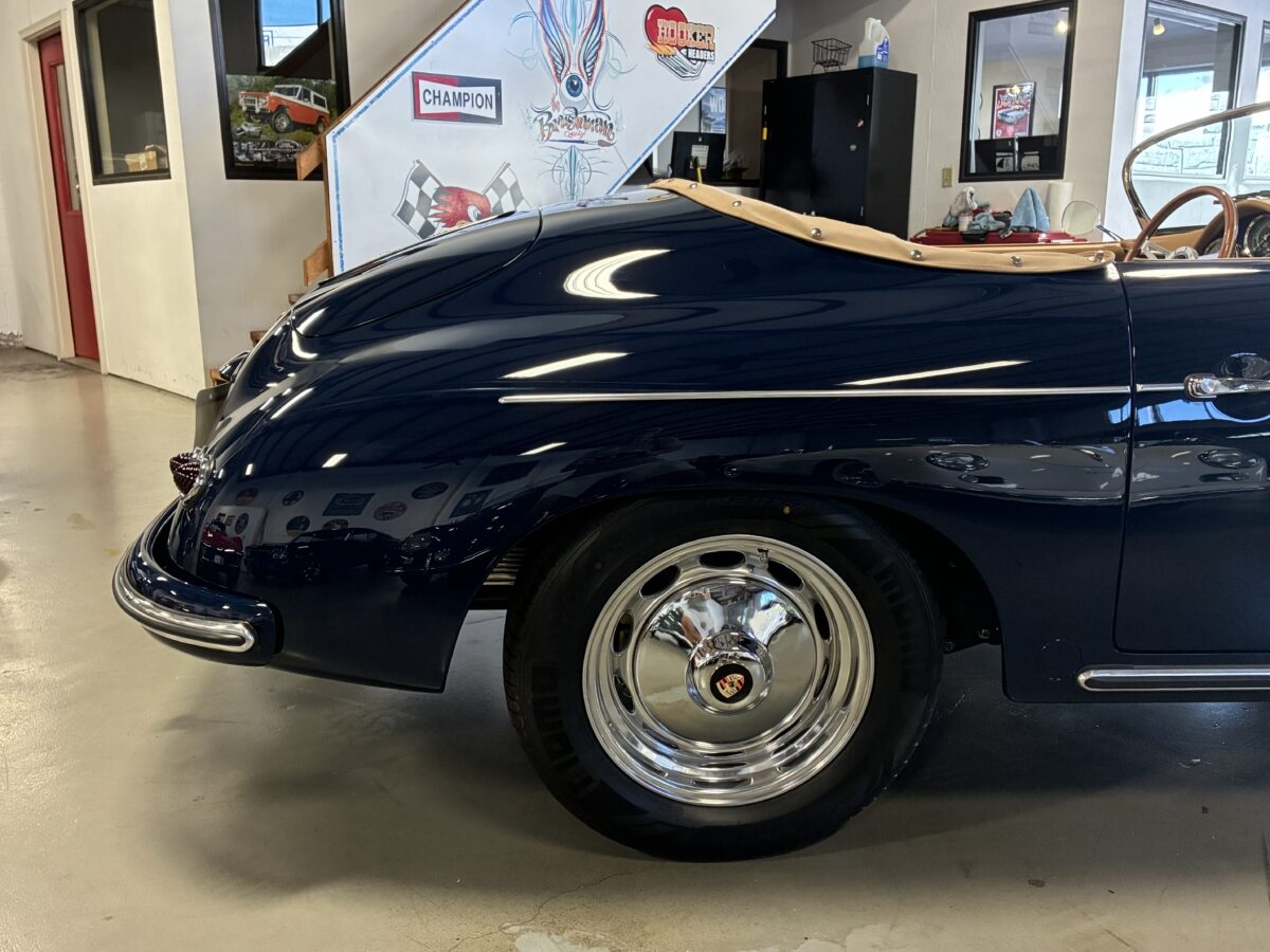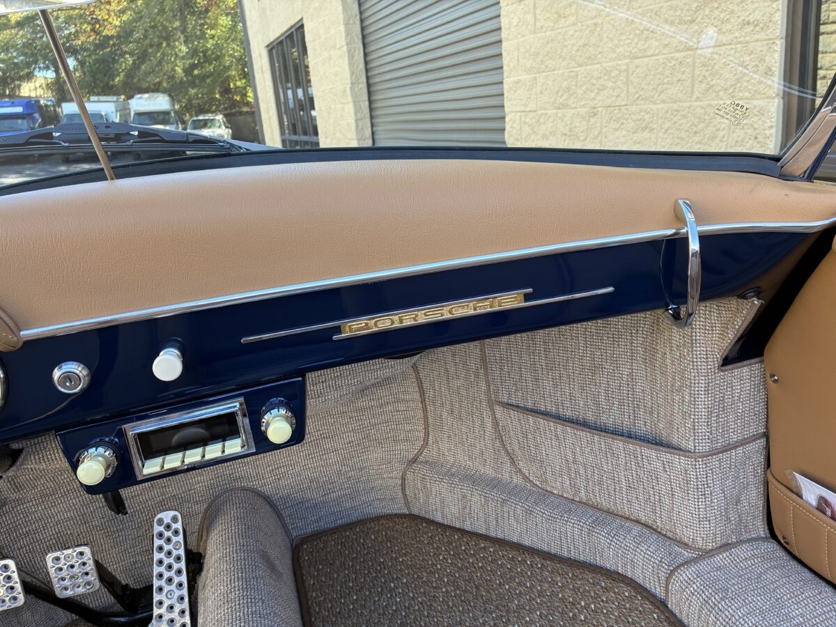 We had this one built for our inventory in an original 356 color called Bali Blue and the fit and finish most likely exceeds the original.. The body is adorned with Porsche badging on the nose, rear and dash. Paint and body are essentially flawless. This one has the beehive taillights with a Spyder Shine down license plate light. Front driving lights really help when driving at night on poorly lit streets. It also has the nipple emblem hubcaps.