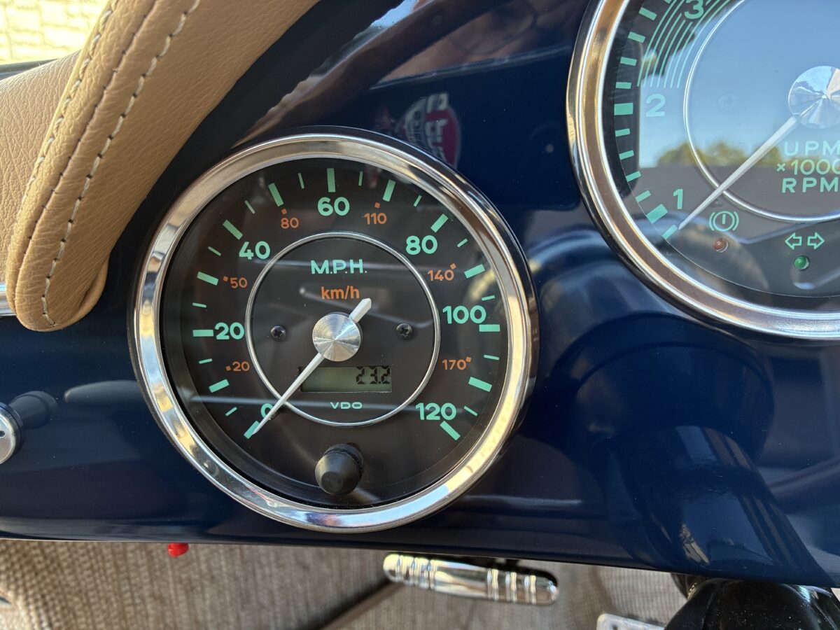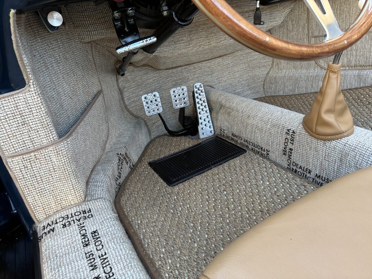 Complementing the Bali Blue exterior is an equally stunning tan colored interior. The Speedster seats are very comfortable. Beautiful Oatmeal colored German Square weave carpeting. Matching dash pad and passenger side grab handle. Period correct VDO gauges with GPS Speedometer and a digital odometer allow the driver to monitor the speed and performance of this air cooled Speedster. Beautiful woodgrain steering wheel with a vintage style turn signal lever adds to the authenticity. This 356 is also optioned with heated seats for both driver and passenger for those of you in cooler climates. This one has the Parking brake mounted under dash to make it even more authentic than most replicas. Shelf pad behind the front seats. Retrosound Bluetooth Stereo looks cool and sounds good and allows hands freephone usage. A custom set of coco mats finishes out the simply gorgeous interior!!!