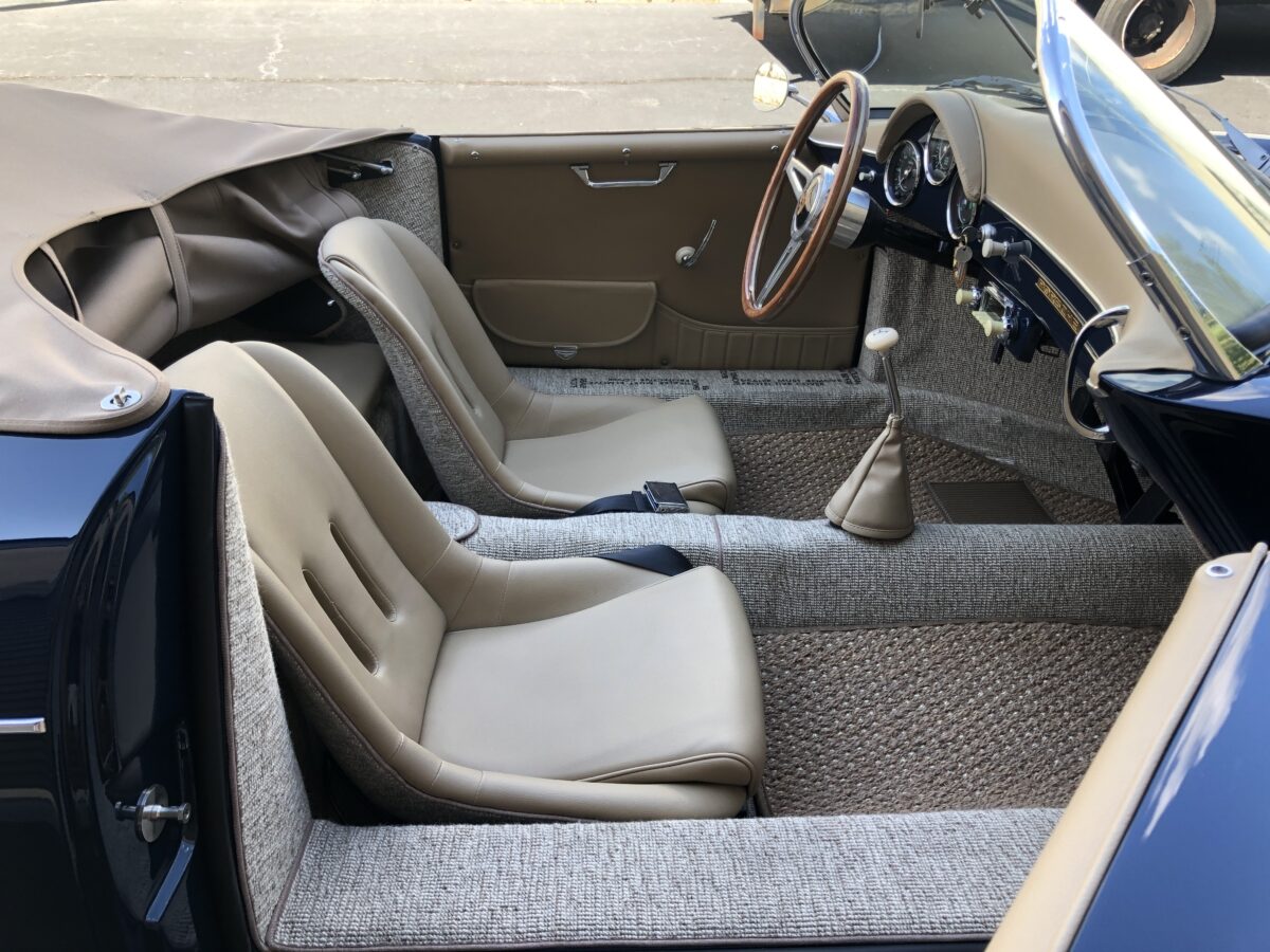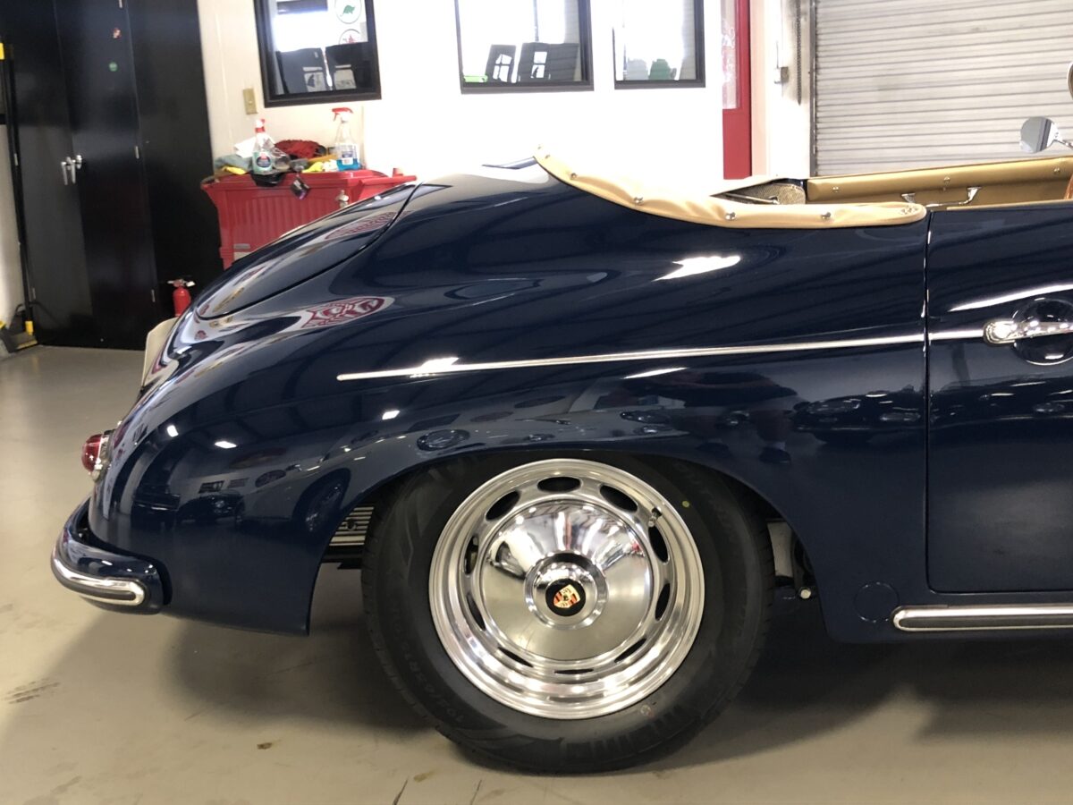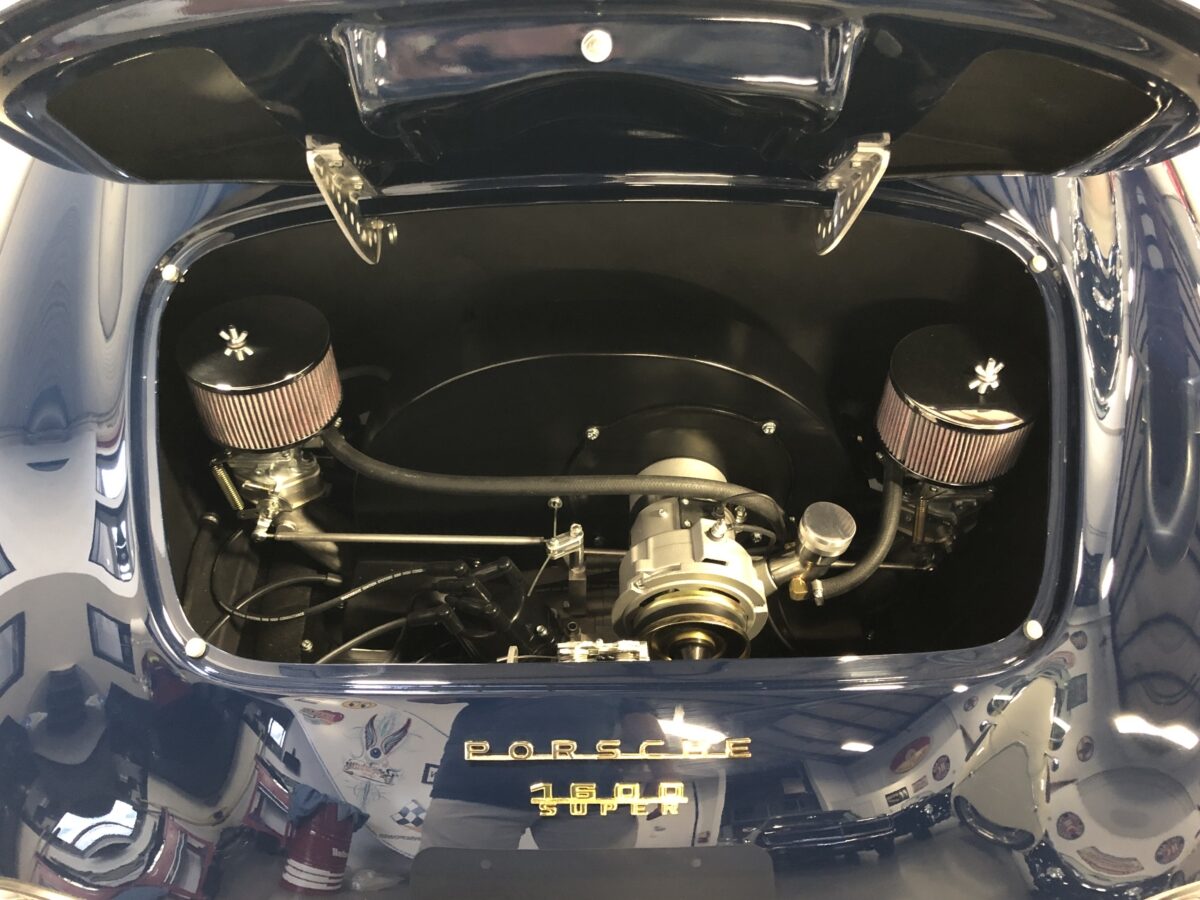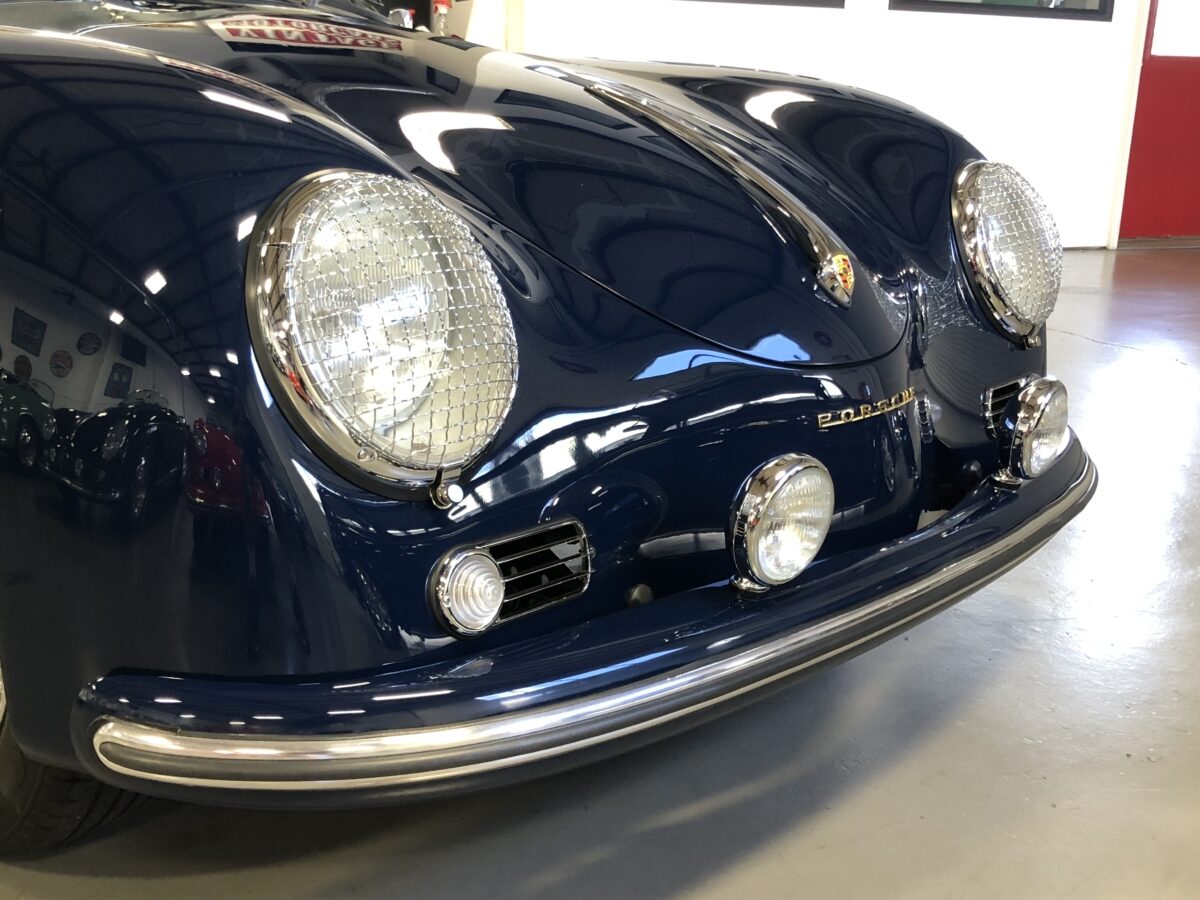 We had this one built for our inventory in an original 356 color called Bali Blue and the fit and finish most likely exceeds the original.. The body is adorned with Porsche badging on the nose, rear and dash. Paint and body are essentially flawless. This one has the tear drop taillights. Front driving lights really help when driving at night on poorly lit streets. It also has the mesh headlight grille guards.