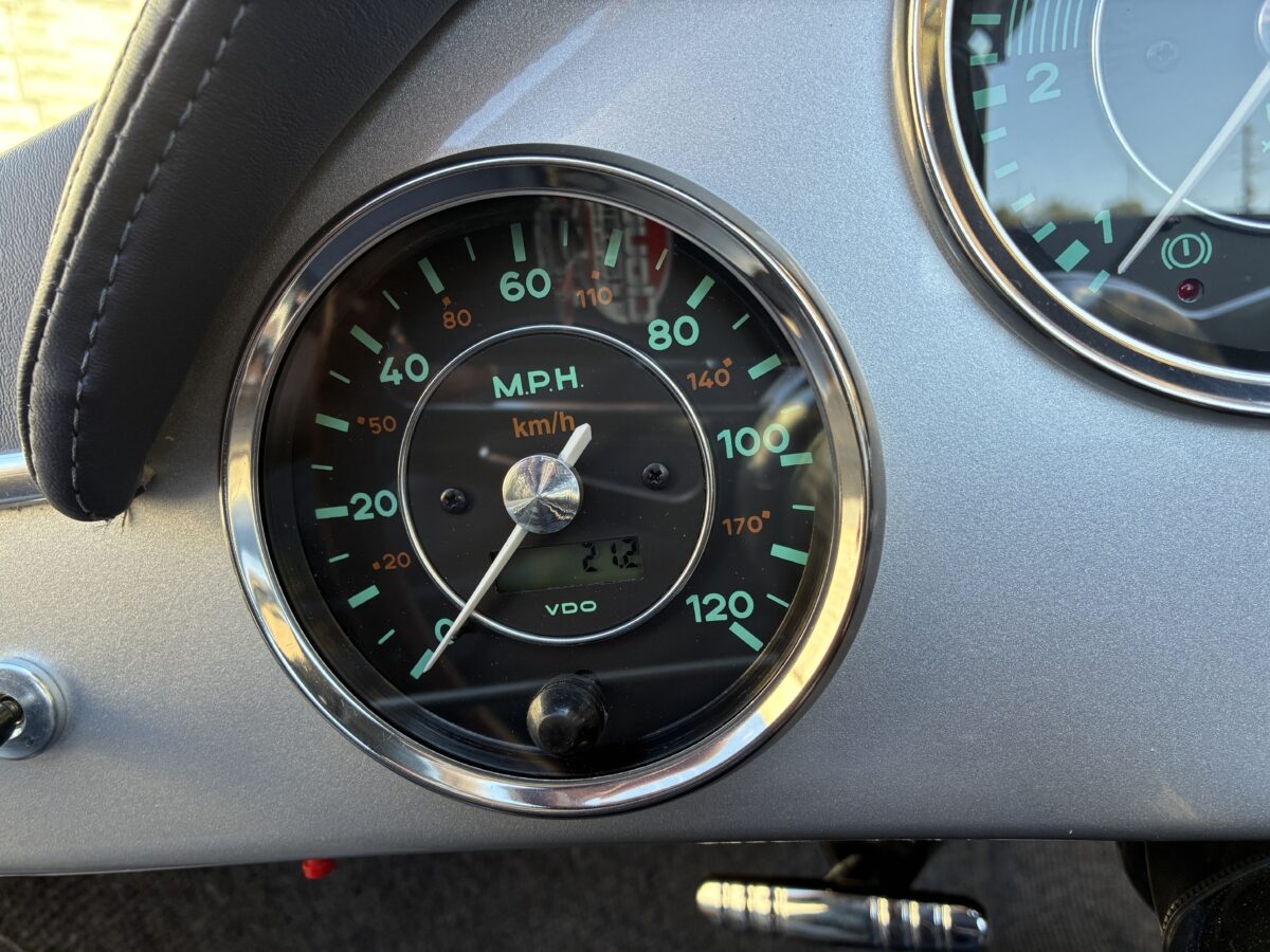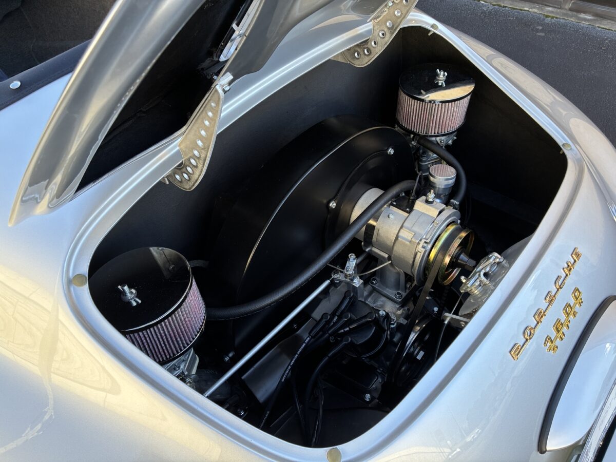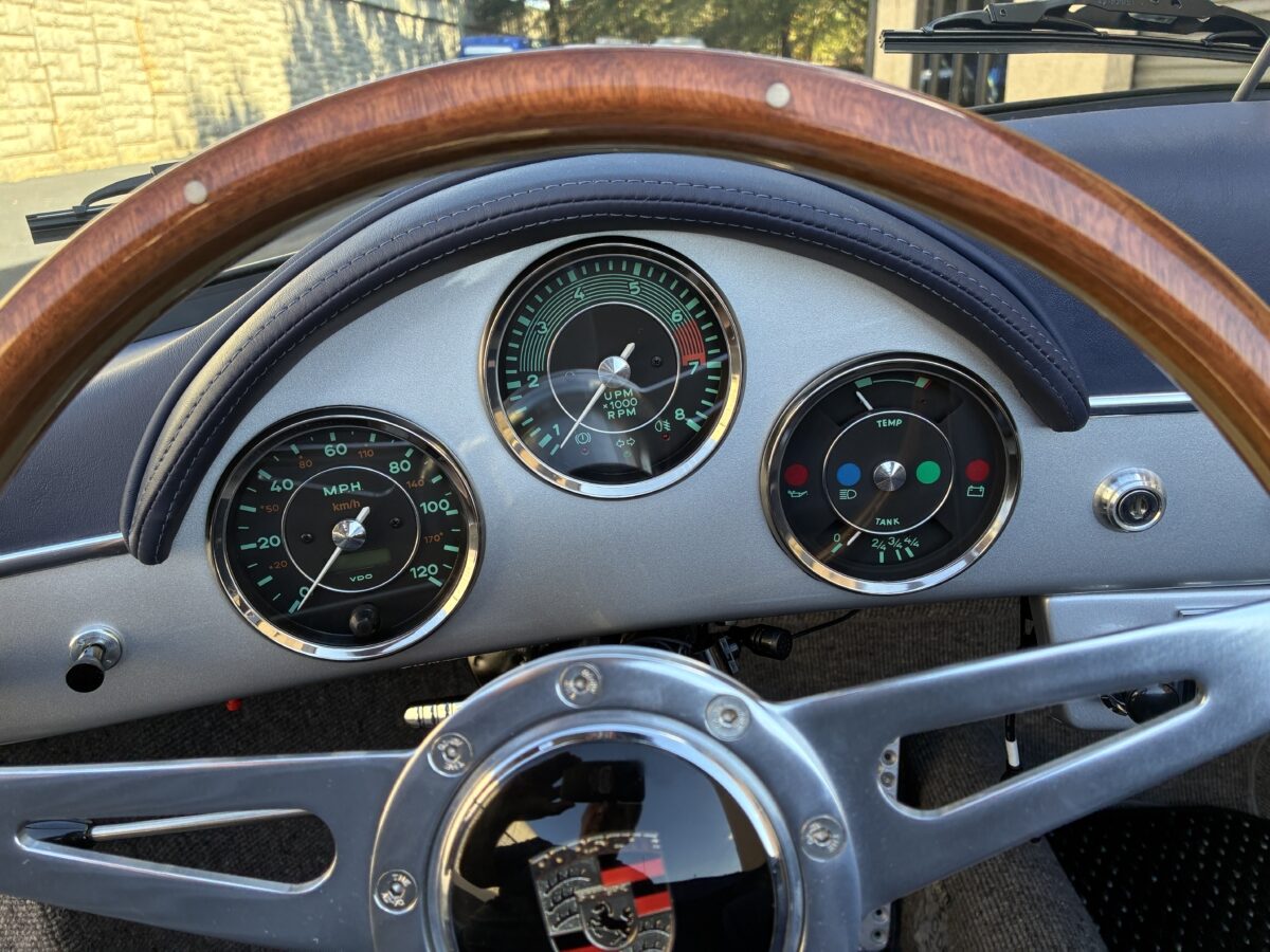 We had this one built for our inventory in a classic 356 color and the fit and finish most likely exceeds the original. The body is adorned with Porsche badging on the nose, rear and dash. Paint and body are essentially flawless. This one has the beehive styled tail lights with a Spyder shine down license plates. Front fog lights with amber lenses and a GT Louvered engine lid set this one off nicely.