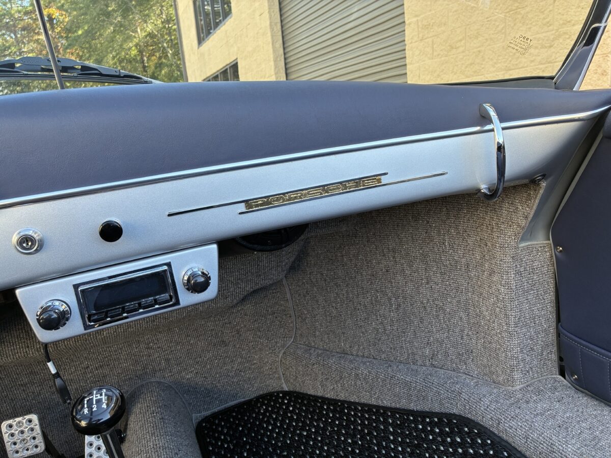 Complementing the glistening Silver Metallic exterior is an equally stunning navy blue colored interior. The Speedster seats are very comfortable. Beautiful Gray German Square weave carpeting lines the cabin. Matching dash pad and passenger side grab handle. Period correct VDO gauges with GPS Speedometer and a digital odometer allow the driver to monitor the speed and performance of this air cooled Speedster. Beautiful woodgrain steering wheel with a vintage style turn signal lever adds to the authenticity. Aluminum Race pedals add to the sporty look. This 356 is also optioned with heated seats for both driver and passenger for those of you in cooler climates. This one has the Parking brake mounted under dash to make it even more authentic than most replicas. Shelf pad behind the front seats. Retrosound Bluetooth Stereo looks cool and sounds good and allows hands freephone usage. A custom set of coco mats finishes out the simply gorgeous interior!!!