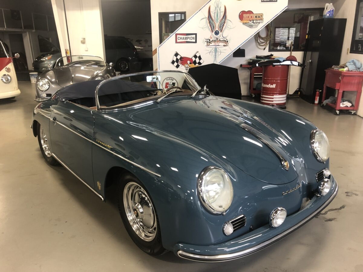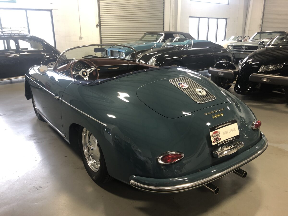 We sold this Speedster brand new to the first owner in June, 2024. Due to the need for funds for a new venture the owner decided the right thing to do was to sell the car. Unfortunate circumstances for him but great opportunity for the next lucky owner…maybe you!!!? This beauty was built in an original 356 color called Aquamarine Blue and the fit and finish most likely exceeds the original.. The body is adorned with Porsche badging on the nose, rear and dash. Paint and body are near flawless with just a few very tiny rock chips that have been touched up. This one has the tear drop taillights. Front driving lights really help when driving at night on poorly lit streets.