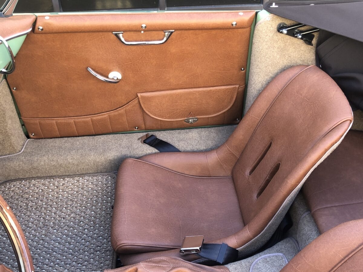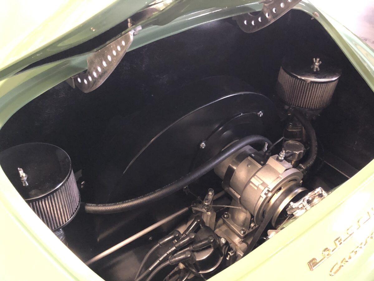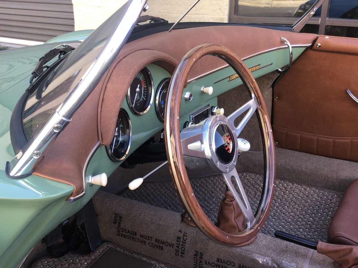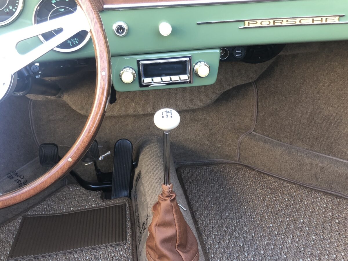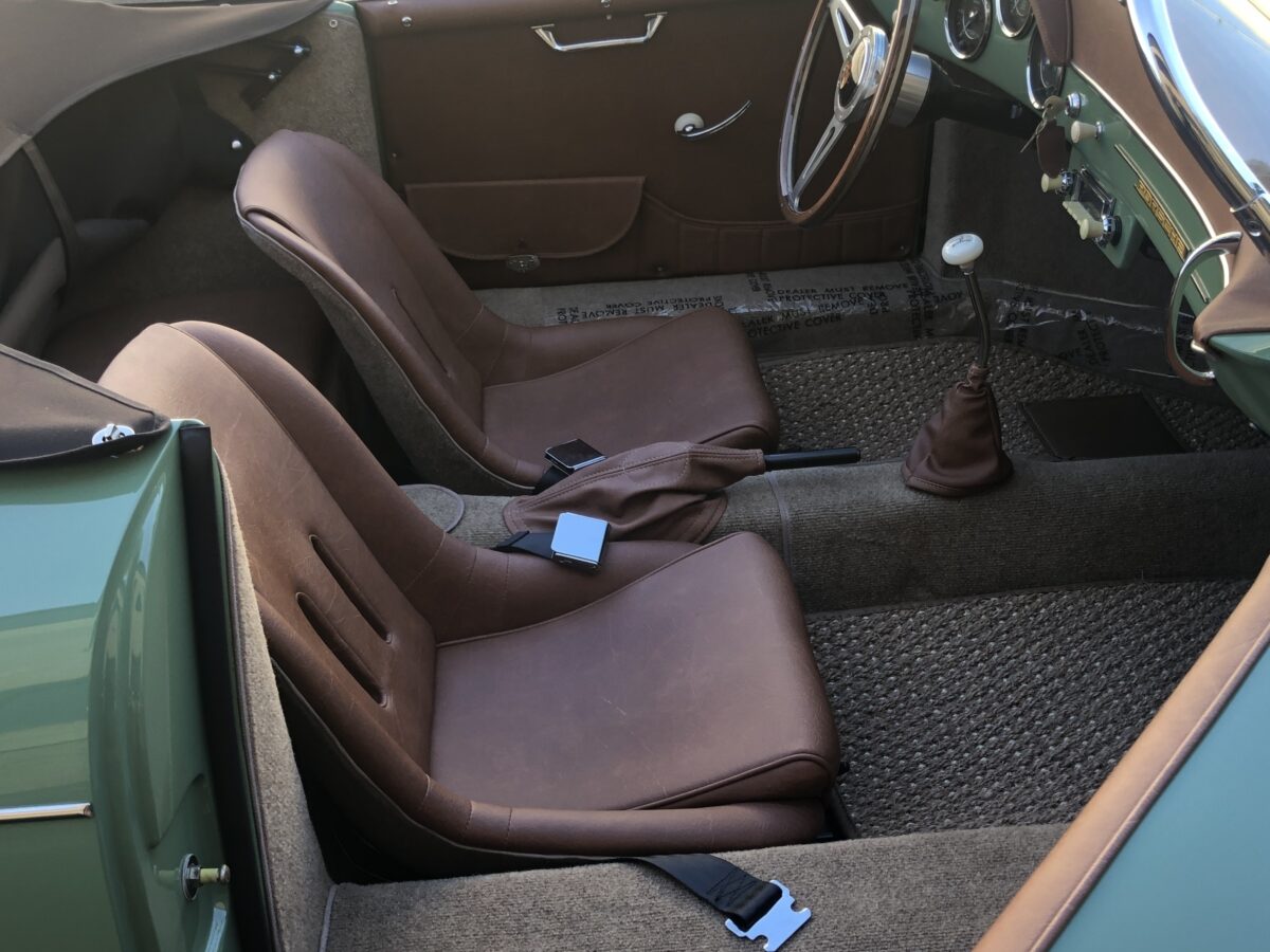 Complementing the Auratium Green exterior is an equally stunning Buck colored interior. The Speedster seats are very comfortable.. Matching dash pad and passenger side grab handle. Period correct VDO gauges with GPS Speedometer and a digital odometer allow the driver to monitor the speed and performance of this air cooled Speedster. Beautiful woodgrain steering wheel with a vintage style turn signal lever adds to the authenticity. This 356 is also optioned with heated seats for both driver and passenger for those of you in cooler climates. This one has the Retrosound Bluetooth stereo. Shelf pad behind the front seats.. Simply gorgeous interior!!!