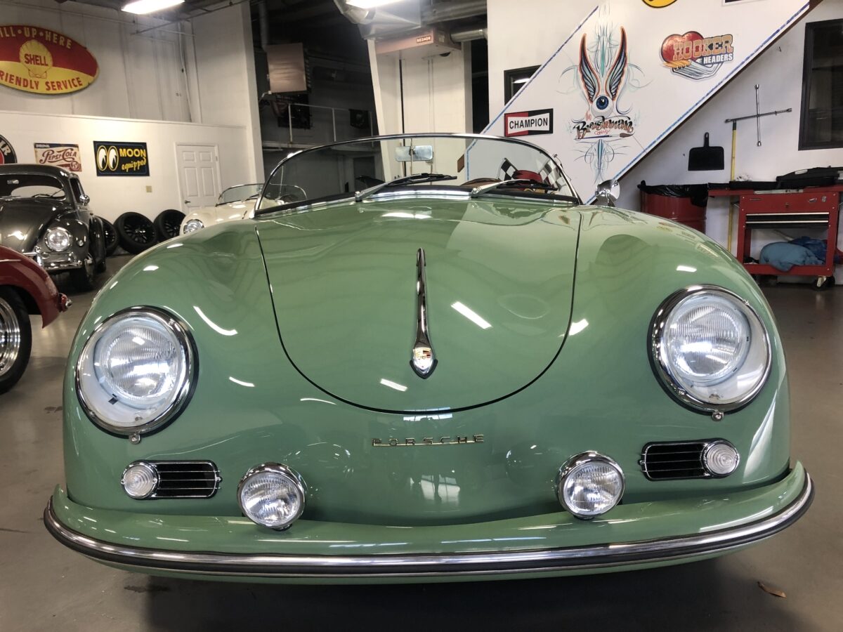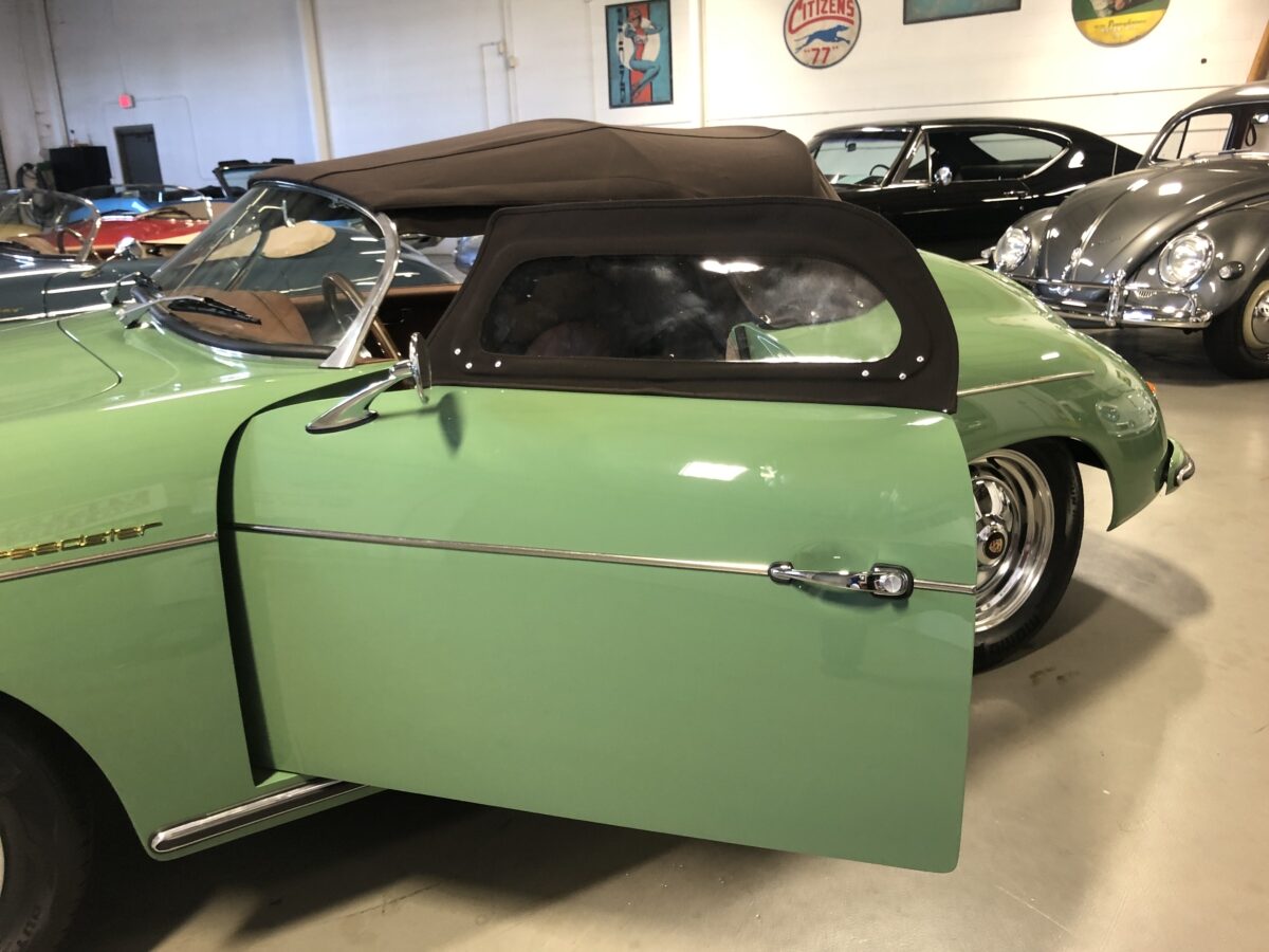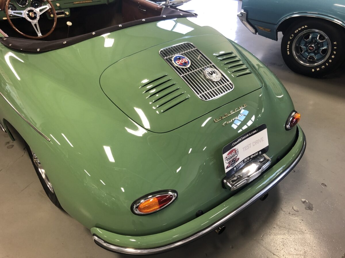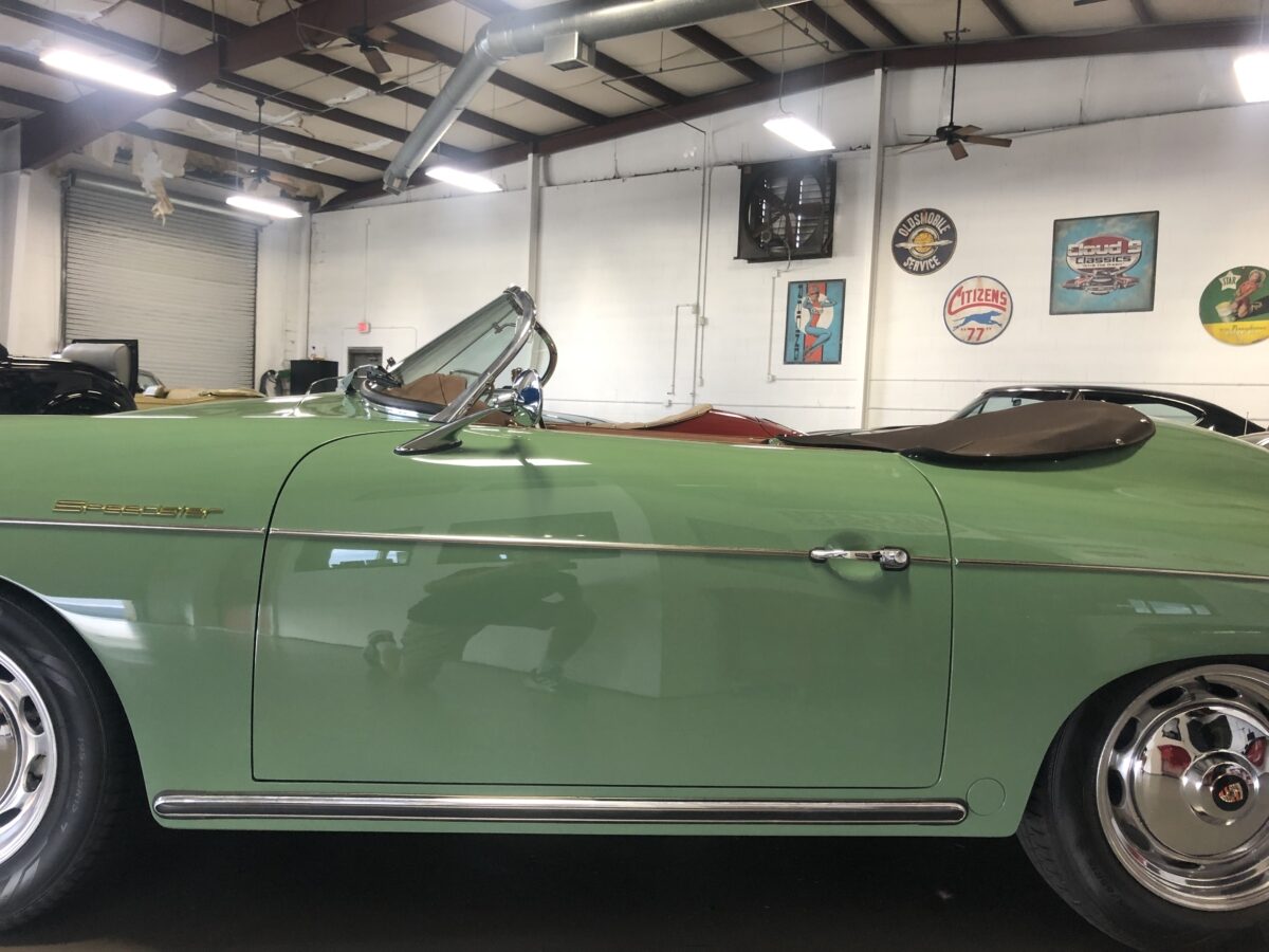 We originally had this one built for a gentleman in TX who picked out an original special order 356 color called Auratium Green with a Buck interior. Just a few weeks before the car was ready he notified that he was ill and could not move forward with the purchase. This was no issue because it was ordered in absolutely one of the best color combinations, so we put it on the market and sold it quickly in January, 2024 to a gentleman in Pennsylvania. This gentleman enjoyed the heck out of the car putting just over 2300 miles on it and recently decided he wanted a new toy and only had room for one so asked us to sell this one for him. Someone is going to be extremely lucky to buy this gorgeous Speedster….Maybe you?!!!