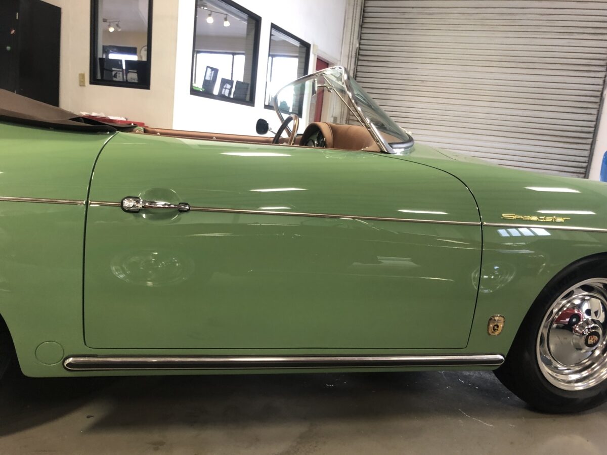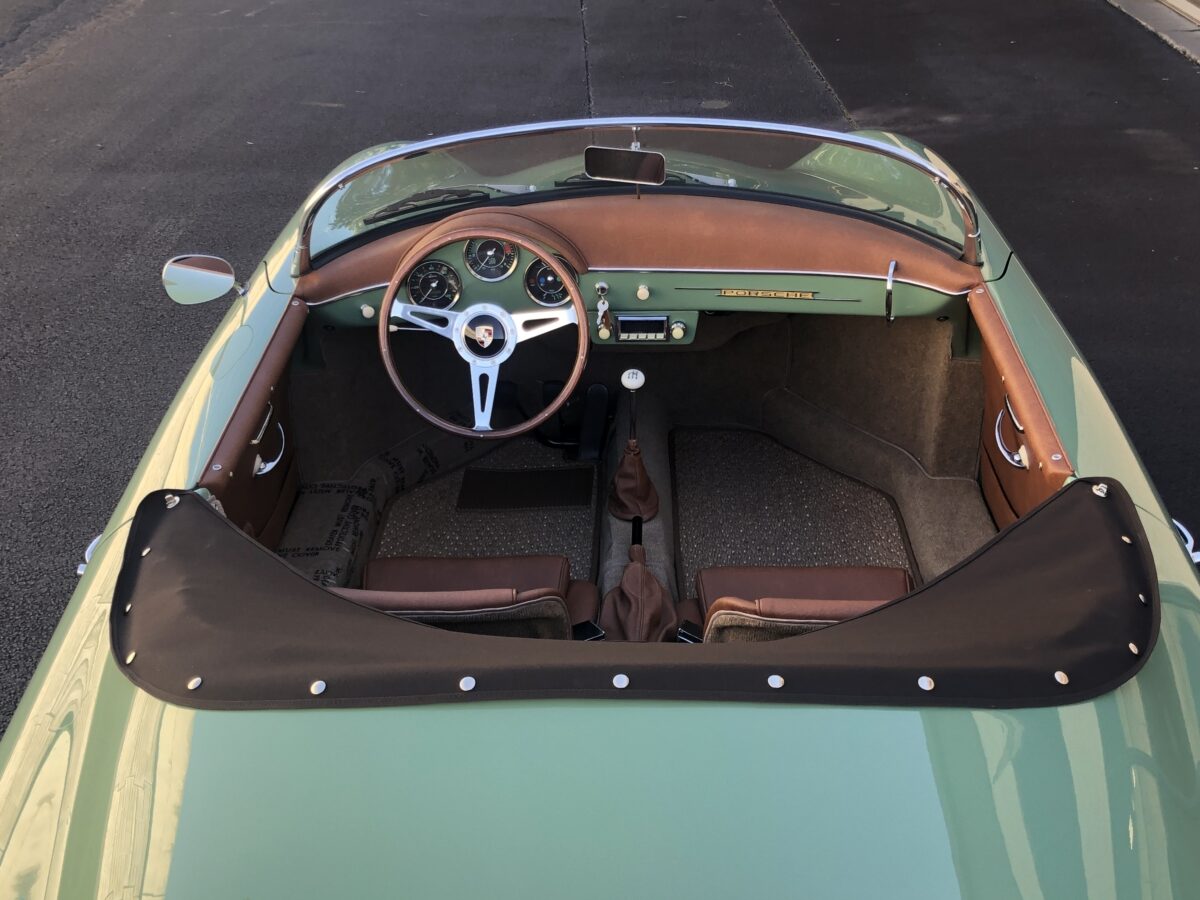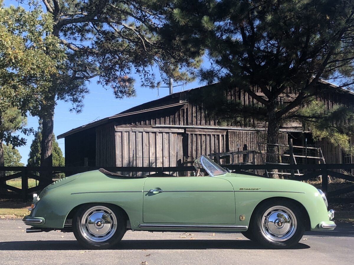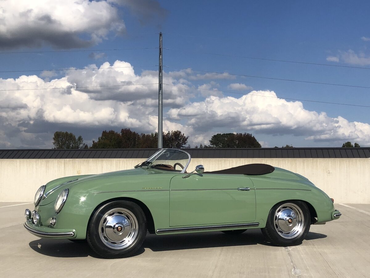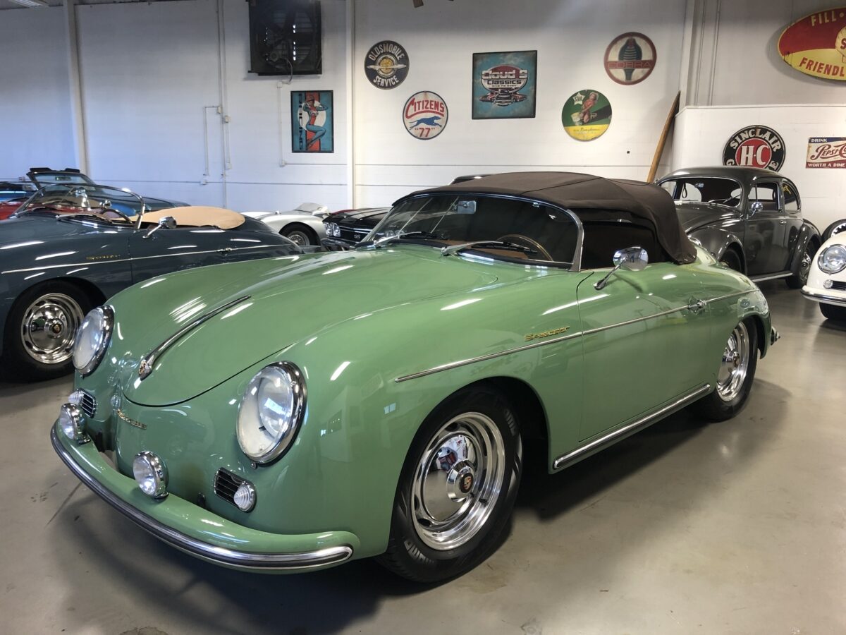We originally had this one built for a gentleman in TX who picked out an original special order 356 color called Auratium Green with a Buck interior. Just a few weeks before the car was ready he notified that he was ill and could not move forward with the purchase. This was no issue because it was ordered in absolutely one of the best color combinations, so we put it on the market and sold it quickly in January, 2024 to a gentleman in Pennsylvania. This gentleman enjoyed the heck out of the car putting just over 2300 miles on it and recently decided he wanted a new toy and only had room for one so asked us to sell this one for him. Someone is going to be extremely lucky to buy this gorgeous Speedster….Maybe you?!!!